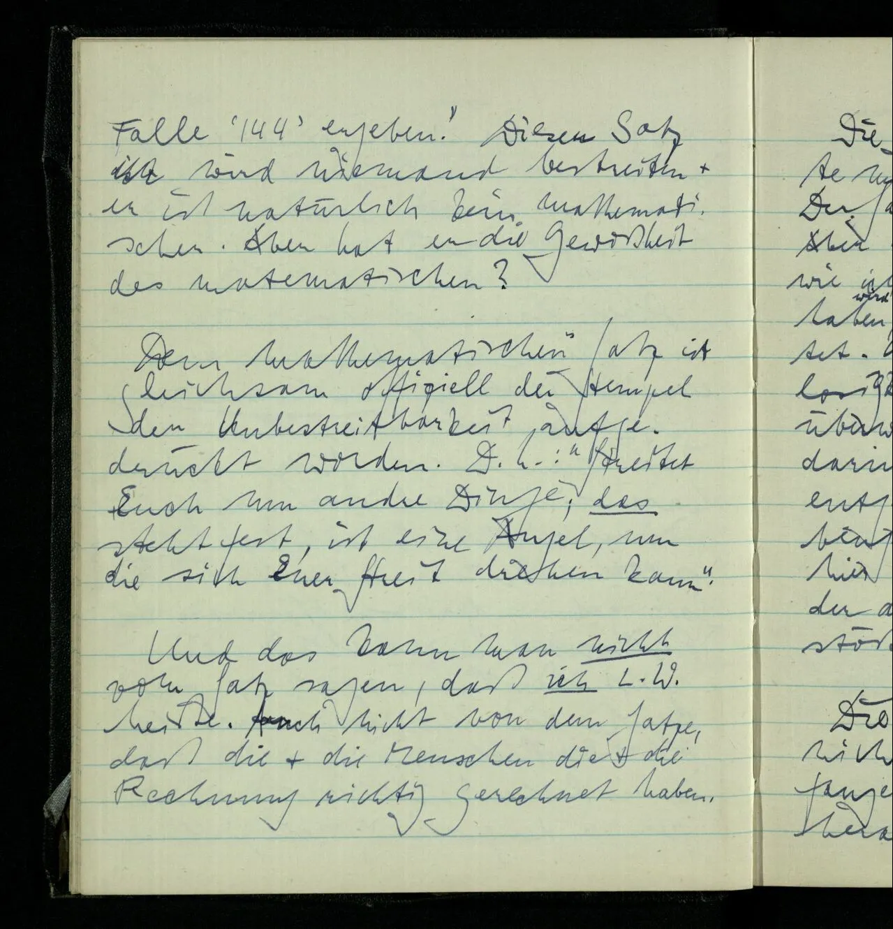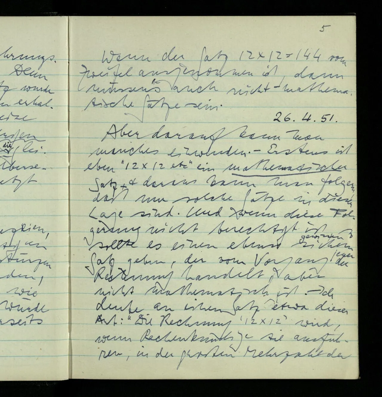 26.04.1951 Aber darauf kann man manches einwenden. – Erstens ist eben “12 × 12 etc.” ein mathematischer Satz & daraus kann man folgern, daß nur solche Sätze in dieser Lage sind. Und wenn diese Folgerung nicht berechtigt ist, so sollte es einen ebenso sichern Satz geben, der vom Vorgang der Rechnung handelt, aber nicht mathematisch ist. – Ich denke an einen Satz etwa dieser Art: “Die Rechnung ‘12 × 12’ wird, wenn Rechenkundige sie ausführen, in der großen Mehrzahl der Fälle ‘144’ ergeben.” Diesen Satz wird niemand bestreiten niemand bestreiten & er ist natürlich kein mathematischer. Aber hat er die Gewißheit des mathematischen?