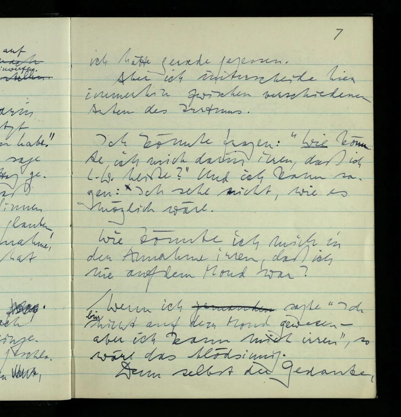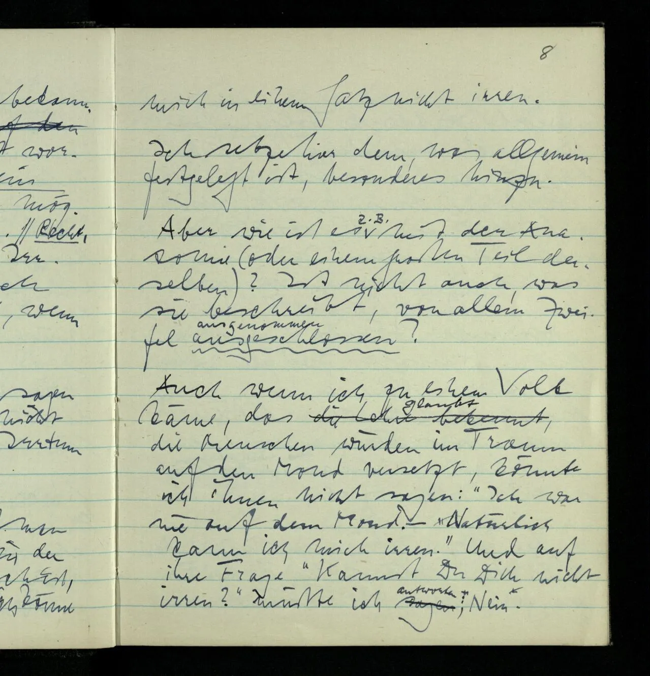 Auch wenn ich zu einem Volk käme, das glaubt, die Menschen würden im Traum auf den Mond versetzt, könnte ich ihnen nicht sagen: “Ich war nie auf dem Mond. – Natürlich kann ich mich irren.” Und auf ihre Frage “Kannst Du Dich nicht irren?” müßte ich antworten: Nein.