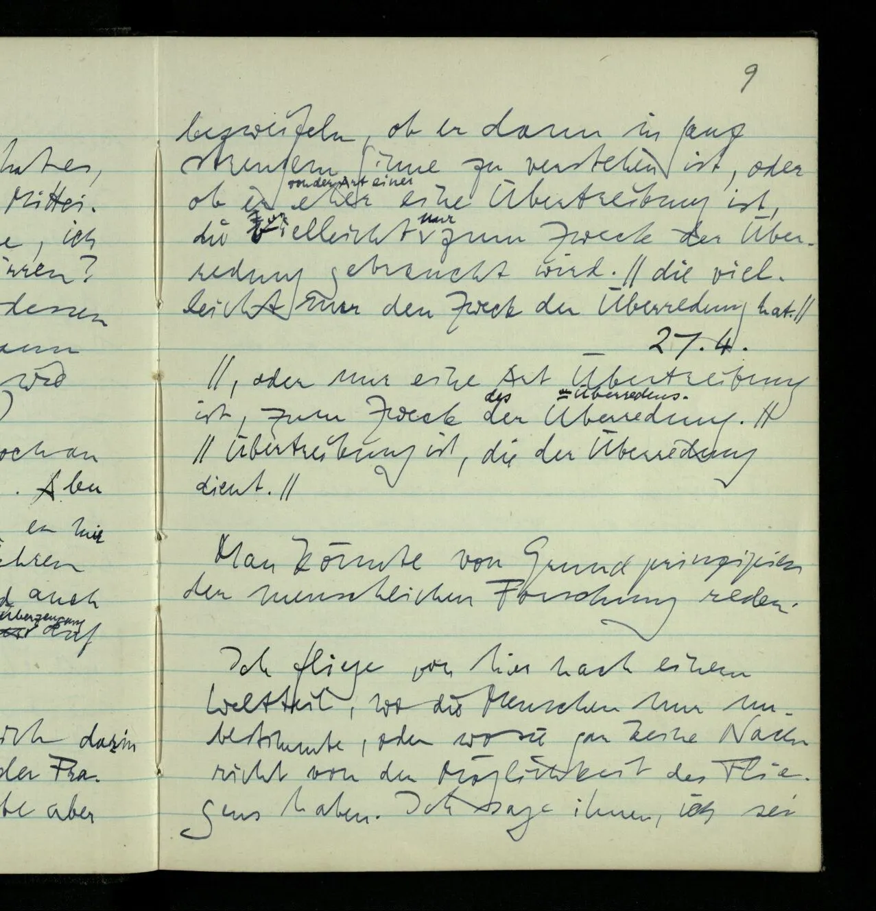Ich fliege von hier nach einem Weltteil, wo die Menschen nur unbestimmte, oder wo sie gar keine Nachricht von der Möglichkeit des Fliegens haben. Ich sage ihnen, ich sei soeben von … zu ihnen geflogen. Sie fragen mich, ob ich mich irren könnte. – Sie haben offenbar eine falsche Vorstellung davon, wie die Sache vor sich geht. (Wenn ich in eine Kiste gepackt würde, wäre es möglich, daß ich mich über die Art des Transportes irrte. Sage ich ihnen einfach, ich könne mich nicht irren, so wird sie das vielleicht nicht überzeugen; wohl aber wenn ich ihnen den Vorgang beschreibe. Sie werden dann die Möglichkeit eines Irrtums gewiß nicht in Frage ziehen. Dabei könnten sie aber – auch wenn sie mir trauen – glauben, ich habe geträumt, oder ein Zauber habe mir das eingebildet.