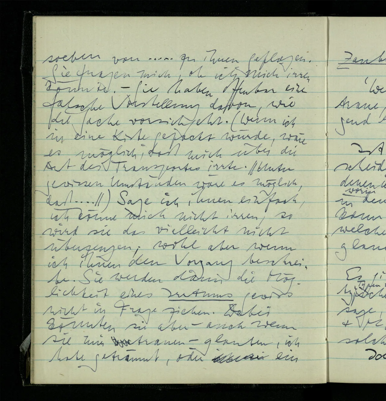 Ich kann auch den Andern davon überzeugen, daß ich mich ‘darin nicht irren kann’. Ich sage Einem: “Der & der war heute vormittag bei mir & hat mir das & das erzählt.” Wenn es erstaunlich ist, so fragt er mich vielleicht: “Du kannst Dich nicht darin irren?” Das mag heißen: “Ist das auch gewiß heute vormittag geschehen?”, oder aber: “Hast Du ihn auch gewiß recht verstanden?” – Es ist leicht zu sehen, durch welche Ausführungen ich zeigen könnte, daß ich mich in der Zeit nicht geirrt habe, & ebenso, daß ich die Erzählung nicht mißverstanden habe. Aber alles dies kann nicht zeigen, daß ich die ganze Sache nicht geträumt, oder sie mir traumartig eingebildet habe. Es kann auch nicht zeigen, daß ich mich nicht etwa durchgehends versprochen habe. (So etwas kommt vor.)