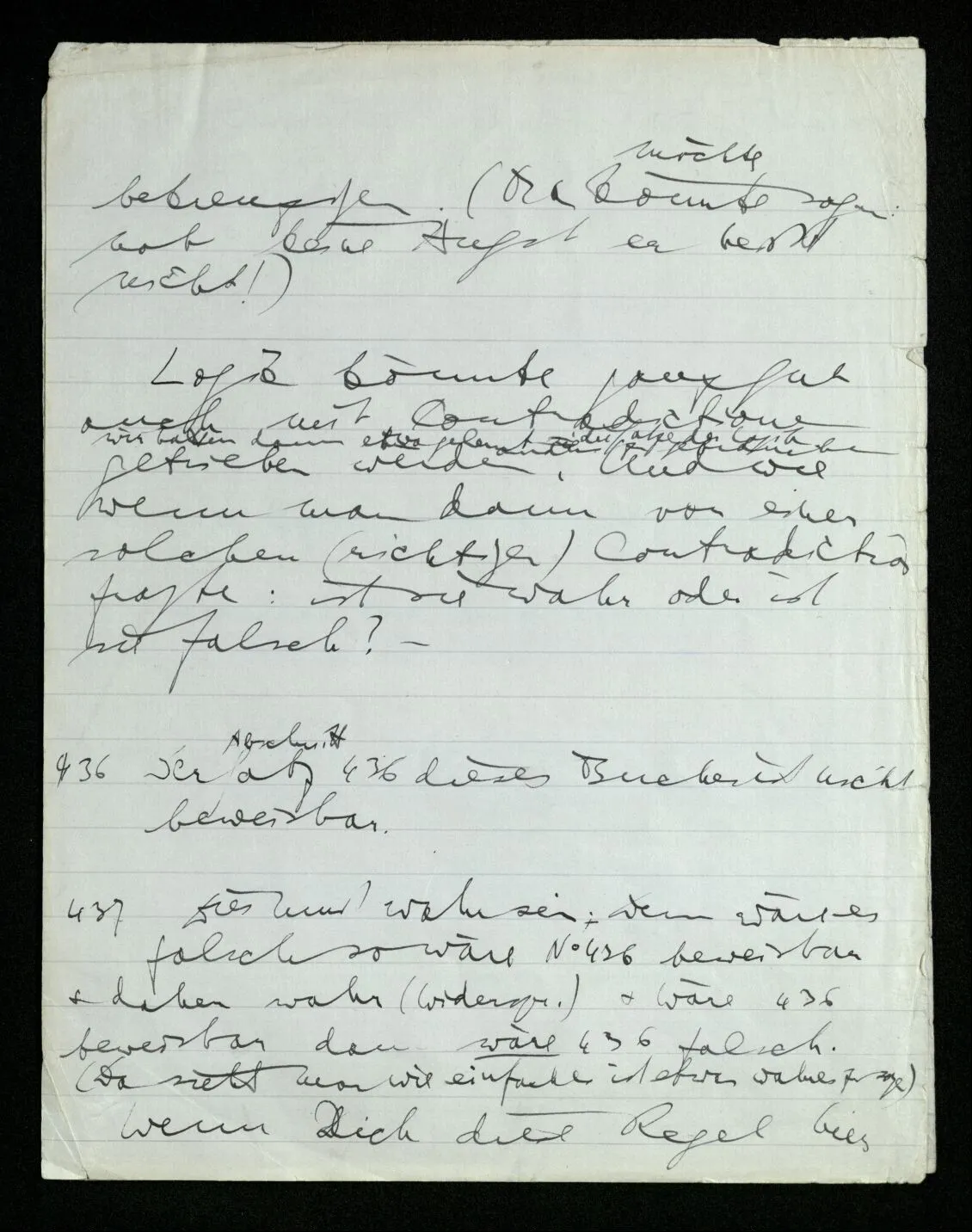 437 Dies muß wahr sein. Denn wäre es falsch so wäre № 436 beweisbar & daher wahr (Widerspruch) & wäre 436 beweisbar dann wäre 436 falsch. (Da sieht man wie einfach es ist etwas Wahres zu sagen.) Wenn Dich diese Regel hier zu so einem dummen Spiel führt, so wende sie hier nicht an.