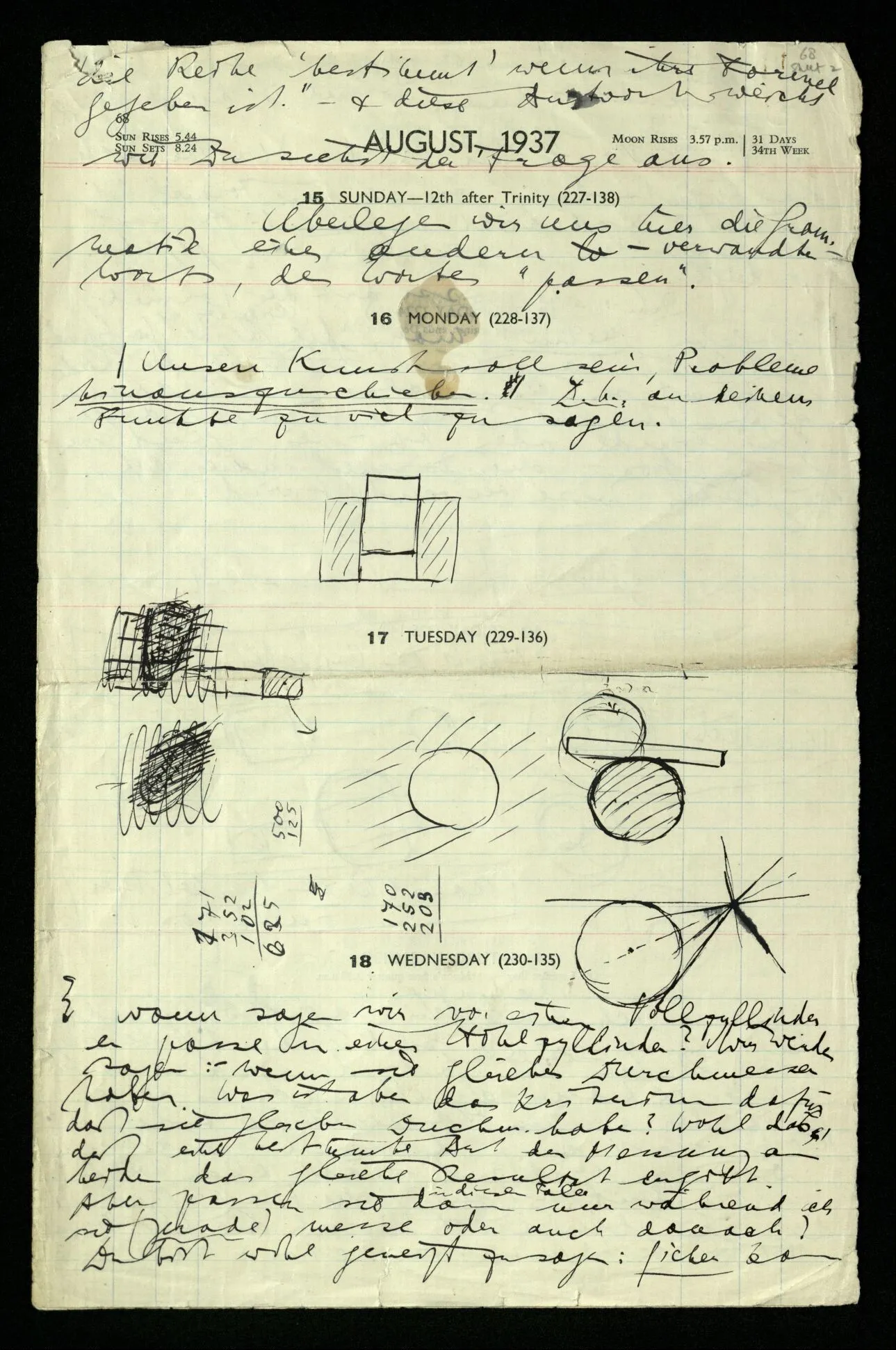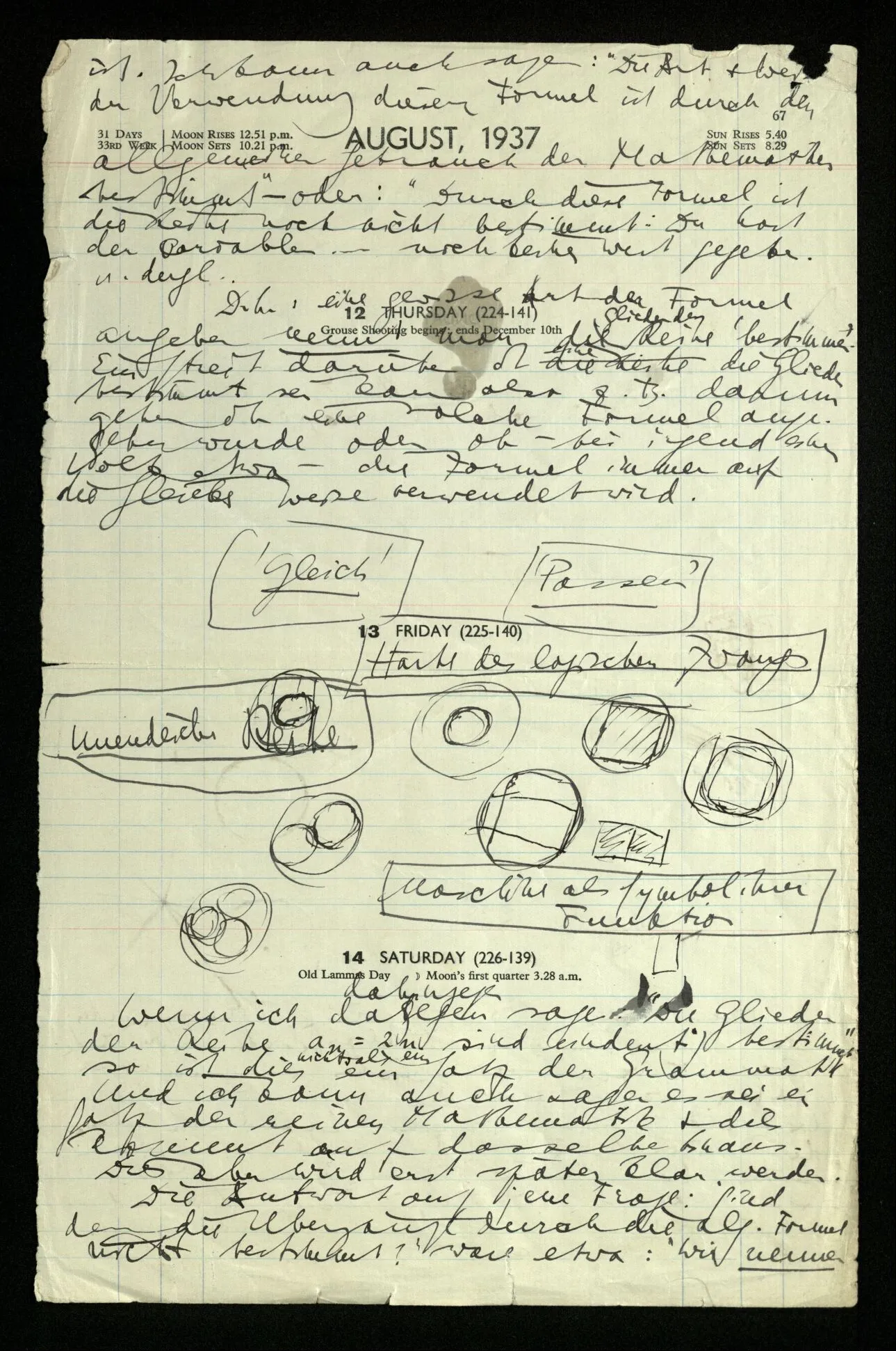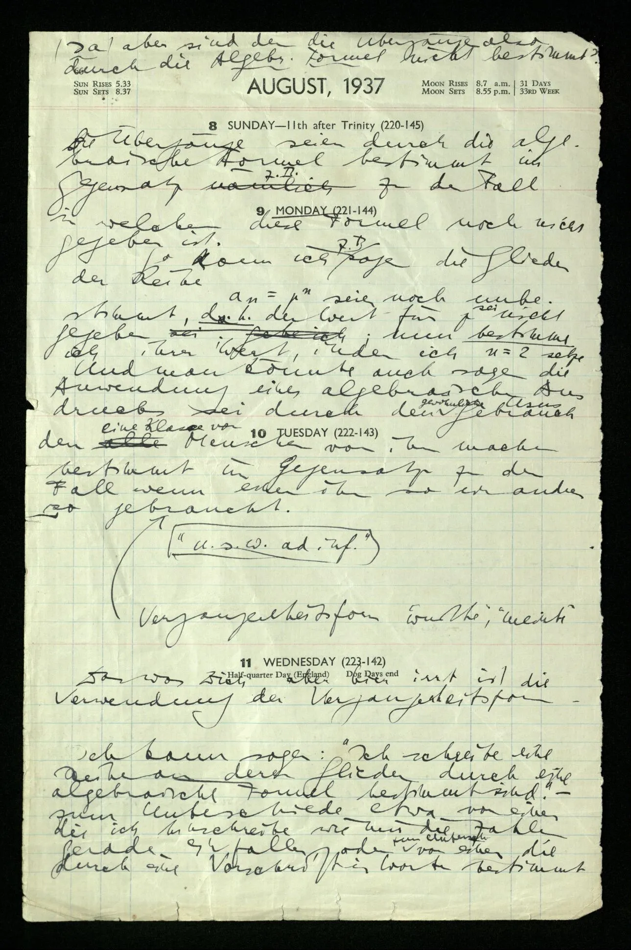 (Ja) aber sind denn die Übergänge also durch die algebraische Formel nicht bestimmt? So kann ich z.B. sagen die Glieder der Reihe an = pn seien noch unbestimmt, d.h. der Wert für p sei nicht gegeben; nun bestimme ich ihren Wert, indem ich n = 2 setze. Und man könnte auch sagen die Anwendung eines algebraischen Ausdrucks sei durch den gewöhnlichen Gebrauch den eine Klasse von Menschen von ihm macht bestimmt im Gegensatz zu dem Fall wenn einer ihn so ein andrer so gebraucht.