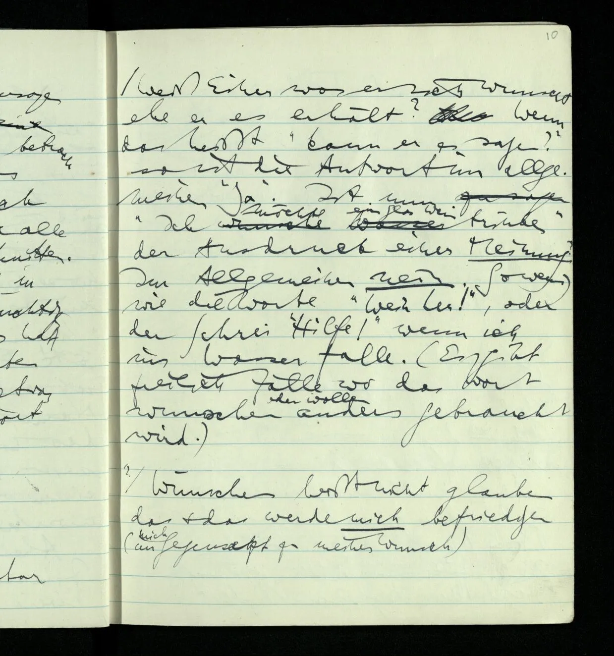Weiß einer was er sich wünscht ehe er es erhält? Wenn das heißt “Kann er es sagen?” so ist die Antwort im allgemeinen ‘Ja’. Ist nun “Ich möchte ein Glas Wein trinken” der Ausdruck einer Meinung? Im allgemeinen nein. So wenig wie die Worte “Wein her!”, oder der Schrei “Hilfe!” wenn ich ins Wasser falle. (Es gibt freilich Fälle wo das Wort wünschen oder wollen anders gebraucht wird.)