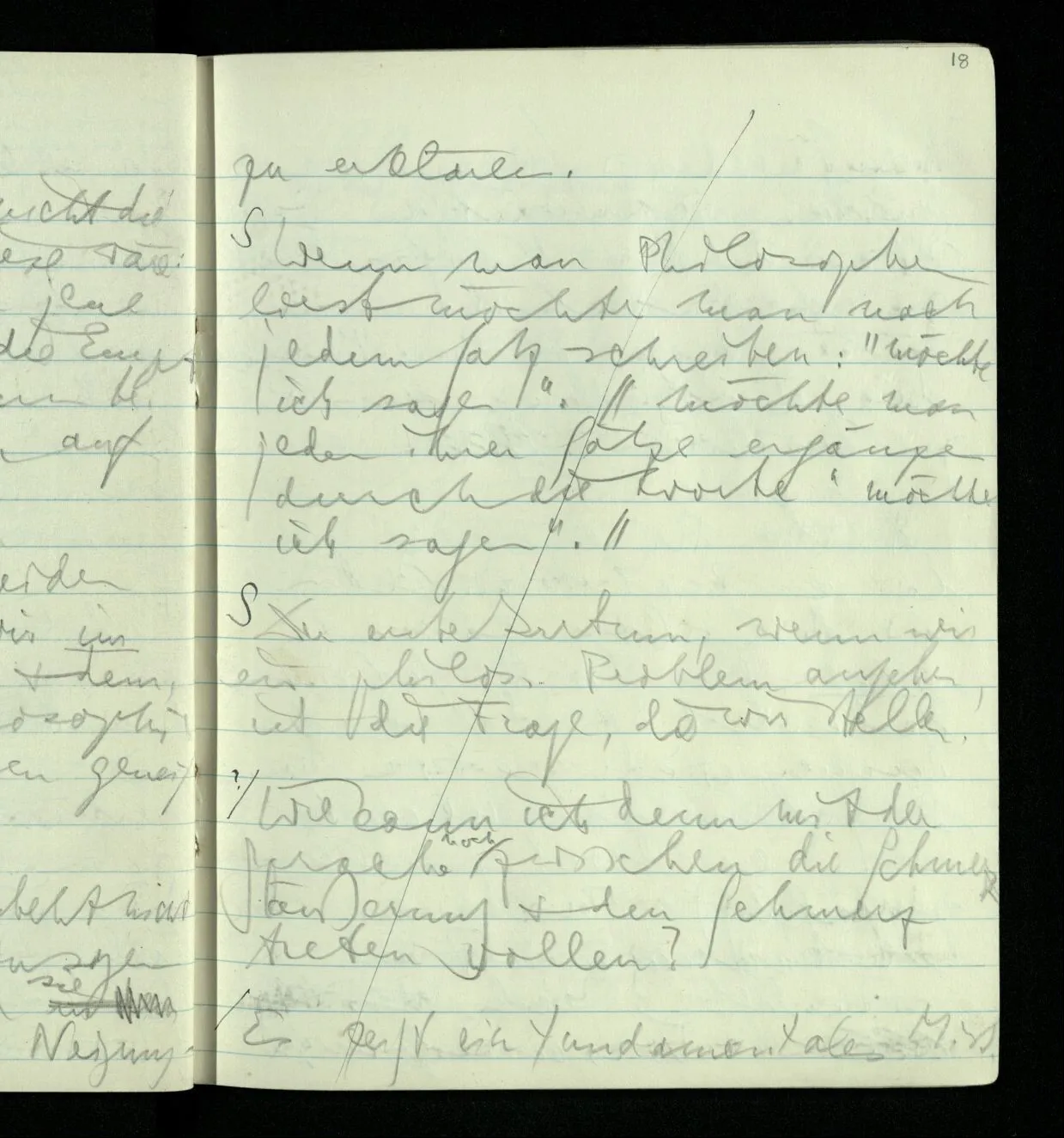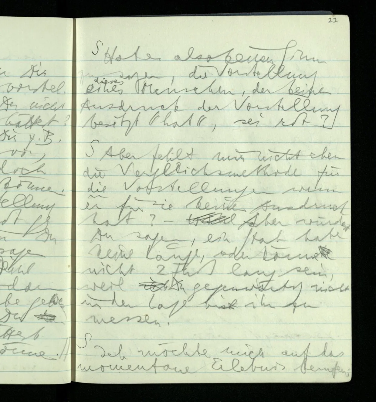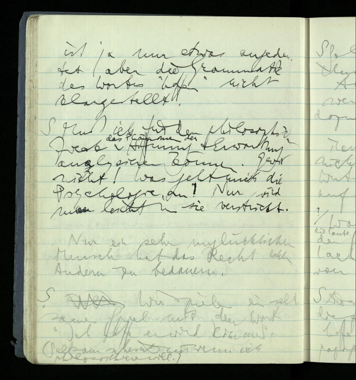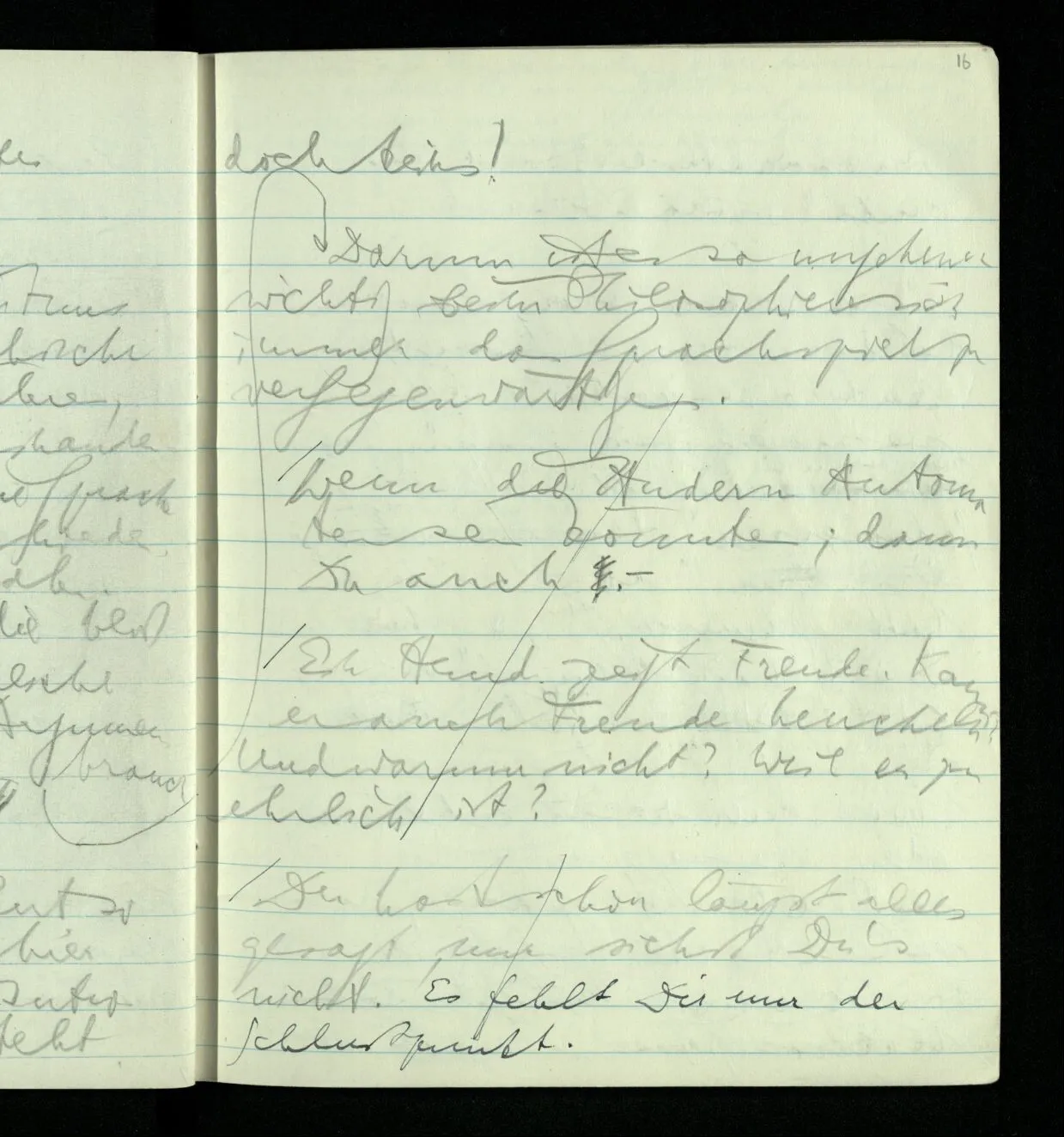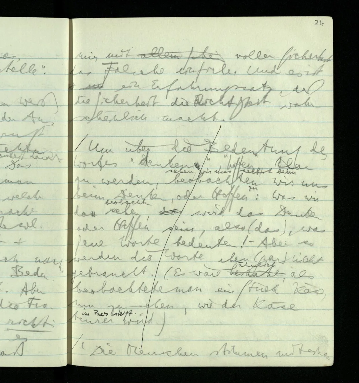 Ich warte den ganzen Tag auf jemand sein Hund tut das gleiche. Wenn immer wir ein Automobil vorfahren hören werden wir beide unruhig & schauen nach der Türe. Ich bereite verschiedenes für seine Ankunft vor. Ich sage zu mir selbst oder zu andern “Wenn er doch schon käme” usw. Der Hund kann das nicht. Ich könnte sagen daß ihn der Hund in einem viel primitiveren Sinne erwartet als ich. Aber wenn ich nun in meinem Zimmer sitze & hoffe er werde kommen & eine Minute dieses Hoffens könnte sozusagen isoliert werden & ohne sein Vor- & Nachspiel betrachtet werden, wäre es da kein Hoffen. Aber durch diese Isolation sind ja alle Verbindungen durchschnitten. Sehe ich in dieser Minute mit sehnsüchtigem Ausdruck & Gefühl zur Türe was hat das mit einem bestimmten Menschen zu tun. Sage ich etwas in dieser Minute so gehört es zu keiner Sprache.