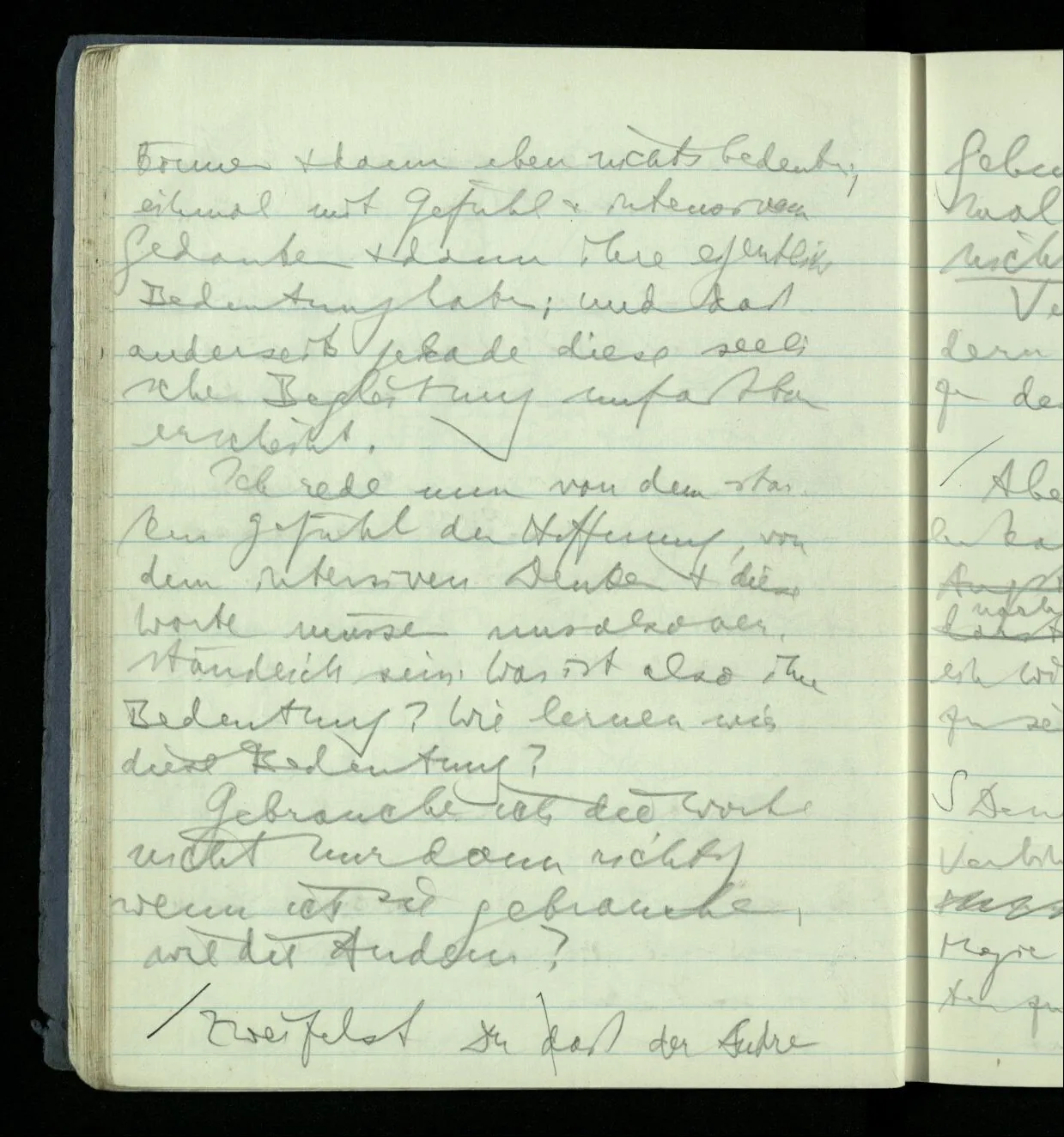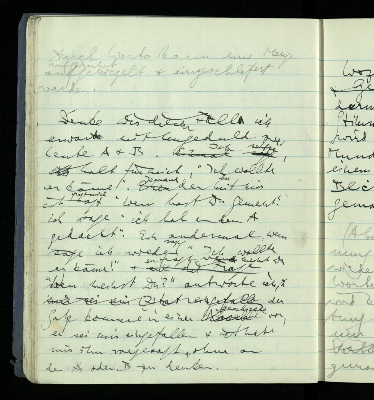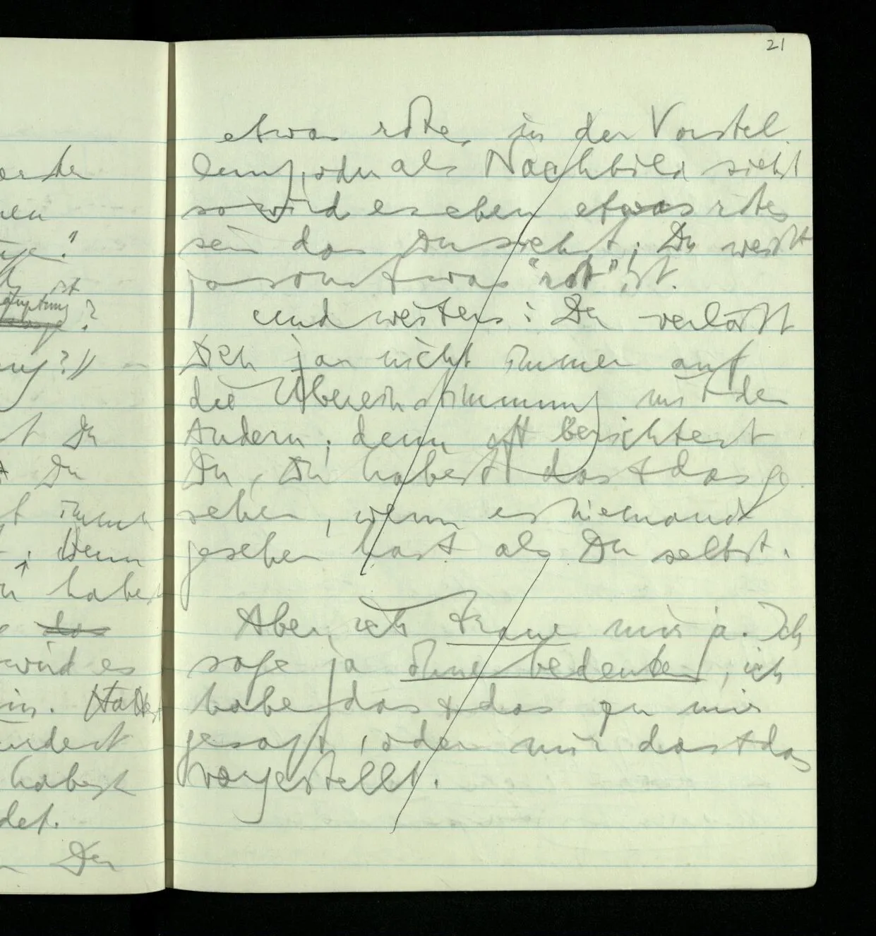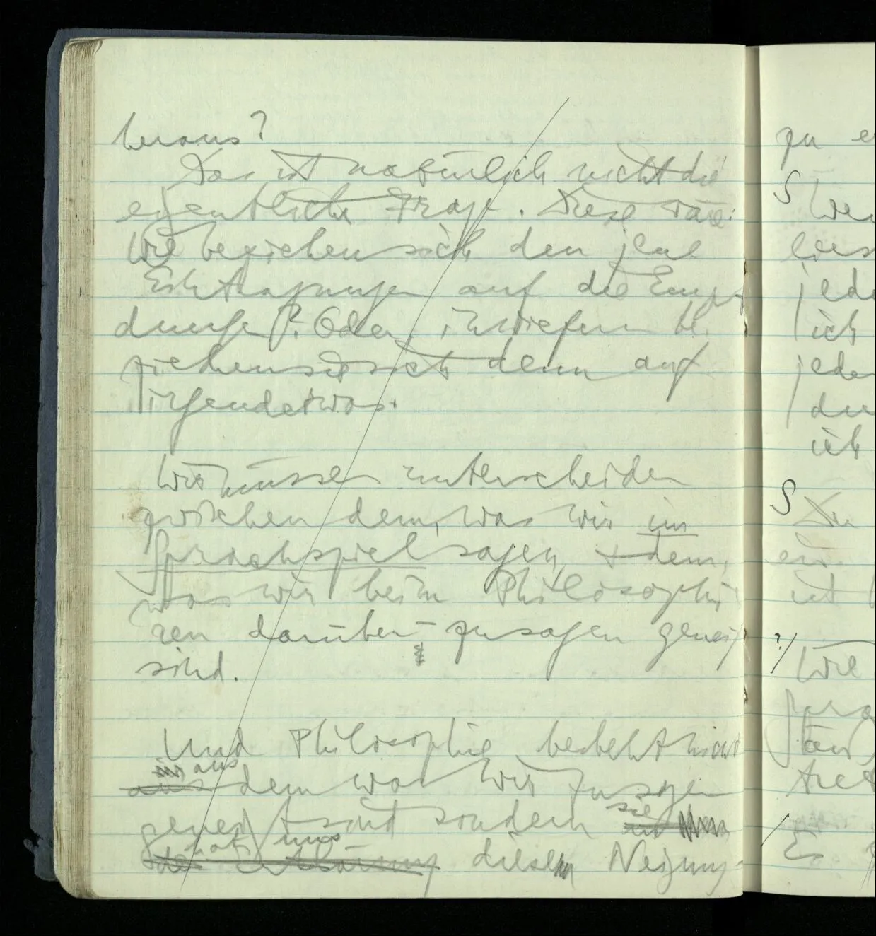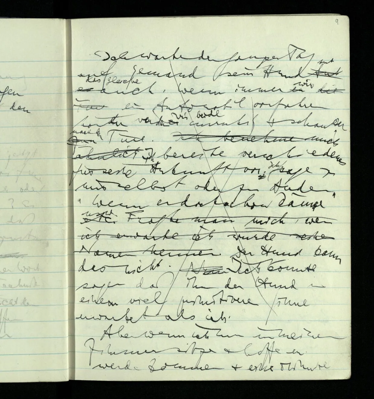 Ich warte den ganzen Tag auf jemand sein Hund tut das gleiche. Wenn immer wir ein Automobil vorfahren hören werden wir beide unruhig & schauen nach der Türe. Ich bereite verschiedenes für seine Ankunft vor. Ich sage zu mir selbst oder zu andern “Wenn er doch schon käme” usw. Der Hund kann das nicht. Ich könnte sagen daß ihn der Hund in einem viel primitiveren Sinne erwartet als ich. Aber wenn ich nun in meinem Zimmer sitze & hoffe er werde kommen & eine Minute dieses Hoffens könnte sozusagen isoliert werden & ohne sein Vor- & Nachspiel betrachtet werden, wäre es da kein Hoffen. Aber durch diese Isolation sind ja alle Verbindungen durchschnitten. Sehe ich in dieser Minute mit sehnsüchtigem Ausdruck & Gefühl zur Türe was hat das mit einem bestimmten Menschen zu tun. Sage ich etwas in dieser Minute so gehört es zu keiner Sprache.