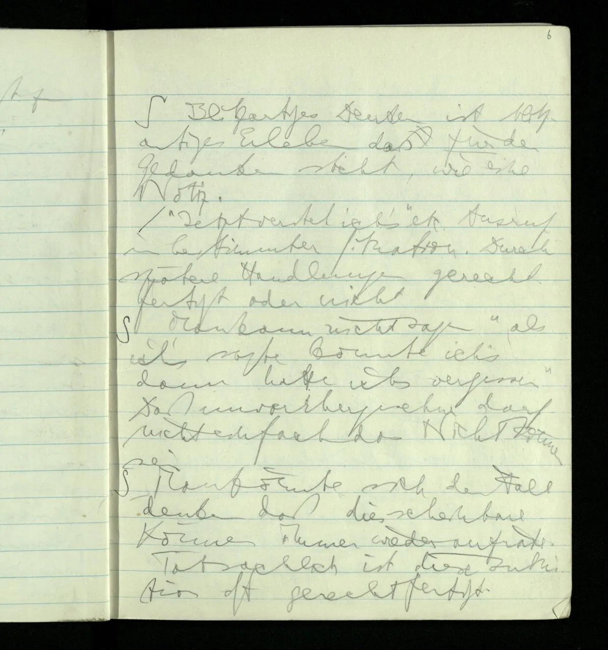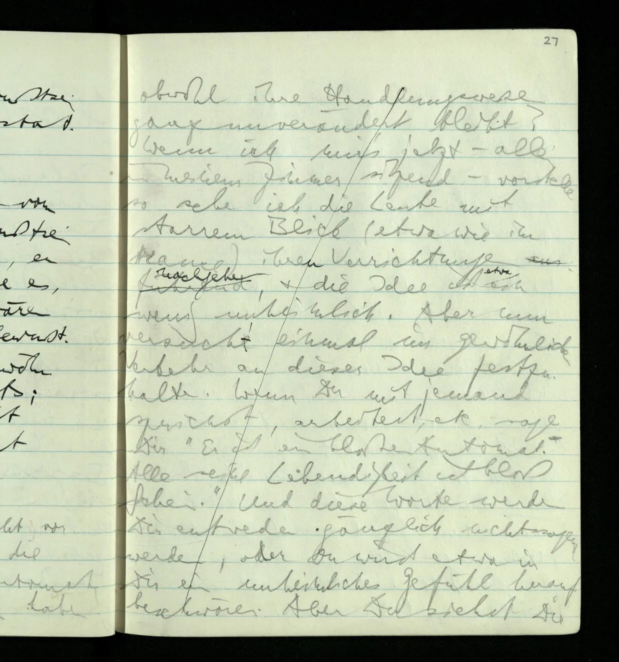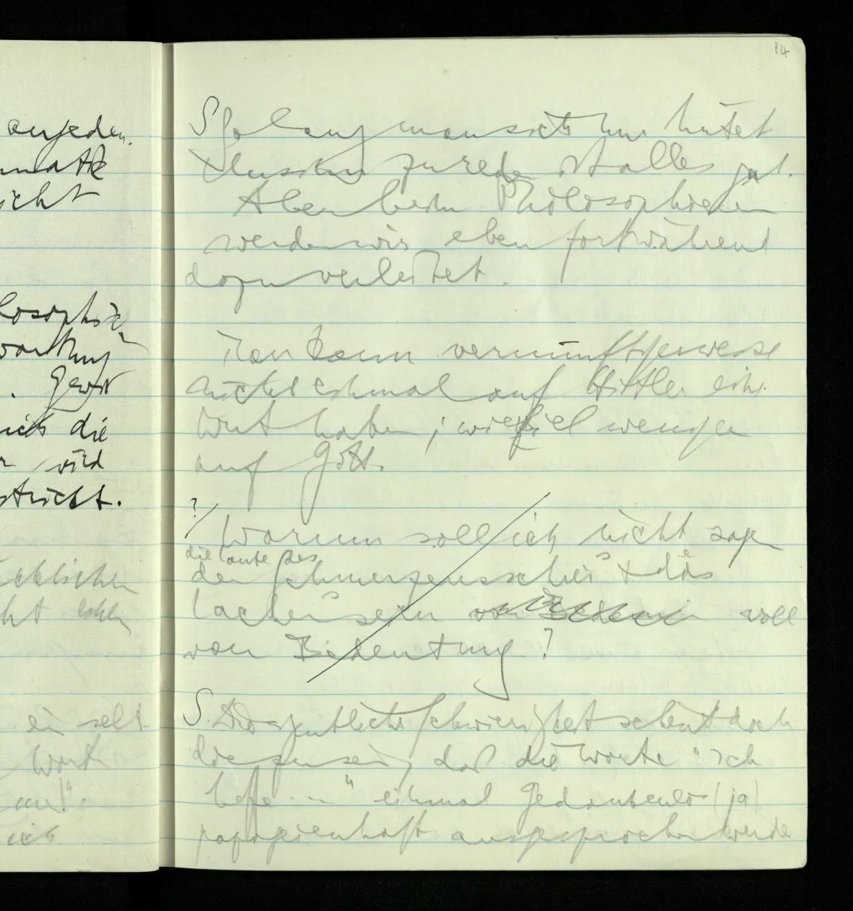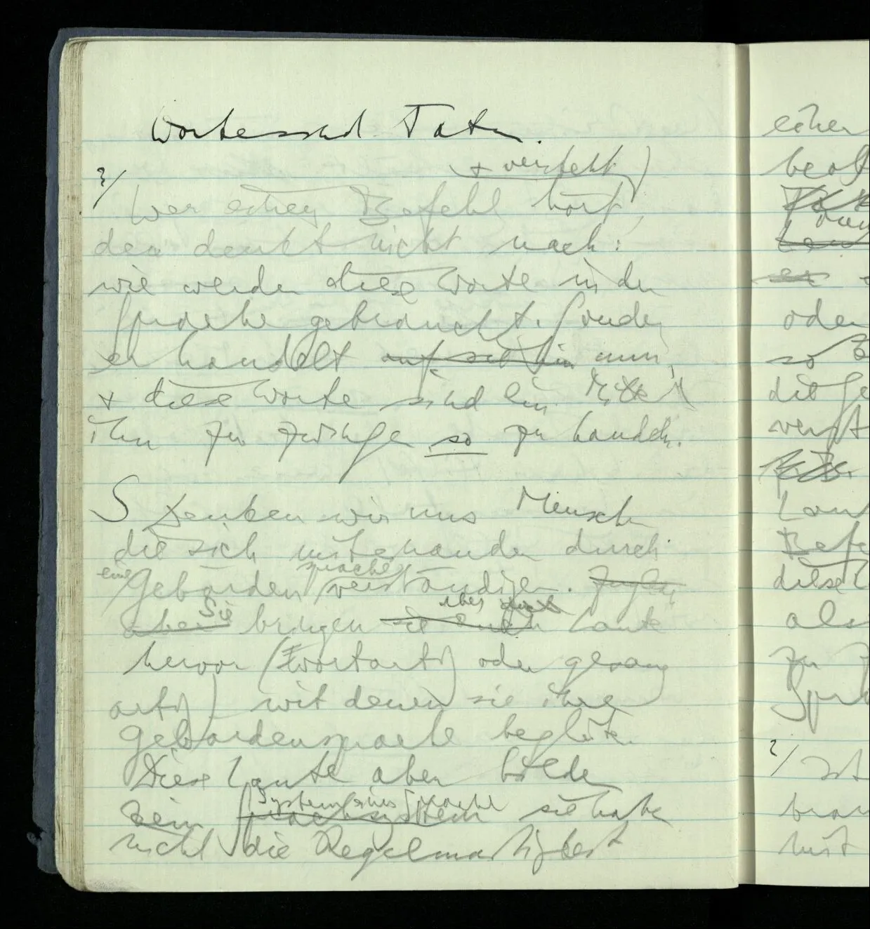 Ich warte den ganzen Tag auf jemand sein Hund tut das gleiche. Wenn immer wir ein Automobil vorfahren hören werden wir beide unruhig & schauen nach der Türe. Ich bereite verschiedenes für seine Ankunft vor. Ich sage zu mir selbst oder zu andern “Wenn er doch schon käme” usw. Der Hund kann das nicht. Ich könnte sagen daß ihn der Hund in einem viel primitiveren Sinne erwartet als ich. Aber wenn ich nun in meinem Zimmer sitze & hoffe er werde kommen & eine Minute dieses Hoffens könnte sozusagen isoliert werden & ohne sein Vor- & Nachspiel betrachtet werden, wäre es da kein Hoffen. Aber durch diese Isolation sind ja alle Verbindungen durchschnitten. Sehe ich in dieser Minute mit sehnsüchtigem Ausdruck & Gefühl zur Türe was hat das mit einem bestimmten Menschen zu tun. Sage ich etwas in dieser Minute so gehört es zu keiner Sprache.