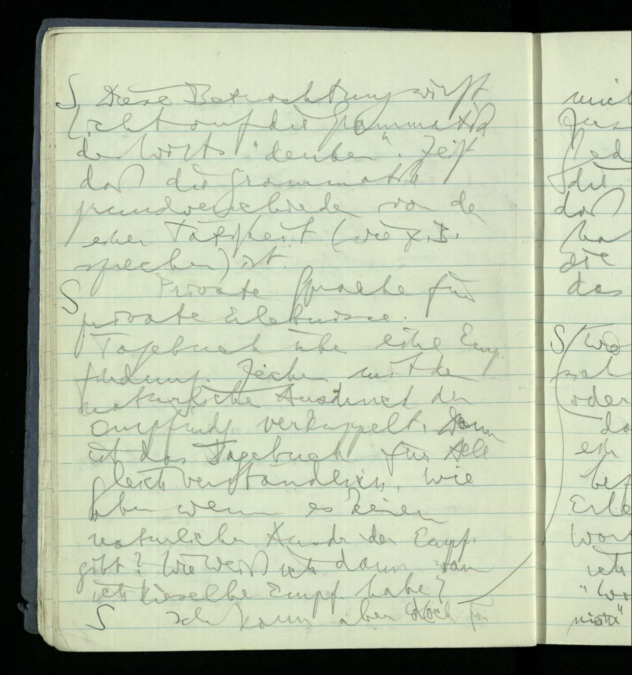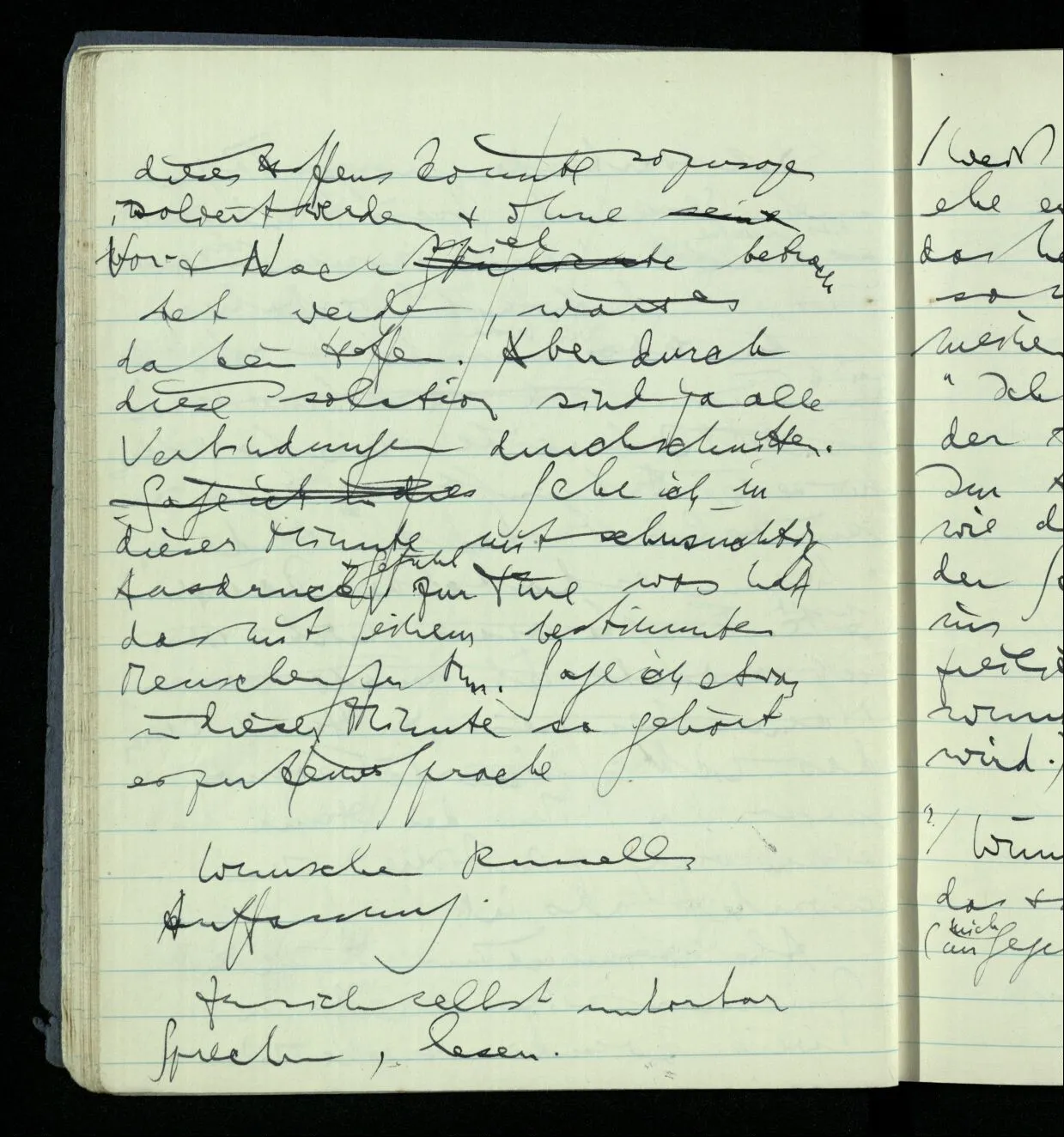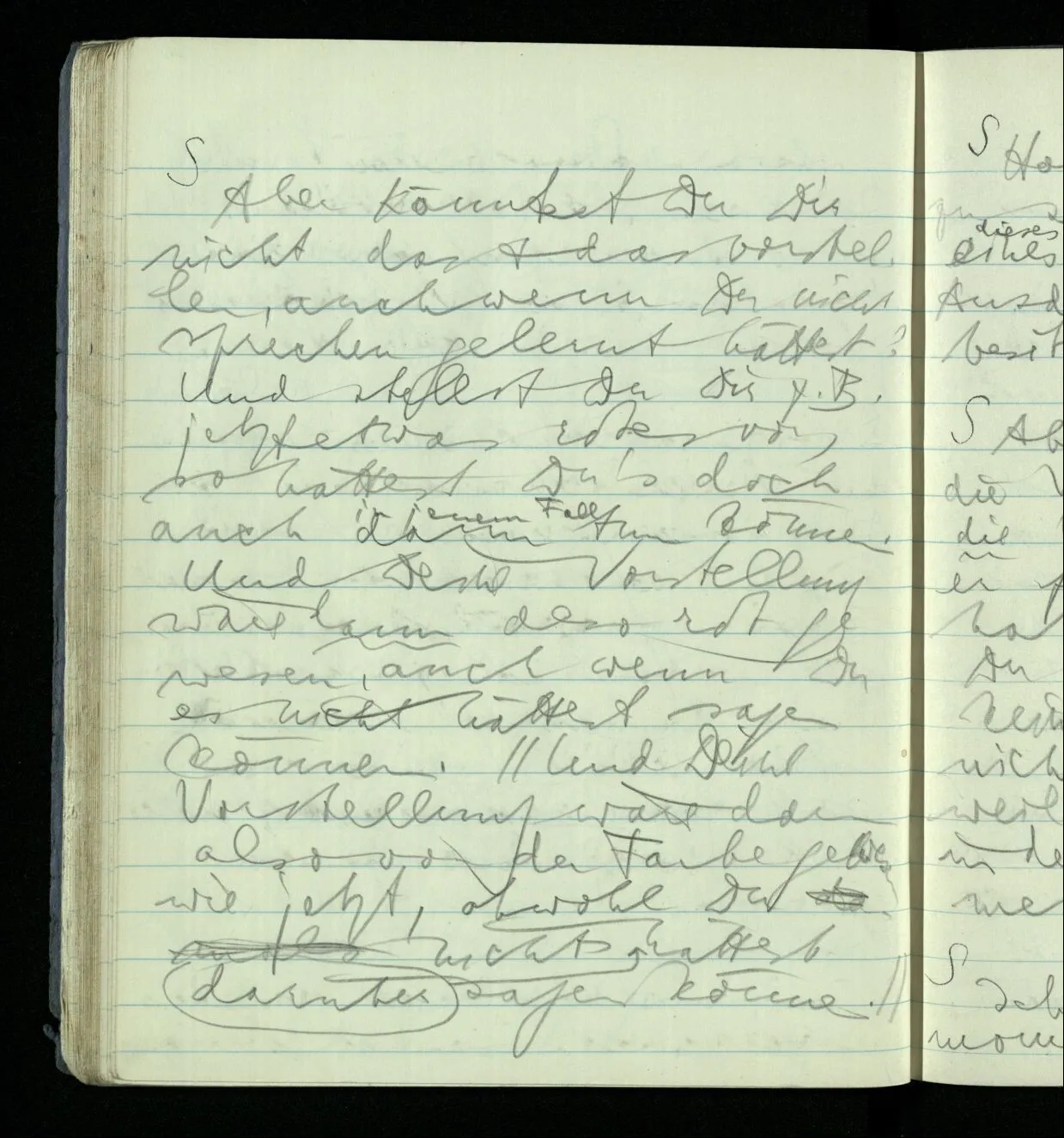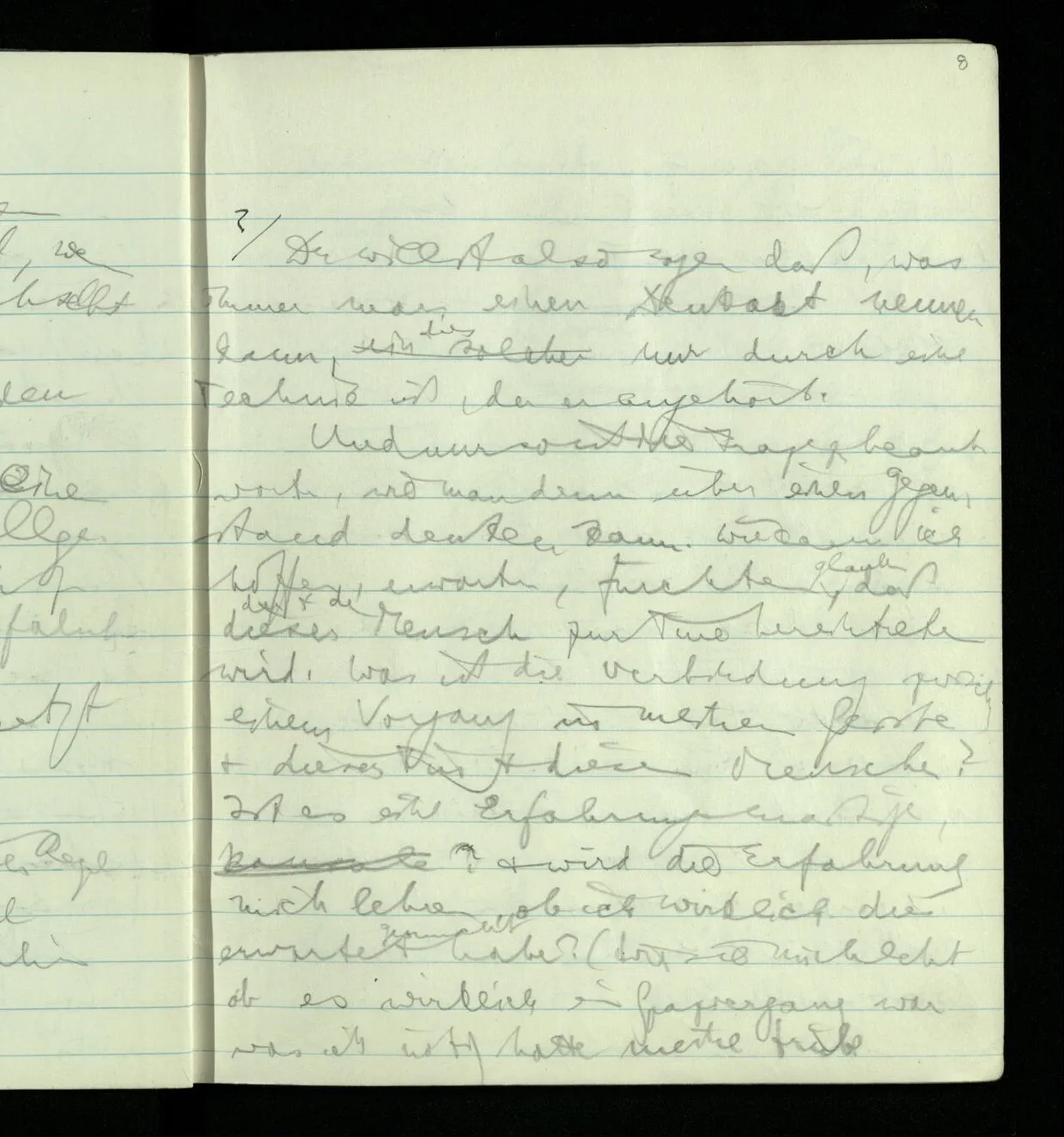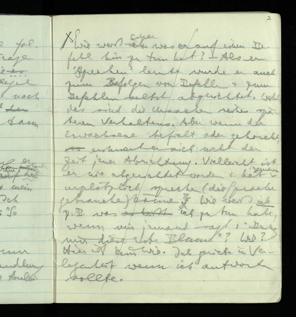 Ich warte den ganzen Tag auf jemand sein Hund tut das gleiche. Wenn immer wir ein Automobil vorfahren hören werden wir beide unruhig & schauen nach der Türe. Ich bereite verschiedenes für seine Ankunft vor. Ich sage zu mir selbst oder zu andern “Wenn er doch schon käme” usw. Der Hund kann das nicht. Ich könnte sagen daß ihn der Hund in einem viel primitiveren Sinne erwartet als ich. Aber wenn ich nun in meinem Zimmer sitze & hoffe er werde kommen & eine Minute dieses Hoffens könnte sozusagen isoliert werden & ohne sein Vor- & Nachspiel betrachtet werden, wäre es da kein Hoffen. Aber durch diese Isolation sind ja alle Verbindungen durchschnitten. Sehe ich in dieser Minute mit sehnsüchtigem Ausdruck & Gefühl zur Türe was hat das mit einem bestimmten Menschen zu tun. Sage ich etwas in dieser Minute so gehört es zu keiner Sprache.