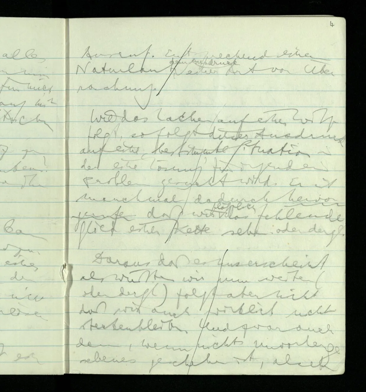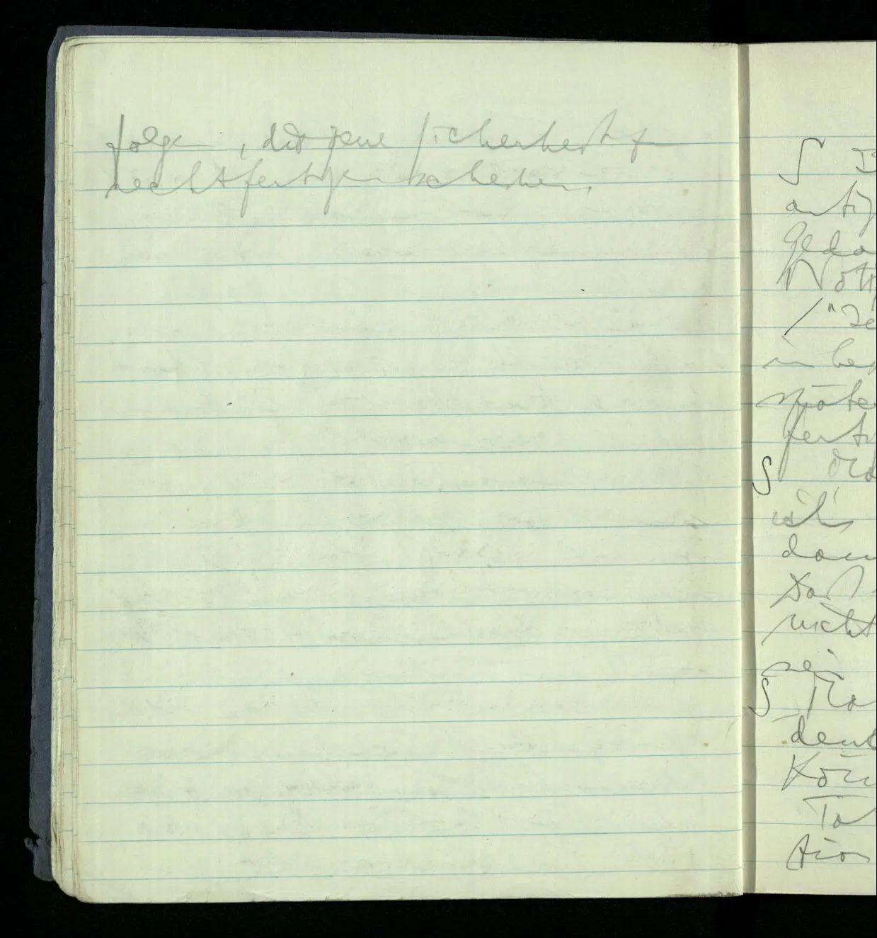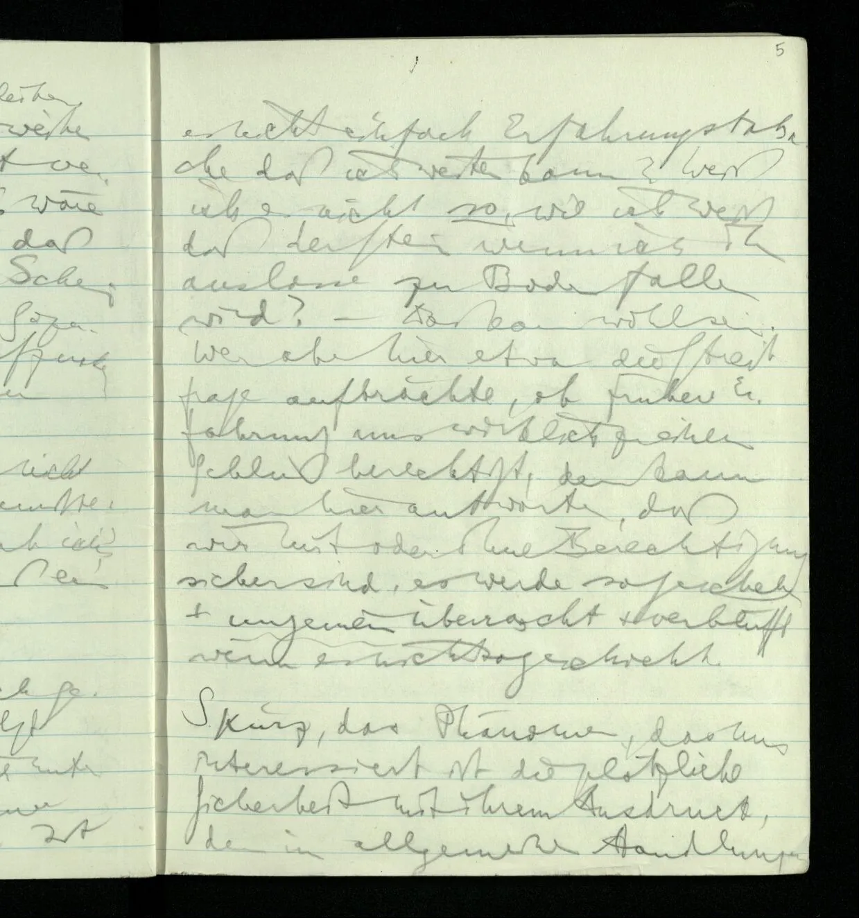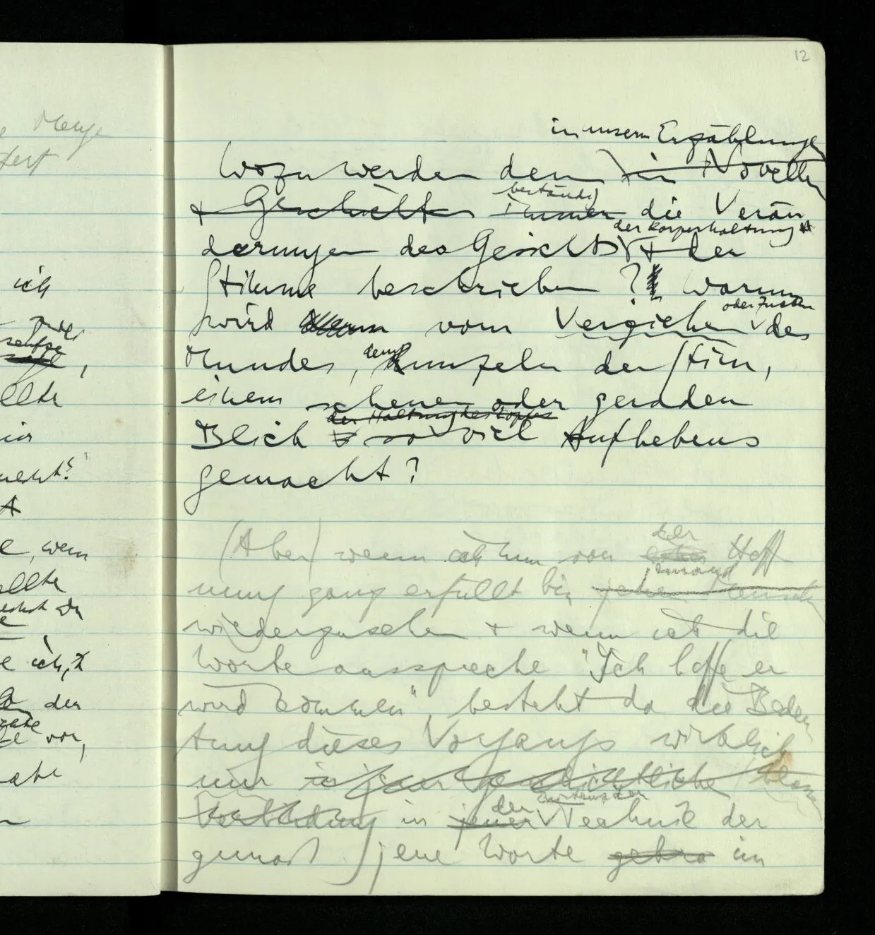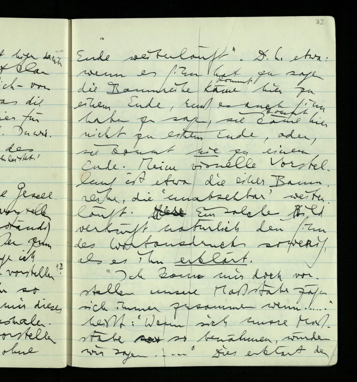 Ich warte den ganzen Tag auf jemand sein Hund tut das gleiche. Wenn immer wir ein Automobil vorfahren hören werden wir beide unruhig & schauen nach der Türe. Ich bereite verschiedenes für seine Ankunft vor. Ich sage zu mir selbst oder zu andern “Wenn er doch schon käme” usw. Der Hund kann das nicht. Ich könnte sagen daß ihn der Hund in einem viel primitiveren Sinne erwartet als ich. Aber wenn ich nun in meinem Zimmer sitze & hoffe er werde kommen & eine Minute dieses Hoffens könnte sozusagen isoliert werden & ohne sein Vor- & Nachspiel betrachtet werden, wäre es da kein Hoffen. Aber durch diese Isolation sind ja alle Verbindungen durchschnitten. Sehe ich in dieser Minute mit sehnsüchtigem Ausdruck & Gefühl zur Türe was hat das mit einem bestimmten Menschen zu tun. Sage ich etwas in dieser Minute so gehört es zu keiner Sprache.
