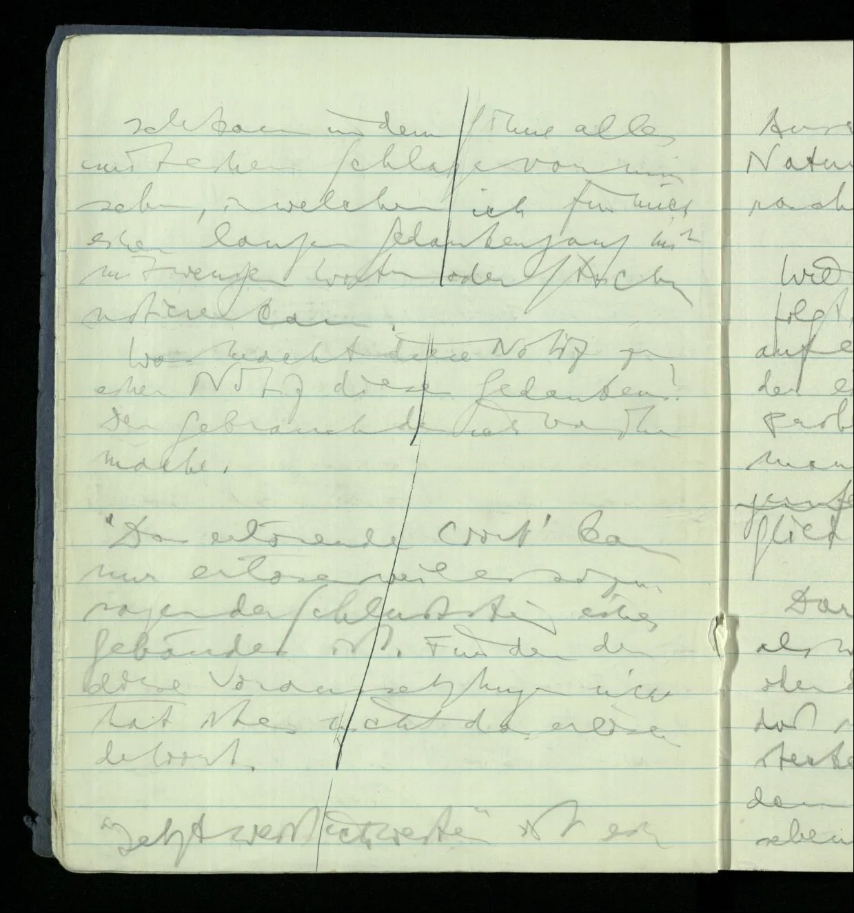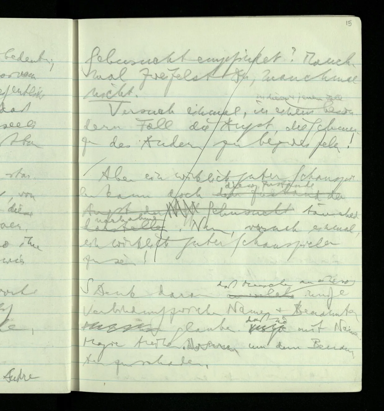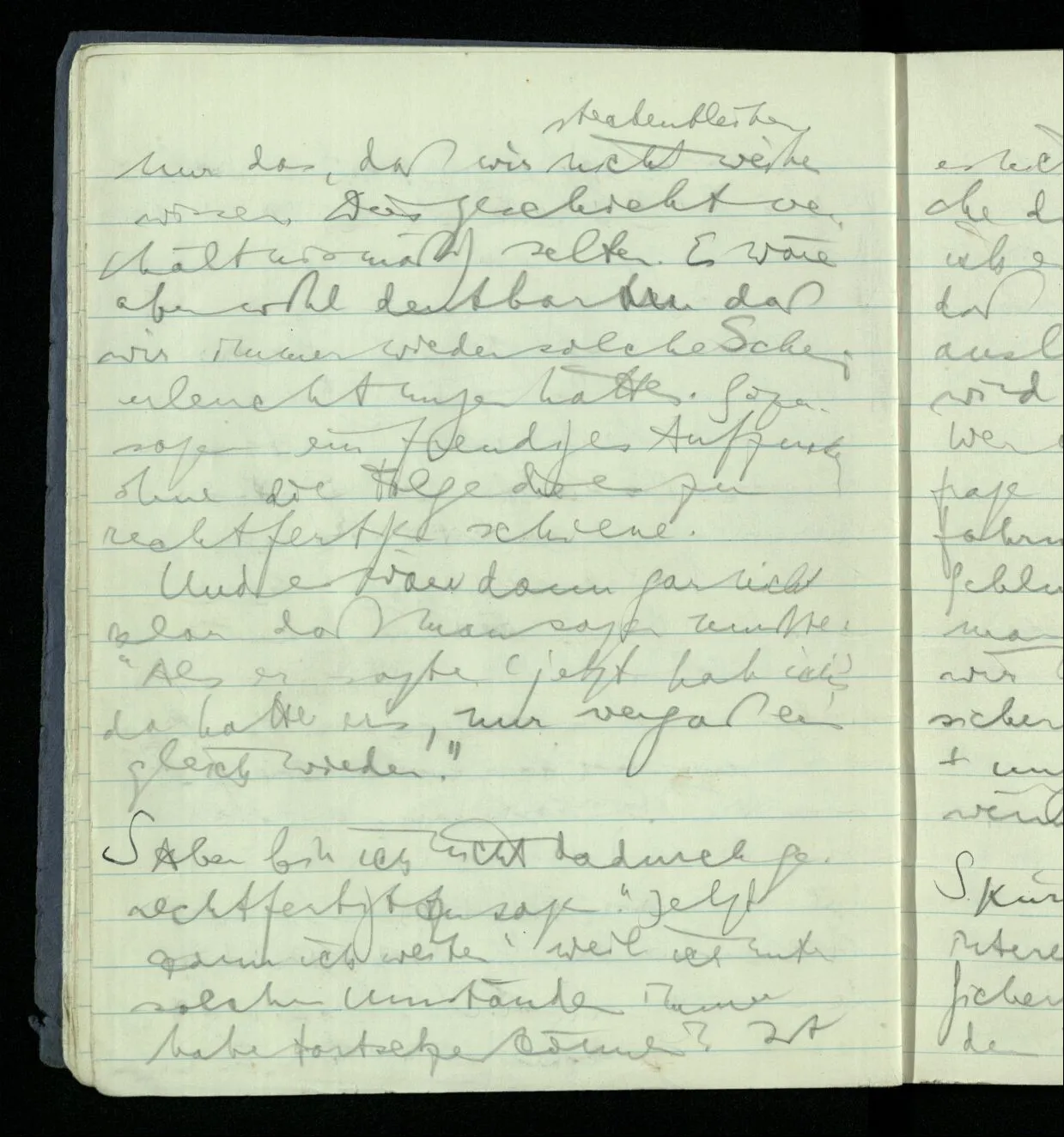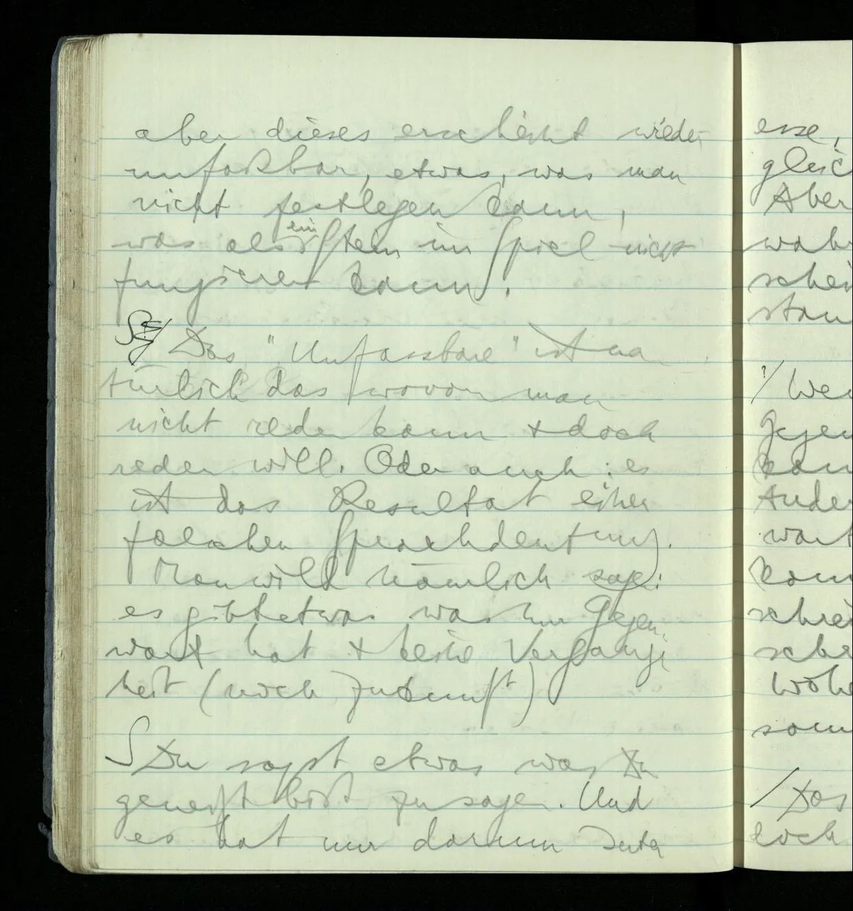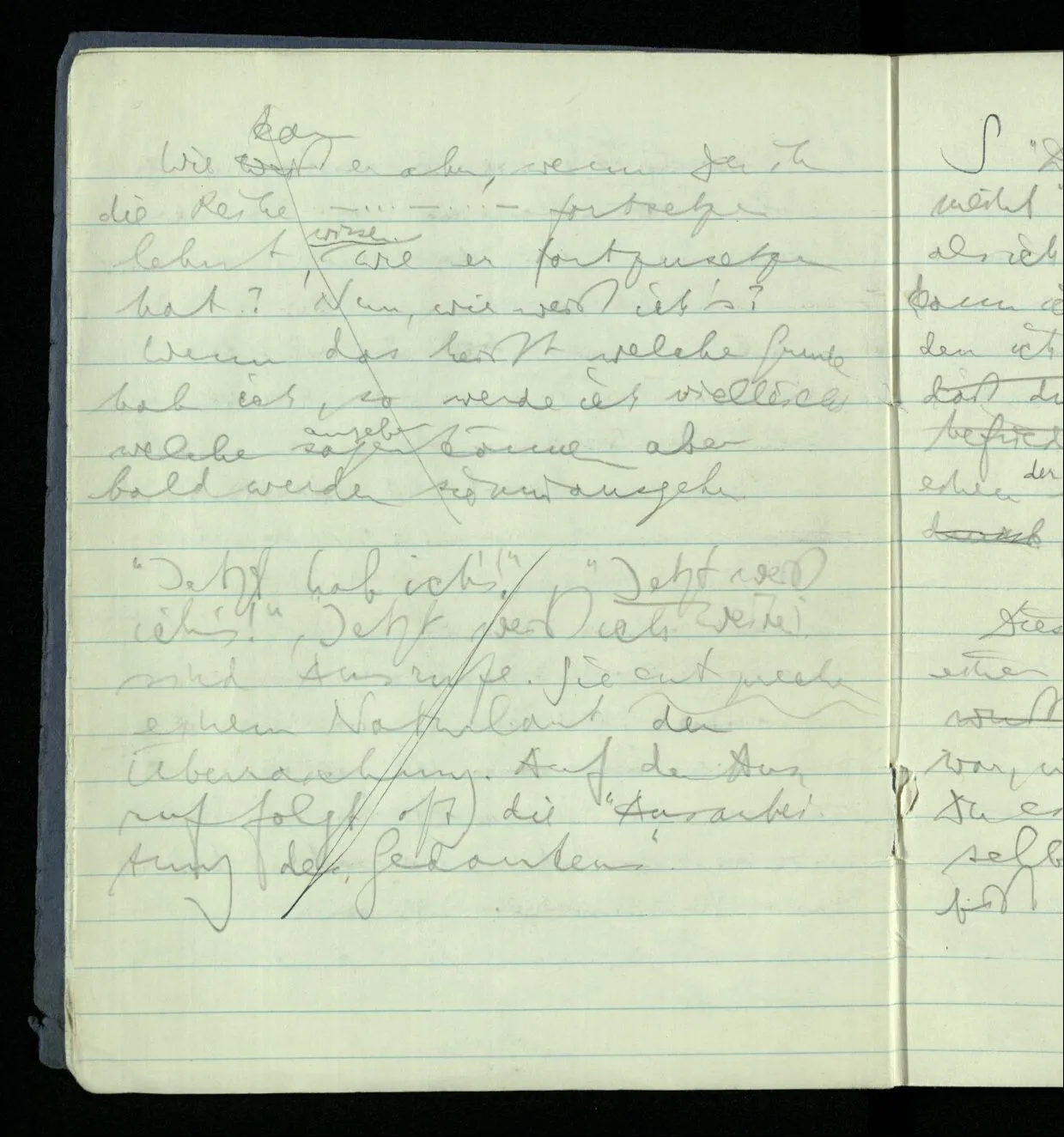 Ich warte den ganzen Tag auf jemand sein Hund tut das gleiche. Wenn immer wir ein Automobil vorfahren hören werden wir beide unruhig & schauen nach der Türe. Ich bereite verschiedenes für seine Ankunft vor. Ich sage zu mir selbst oder zu andern “Wenn er doch schon käme” usw. Der Hund kann das nicht. Ich könnte sagen daß ihn der Hund in einem viel primitiveren Sinne erwartet als ich. Aber wenn ich nun in meinem Zimmer sitze & hoffe er werde kommen & eine Minute dieses Hoffens könnte sozusagen isoliert werden & ohne sein Vor- & Nachspiel betrachtet werden, wäre es da kein Hoffen. Aber durch diese Isolation sind ja alle Verbindungen durchschnitten. Sehe ich in dieser Minute mit sehnsüchtigem Ausdruck & Gefühl zur Türe was hat das mit einem bestimmten Menschen zu tun. Sage ich etwas in dieser Minute so gehört es zu keiner Sprache.