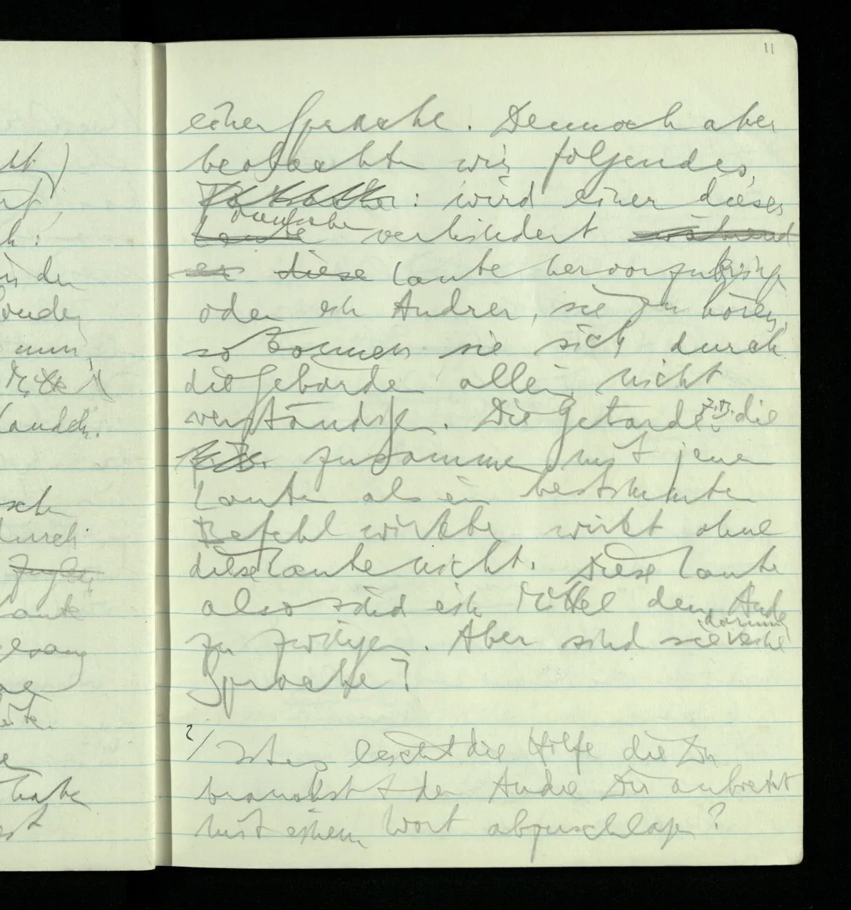 Denken wir uns Menschen die sich miteinander durch eine Gebärdensprache verständigen. Sie bringen aber Laute hervor (wortartig oder gesangartig) mit denen sie ihre Gebärdensprache begleiten. Diese Laute aber bilden kein System einer Sprache sie haben nicht die Regelmäßigkeit einer Sprache. Dennoch aber beobachten wir folgendes: wird einer dieser Menschen verhindert Laute hervorzubringen oder ein andrer, sie zu hören, so können sie sich durch die Gebärden allein nicht verständigen. Die Gebärde z.B. die zusammen mit jenen Lauten als ein bestimmter Befehl wirkte wirkt ohne diese Laute nicht. Diese Laute also sind ein Mittel den andern zu zwingen. Aber sind sie darum eine Sprache?