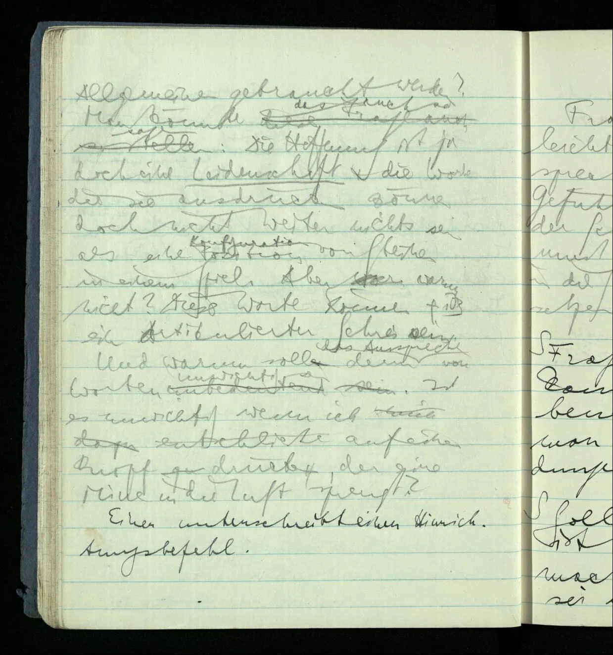 (Aber) wenn ich nun von der Hoffnung ganz erfüllt bin jemanden wiederzusehen & wenn ich die Worte ausspreche “Ich hoffe er wird kommen”, besteht da die Bedeutung dieses Vorgangs wirklich nur in der Existenz der Technik der gemäß jene Worte im allgemeinen gebraucht werden? Man könnte das auch so sagen: Die Hoffnung ist ja doch eine Leidenschaft & die Worte die sie ausdrücken können doch weiter nichts sein als eine Position von Steinen in einem Spiel. Aber warum nicht? Diese Worte können z.B. ein artikulierter Schrei sein. Und warum soll denn das Aussprechen von Worten unwichtig sein. Ist es unwichtig wenn ich auf einen Knopf drücke, der eine Mine in die Luft sprengt? Einer unterschreibt einen Hinrichtungsbefehl.