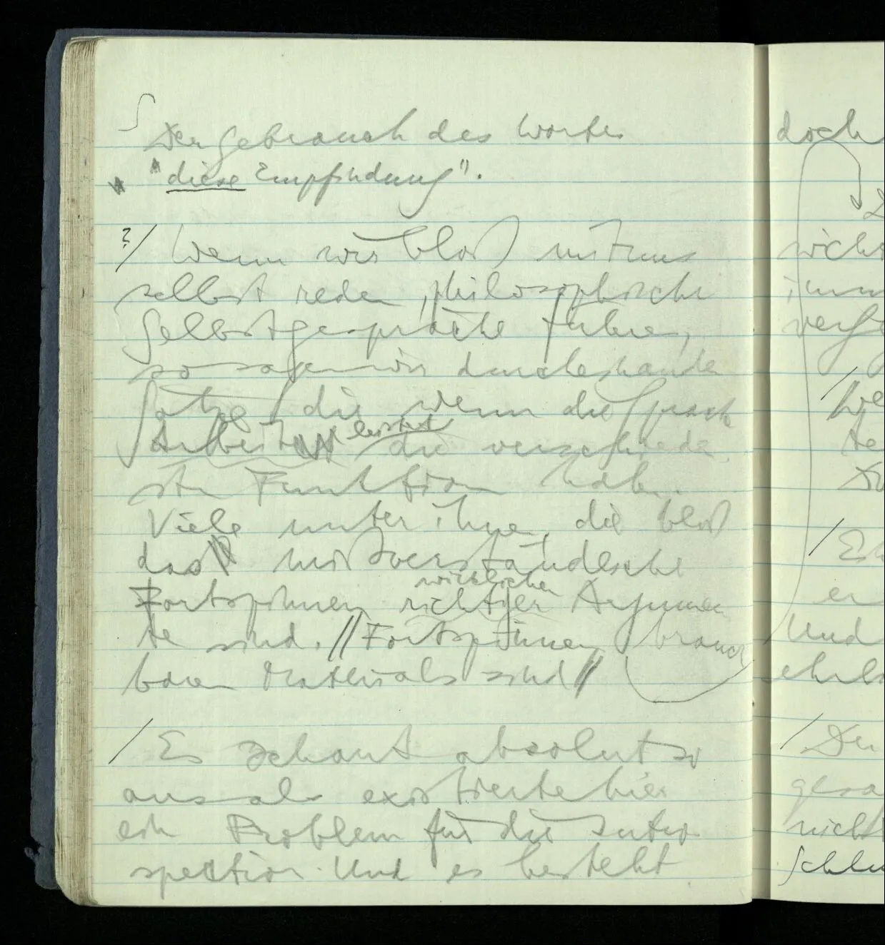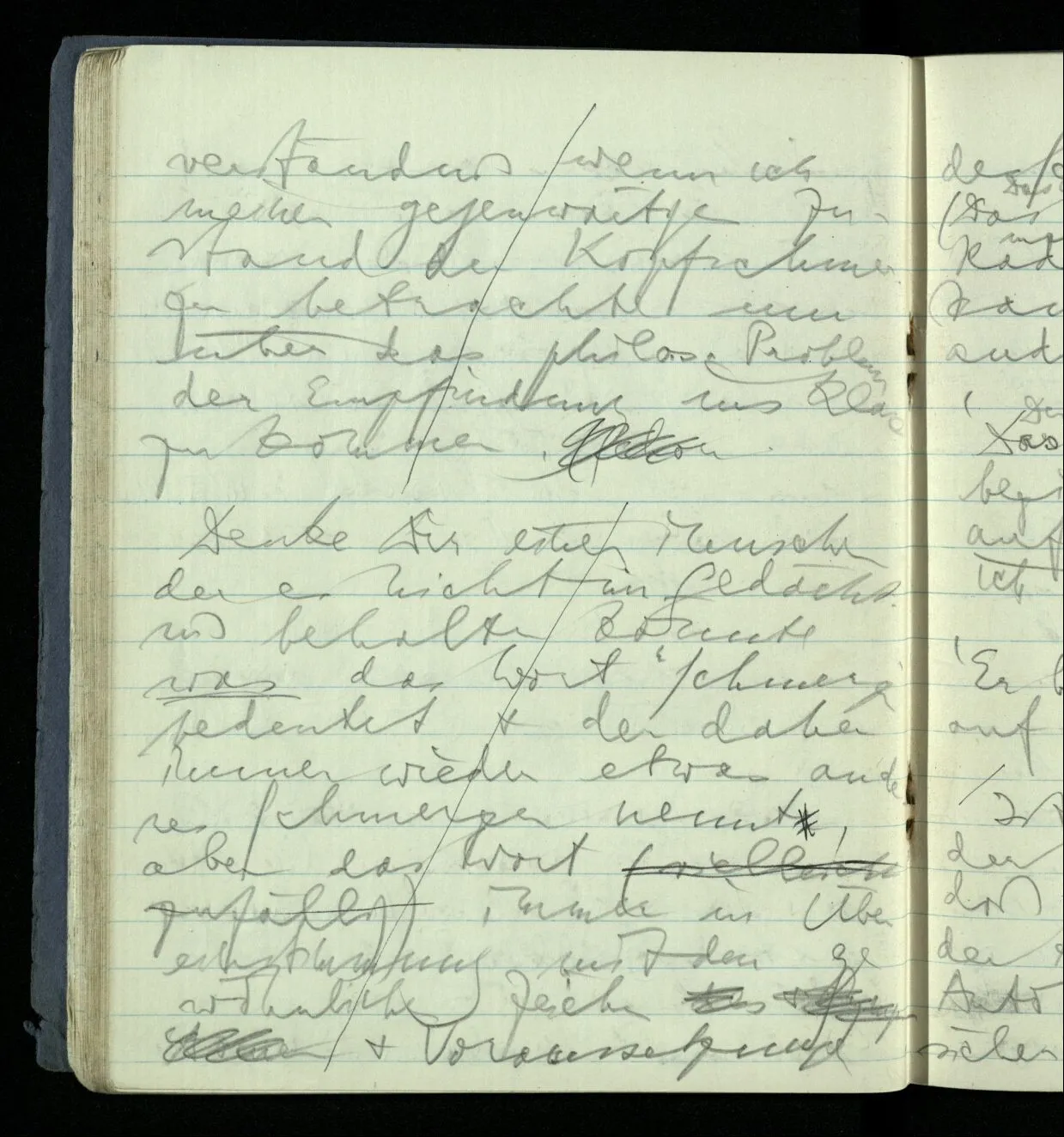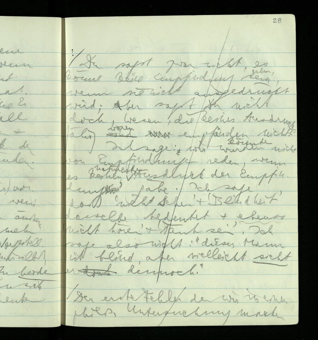 Du sagst zwar nicht, es könne keine Empfindung sein, wenn sie nicht ausgedrückt wird; aber sagst Du nicht doch, Wesen, die keines Ausdrucks fähig wären empfänden nichts? Ich sage: wir würden nicht von Empfindungen reden, wenn es keinen natürlichen ‘Ausdruck der Empfindung’ gäbe. Ich sage daß ‘nicht sehen’ & ‘Blindheit’ dasselbe bedeutet & ebenso ‘nicht hören’ & ‘taub sein’. Ich sage also nicht: “Dieser Mann ist blind, aber vielleicht sieht er dennoch”.