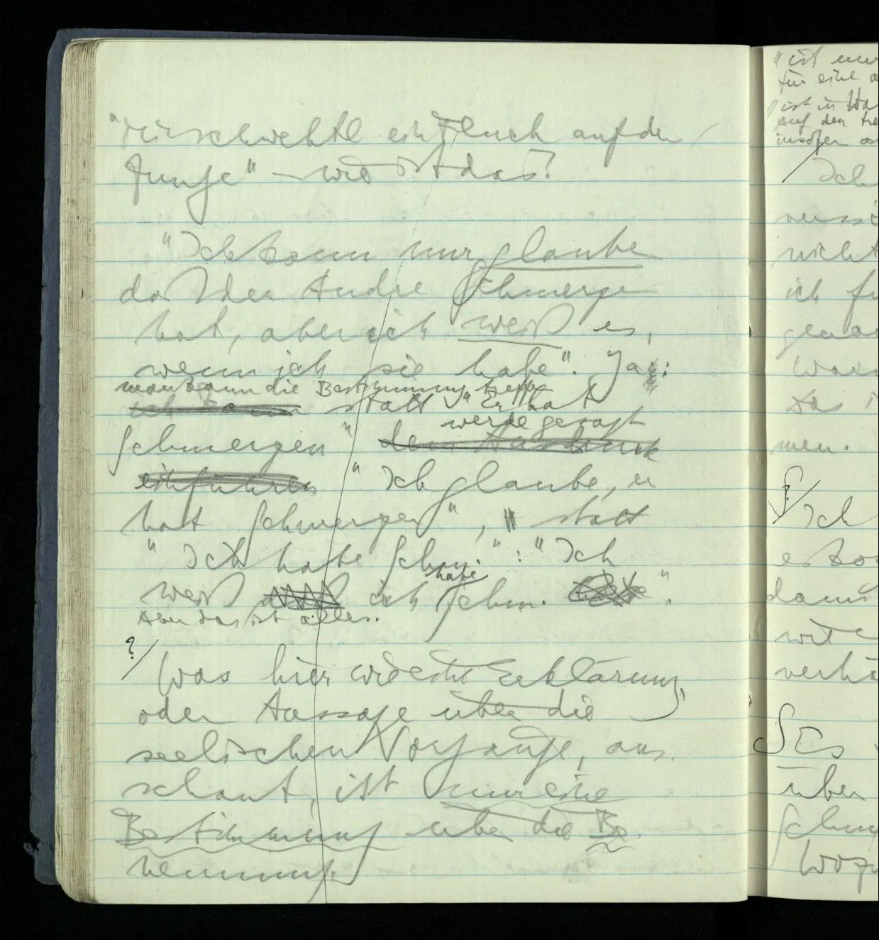 Wenn man sich die Schmerzen des andern nach den eigenen vorstellen muß, dann ist das keine so leichte Sache da ich mir nach den Schmerzen die ich fühle Schmerzen vorstellen muß, die ich nicht fühle. (Und es ist nur irreführend, zu sagen, die Betonung sei hier falsch, & ich hätte mir nur nach Schmerzen, die ich fühle, solche vorzustellen, die ich nicht fühle. Das ursprüngliche Schmerzbenehmen kann auf den Ort der Schmerzen deuten, aber nicht auf eine Person. Die Person, die leidet ist die, welche klagt.)