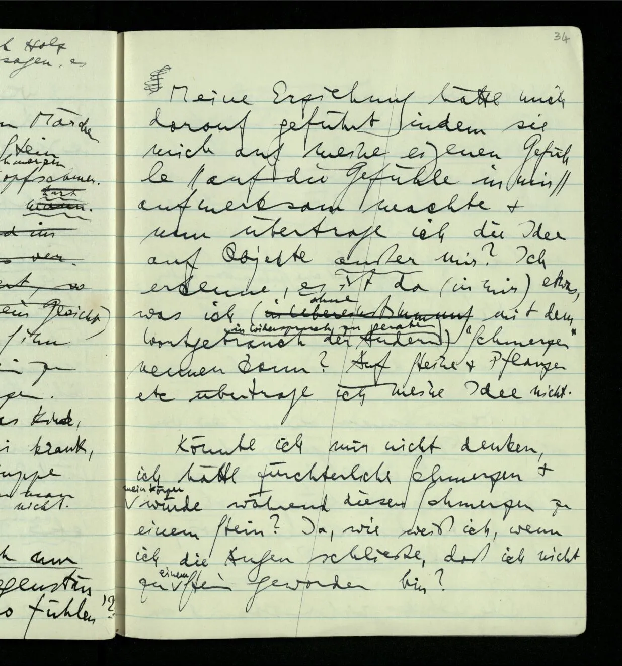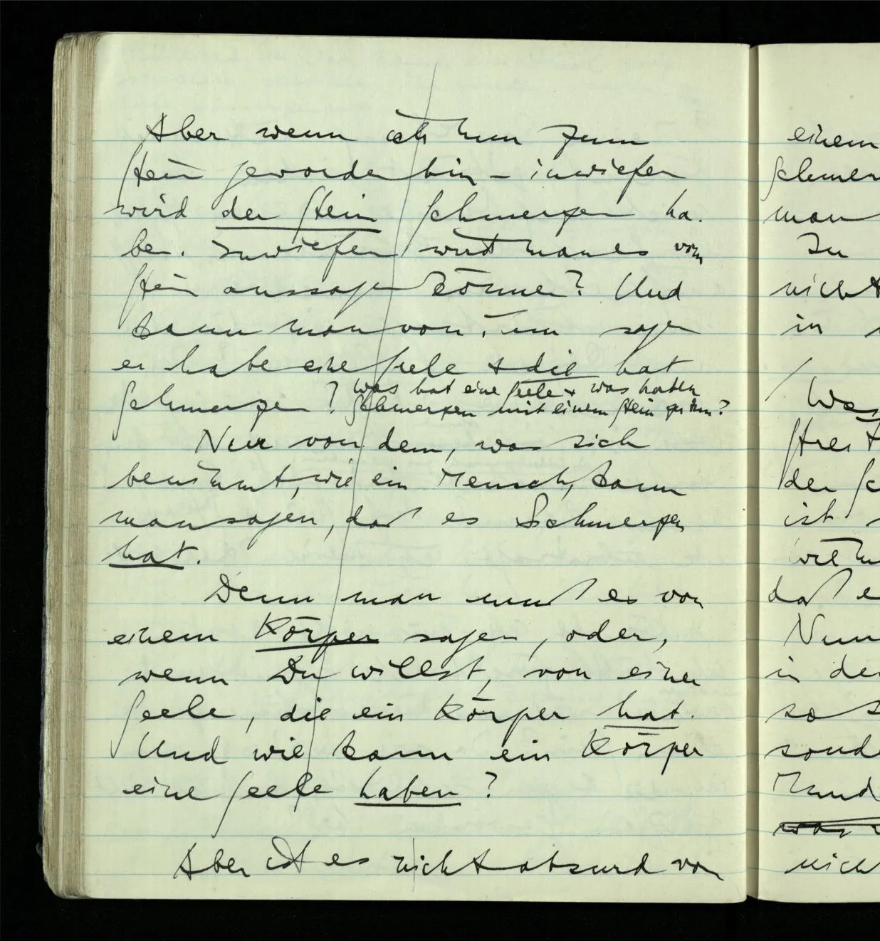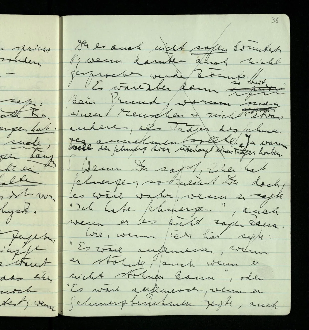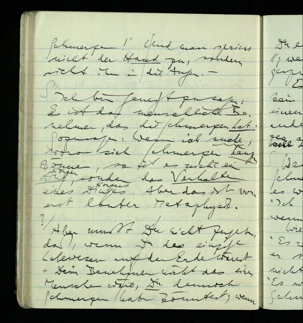 Aber mußt Du nicht zugeben, daß, wenn Du das einzige Lebewesen auf der Erde wärest & Dein Benehmen nicht das eines Menschen wäre, Du dennoch Schmerzen haben könntest; wenn Du es auch nicht sagen könntest. Es wäre aber dann so weit kein Grund, warum man einen Menschen & nicht irgend etwas anderes, als Träger des Schmerzes annehmen sollte. Ja warum soll der Schmerz hier überhaupt einen Träger haben.