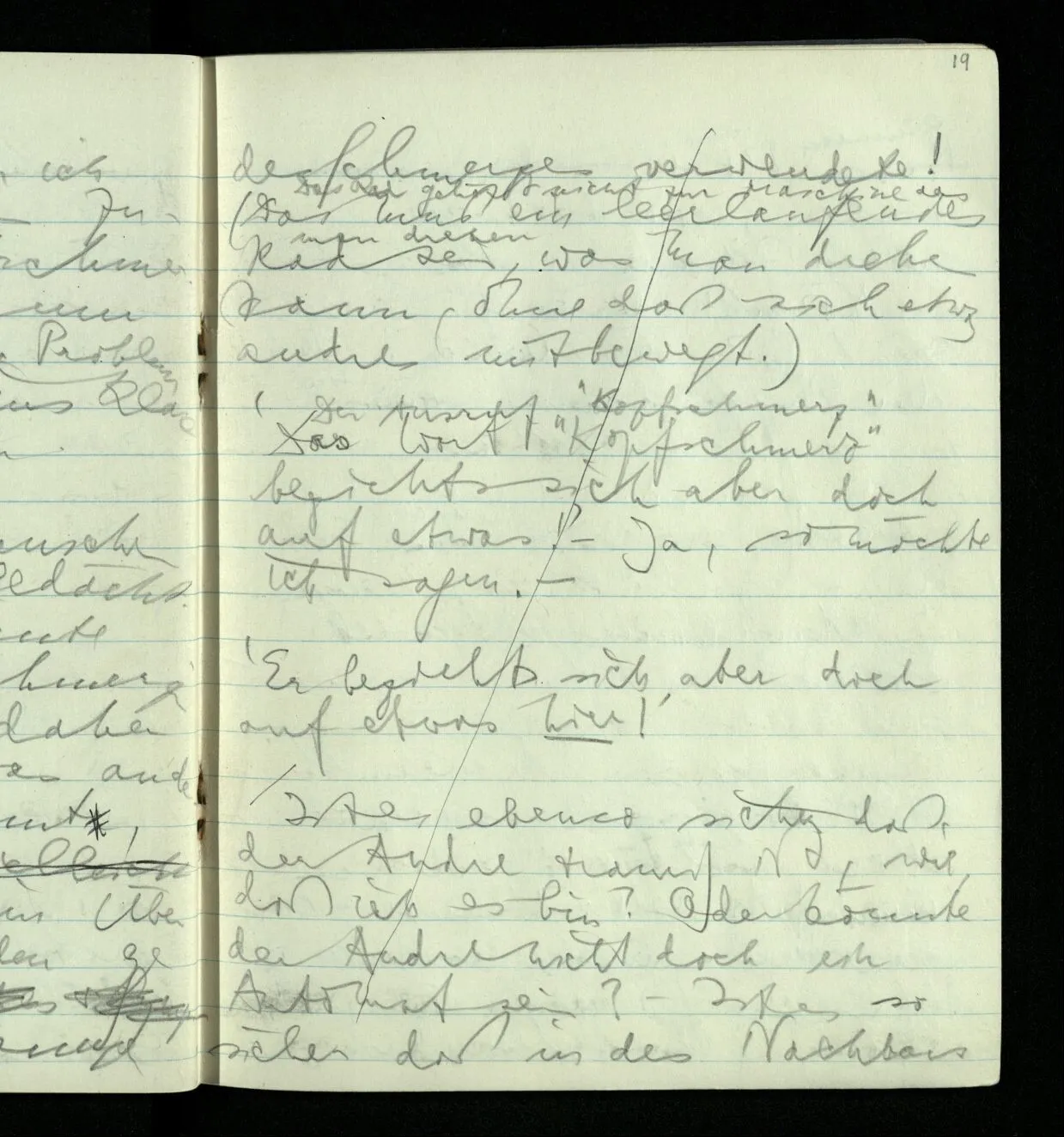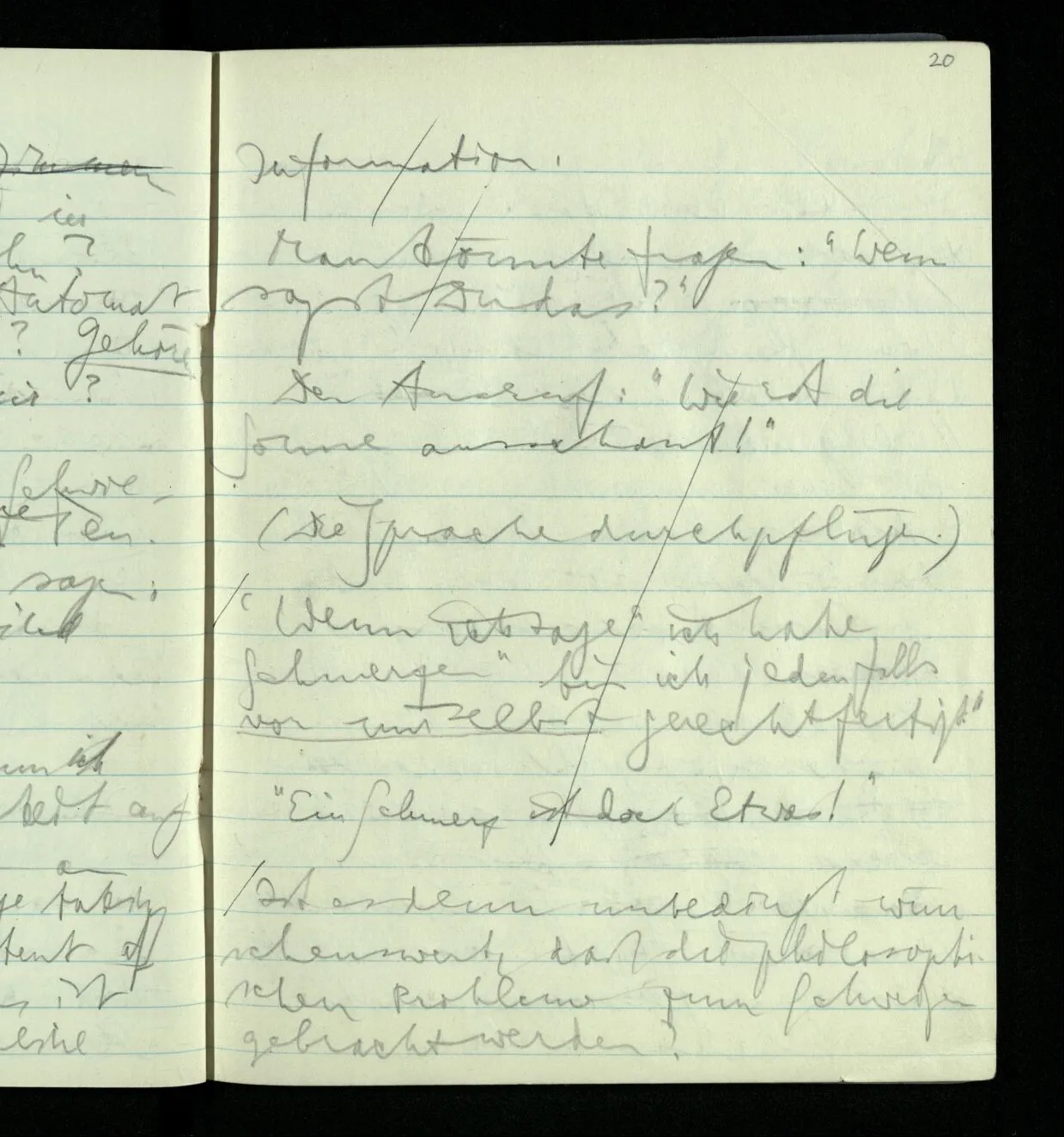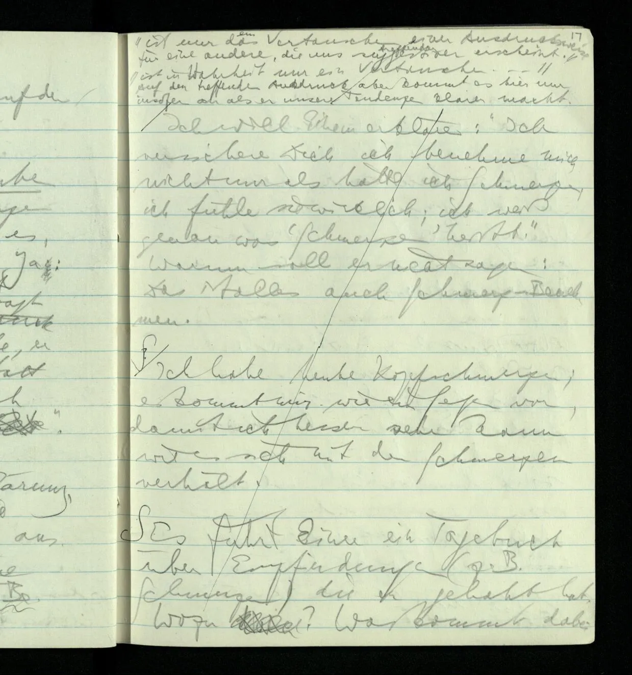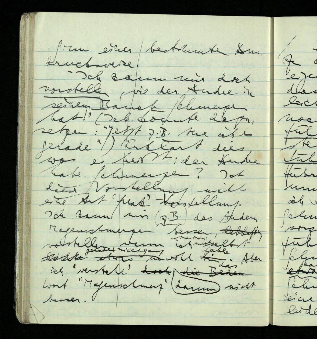 Aber mußt Du nicht zugeben, daß, wenn Du das einzige Lebewesen auf der Erde wärest & Dein Benehmen nicht das eines Menschen wäre, Du dennoch Schmerzen haben könntest; wenn Du es auch nicht sagen könntest. Es wäre aber dann so weit kein Grund, warum man einen Menschen & nicht irgend etwas anderes, als Träger des Schmerzes annehmen sollte. Ja warum soll der Schmerz hier überhaupt einen Träger haben.