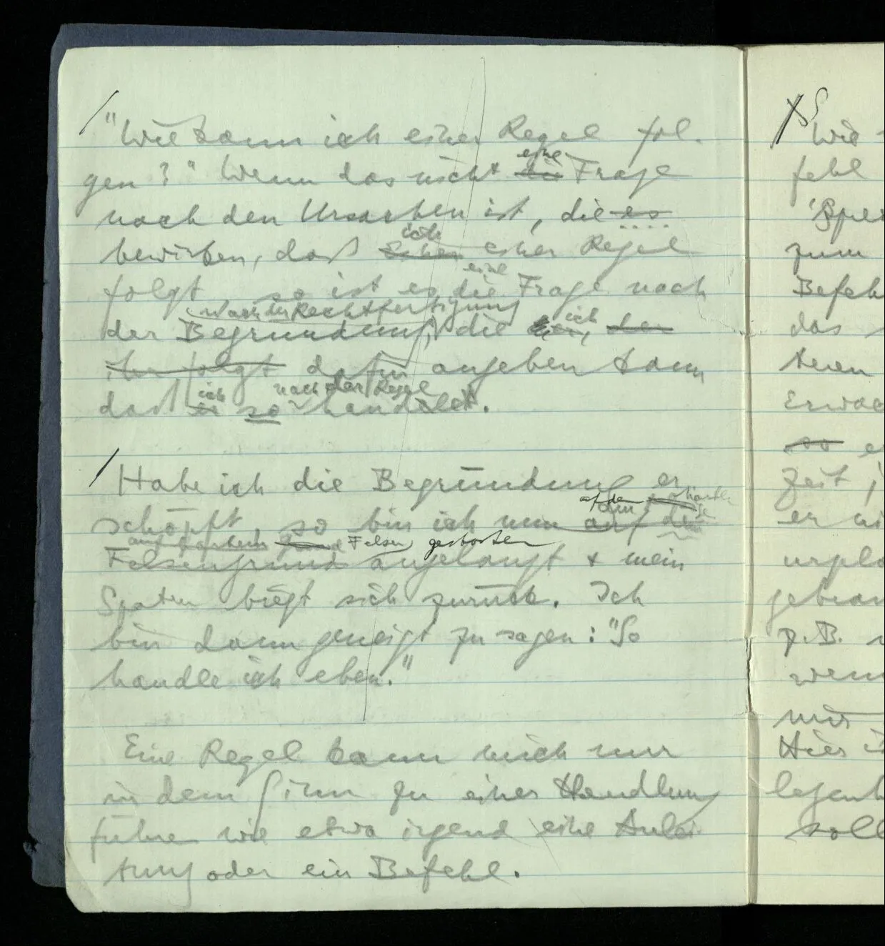 “Wie kann ich einer Regel folgen?” Wenn das nicht eine Frage nach den Ursachen ist, die es bewirken, daß ich einer Regel folge, so ist es die Frage nach der Begründung, nach der Rechtfertigung die ich dafür angeben kann daß ich so nach der Regel handele.