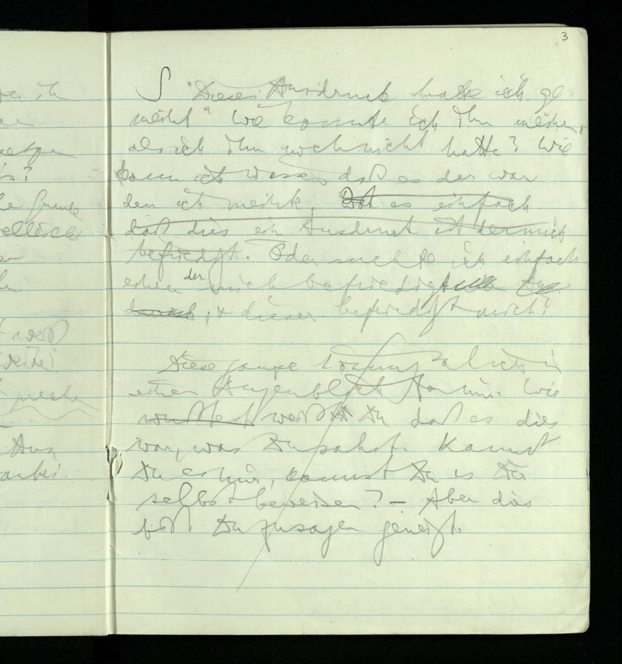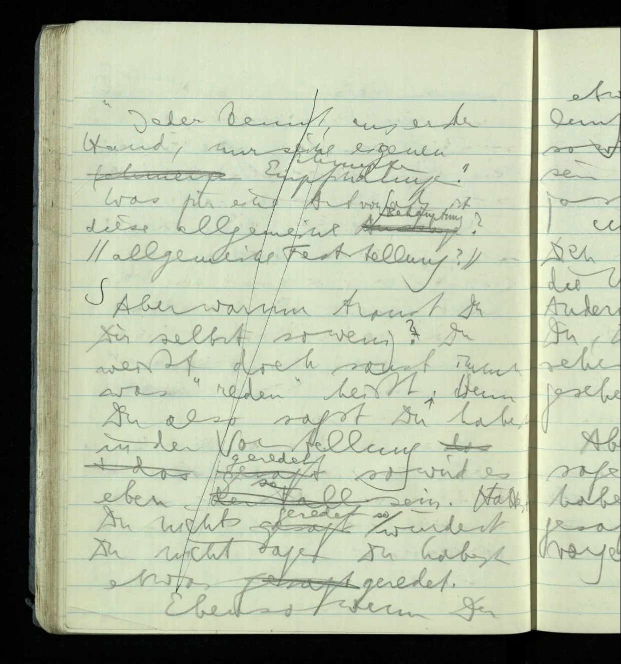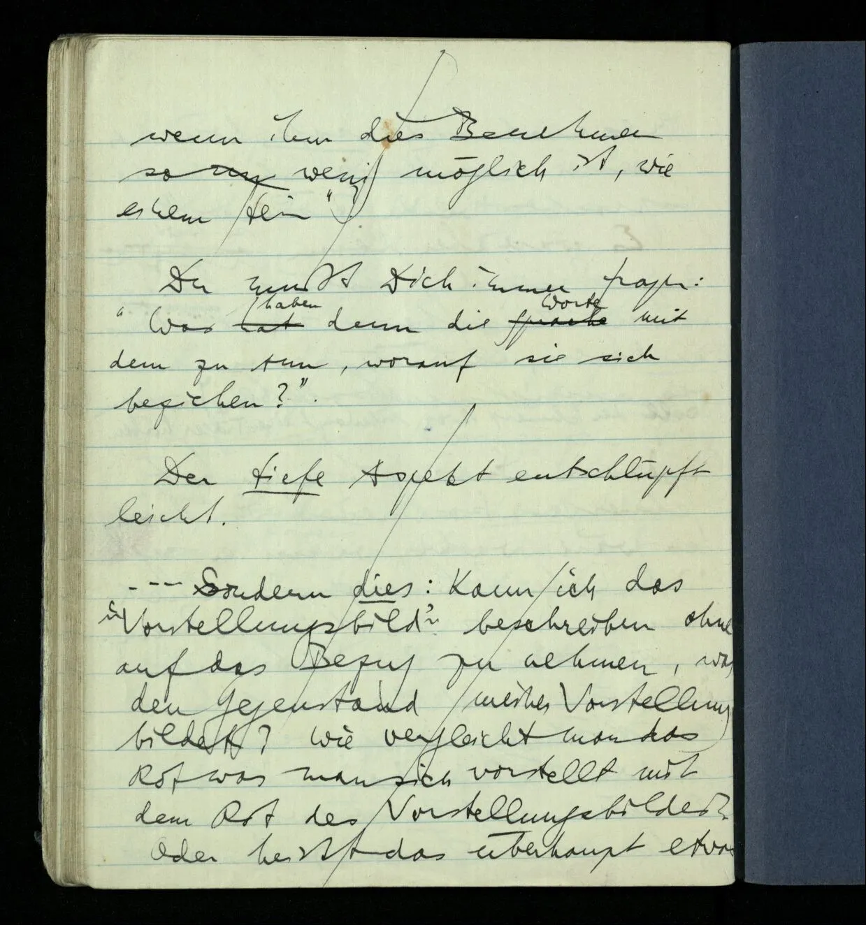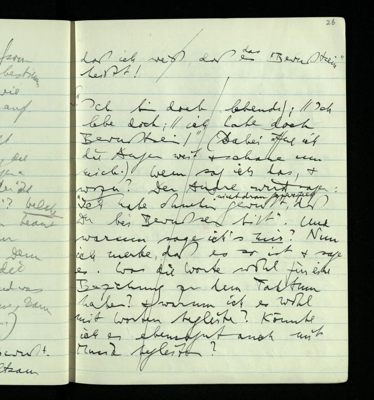 “Ich bin doch lebendig; ich habe doch Bewußtsein!” (Dabei öffne ich die Augen weit & schaue um mich.) Wem sag ich das, & wozu? Der andre wird sagen: “Ich habe ohnehin gewußt, daß Du bei Bewußtsein bist”. Und warum sage ich’s mir? Nun ich merke, daß es so ist & sage es. Was die Worte wohl für eine Beziehung zu dem Faktum haben? & warum ich es wohl mit Worten begleite? Könnte ich es ebensogut auch mit Musik begleiten?