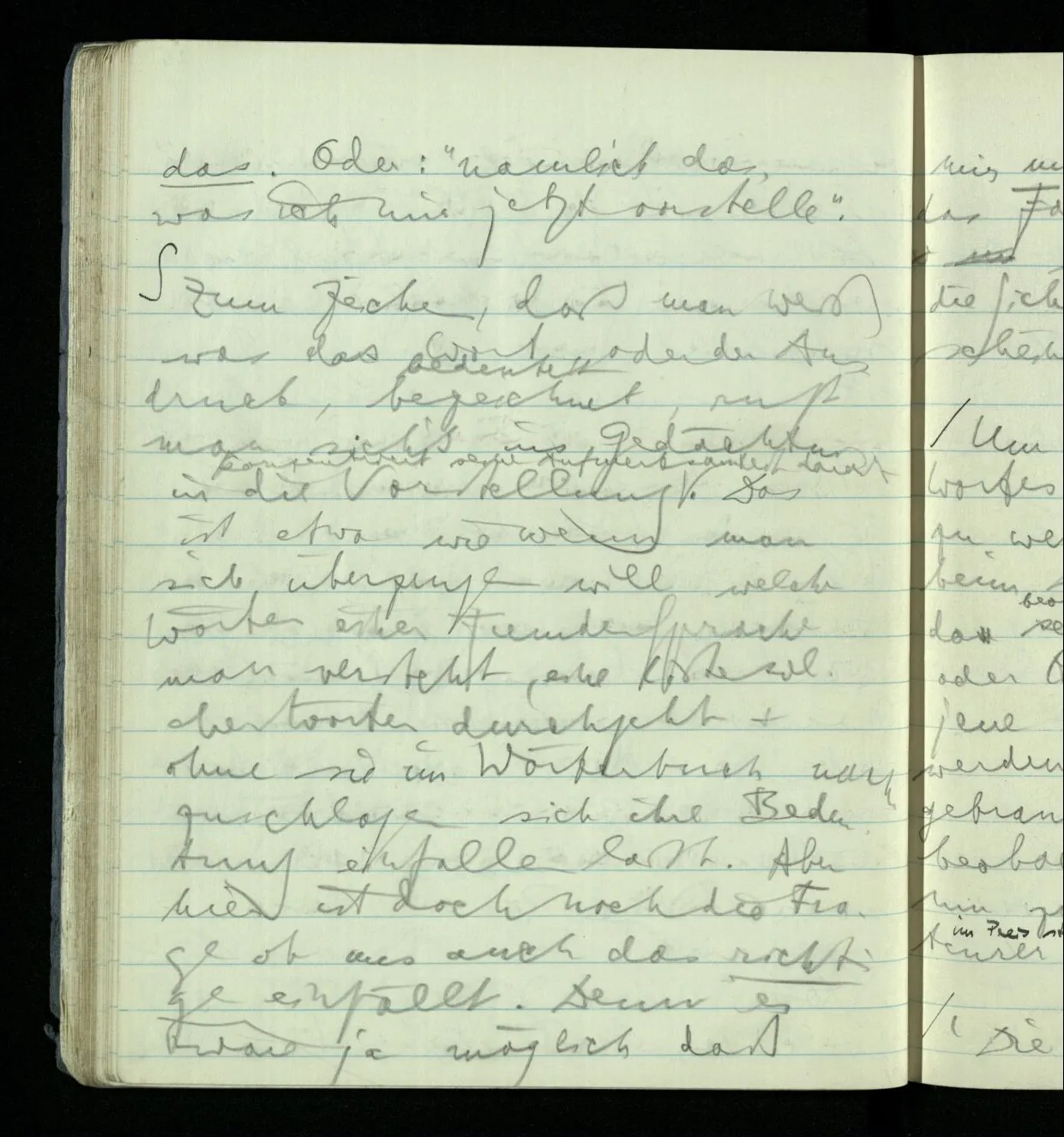 Zum Zeichen, daß man weiß was das Wort, oder der Ausdruck, bezeichnet, ruft man sich’s ins Gedächtnis in die Vorstellung konzentriert seine Aufmerksamkeit darauf. Das ist etwa wie wenn man sich überzeugen will welche Wörter einer fremden Sprache man versteht, eine Liste solcher Wörter durchgeht & ohne sie im Wörterbuch nachzuschlagen sich ihre Bedeutung einfallen läßt. Aber hier ist doch noch die Frage ob uns auch das Richtige einfällt. Denn es wäre ja möglich daß mir mit voller Sicherheit das Falsche einfiele. Und es ist ein Erfahrungssatz, daß die Sicherheit die Richtigkeit wahrscheinlich macht.