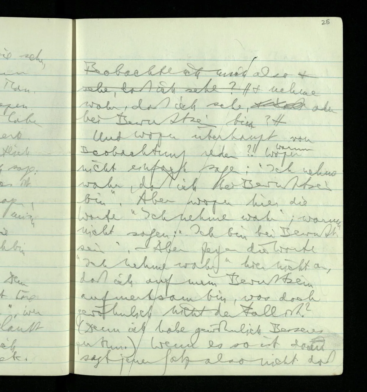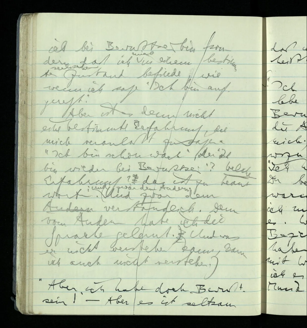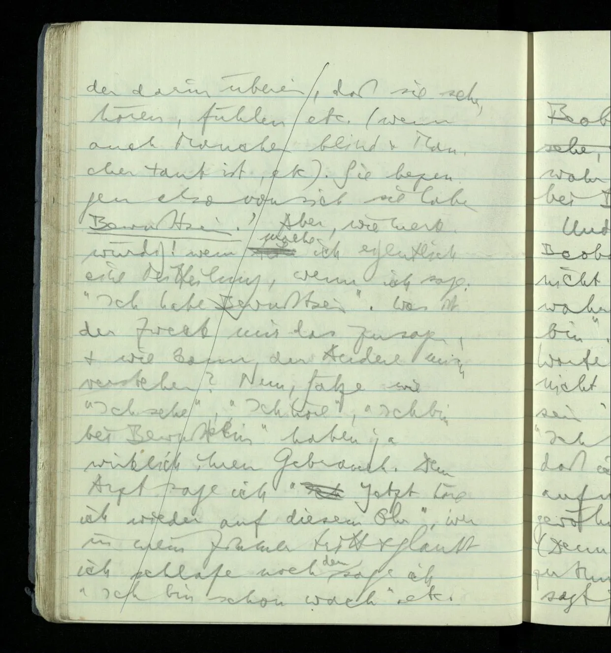 Beobachte ich mich also & nehme wahr, daß ich sehe, aber bei Bewußtsein bin? Und wozu überhaupt von Beobachtung reden?! Wozu nicht einfach sagen: “Ich nehme wahr, daß ich bei Bewußtsein bin”. Aber wozu hier die Worte “Ich nehme wahr”; warum nicht sagen: “Ich bin bei Bewußtsein”. – Aber zeigen die Worte “Ich nehme wahr” hier nicht an, daß ich auf mein Bewußtsein aufmerksam bin, was doch gewöhnlich nicht der Fall ist? (Denn ich habe gewöhnlich Besseres zu tun.) Wenn es so ist dann sagt jener Satz also nicht daß ich bei Bewußtsein bin sondern daß ich mich in einem bestimmten seelischen Zustand befinde, wie wenn ich sage “Ich bin aufgeregt”. Aber ist es denn nicht eine bestimmte Erfahrung, die mich veranlaßt zu sagen “Ich bin schon wach”, oder “Ich bin wieder bei Bewußtsein”? Welche Erfahrung? Das ist zu beantworten; und zwar dem andern. (Und zwar dem andern verständlich. Denn vom andern habe ich die Sprache gelernt. Und was er nicht verstehen kann, kann ich auch nicht verstehen.)