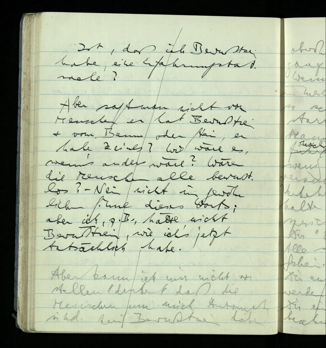 Aber sagt man nicht vom Menschen er hat Bewußtsein & vom Baum oder Stein, er habe keines? Wie wäre es, wenn’s anders wäre? Wären die Menschen alle bewußtlos? – Nein nicht im gewöhnlichen Sinne dieses Worts; aber ich, z.B., hätte nicht Bewußtsein, wie ich’s jetzt tatsächlich habe.