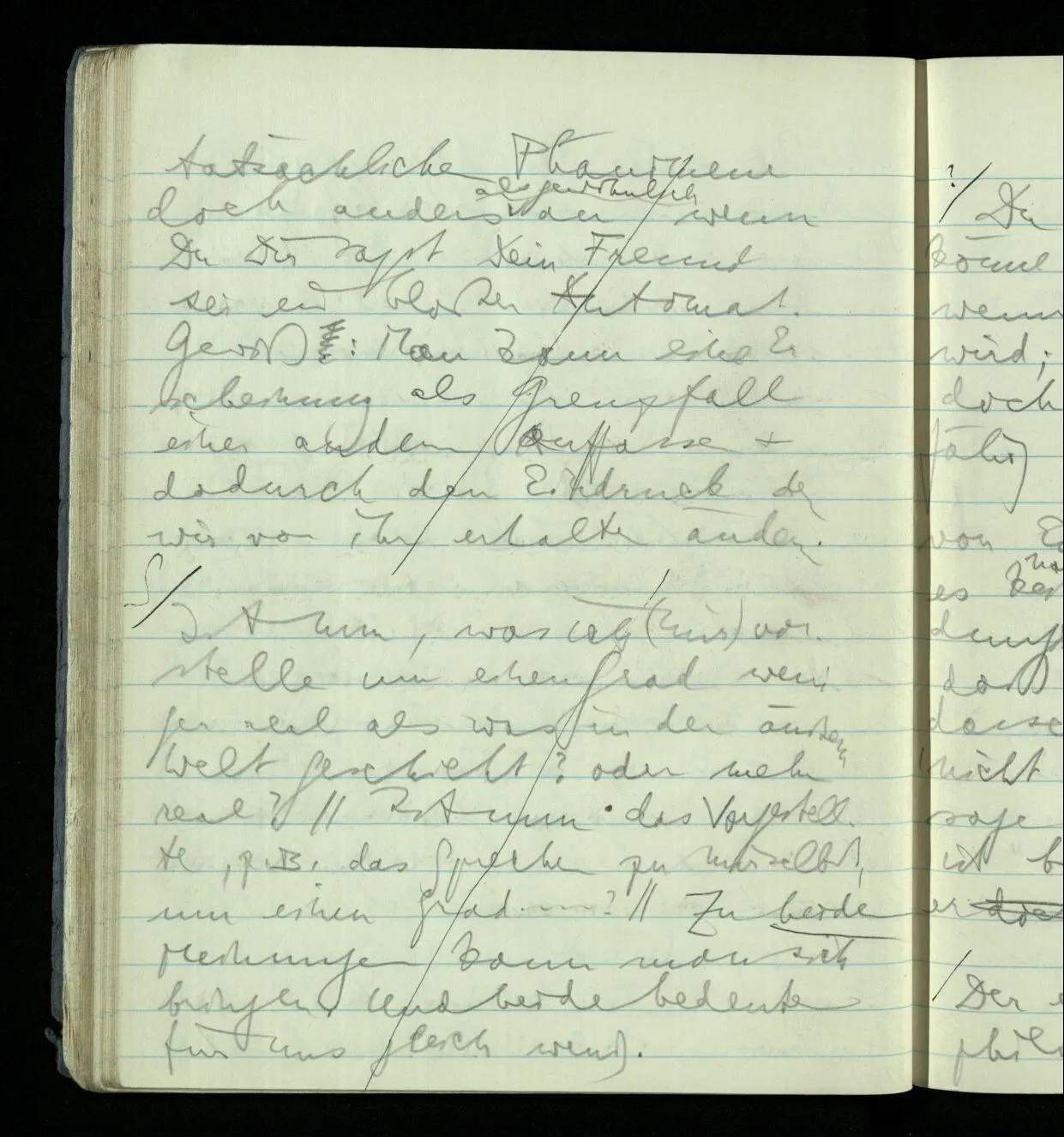 Aber kann ich mir nicht vorstellen daß die Menschen um mich Automaten sind kein Bewußtsein haben obwohl ihre Handlungsweise ganz unverändert bleibt? Wenn ich mir’s jetzt – allein in meinem Zimmer sitzend – vorstelle so sehe ich die Leute mit starrem Blick (etwa wie in Trance) ihren Verrichtungen nachgehen, & die Idee ist etwa ein wenig unheimlich. Aber nun versuch einmal im gewöhnlichen Verkehr an dieser Idee festzuhalten. Wenn Du mit jemandem sprichst, arbeitest, etc. sage Dir “Er ist ein bloßer Automat. Alle seine Lebendigkeit ist bloß Schein.” Und diese Worte werden Dir entweder gänzlich nichtssagend werden, oder Du wirst etwa in Dir ein unheimliches Gefühl heraufbeschwören. Aber Du siehst Dir tatsächliche Phänomene doch anders als gewöhnlich an wenn Du Dir sagst Dein Freund sei ein bloßer Automat. Gewiß: Man kann eine Erscheinung als Grenzfall einer andern auffassen & dadurch den Eindruck den wir von ihr erhalten ändern.