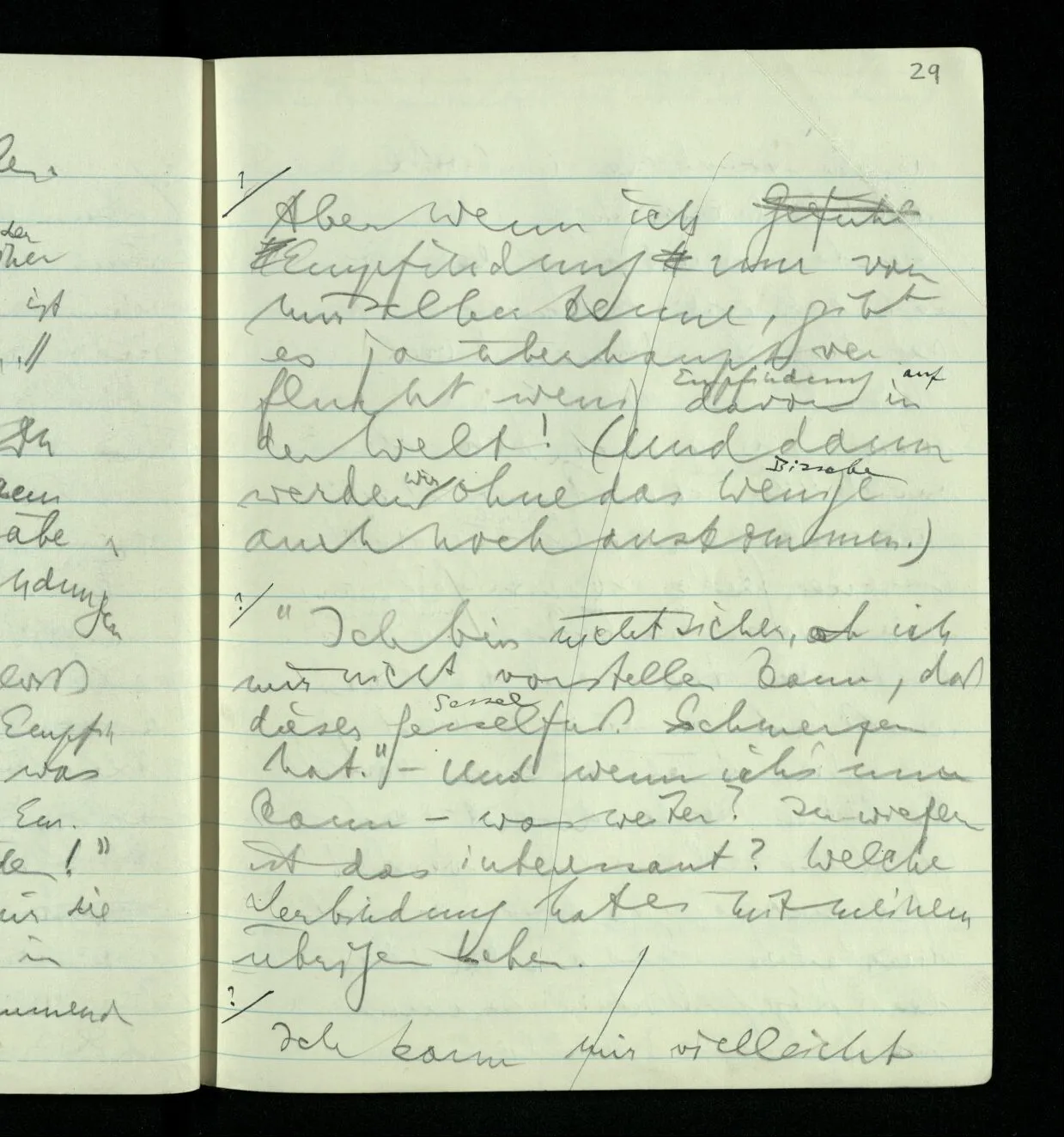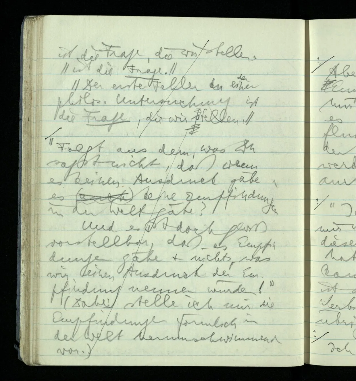 “Folgt aus dem, was Du sagst nicht, daß wenn es keinen Ausdruck gäbe, es keine Empfindungen in der Welt gäbe? Und es ist doch gewiß vorstellbar, daß es Empfindungen gäbe & nichts, was wir einen Ausdruck der Empfindung nennen würden!” (Dabei stelle ich mir die Empfindungen förmlich in der Welt herumschwimmend vor.)