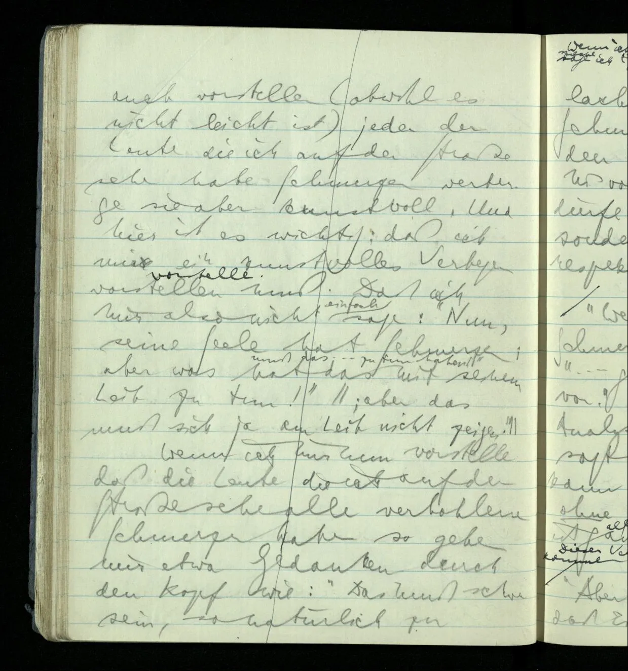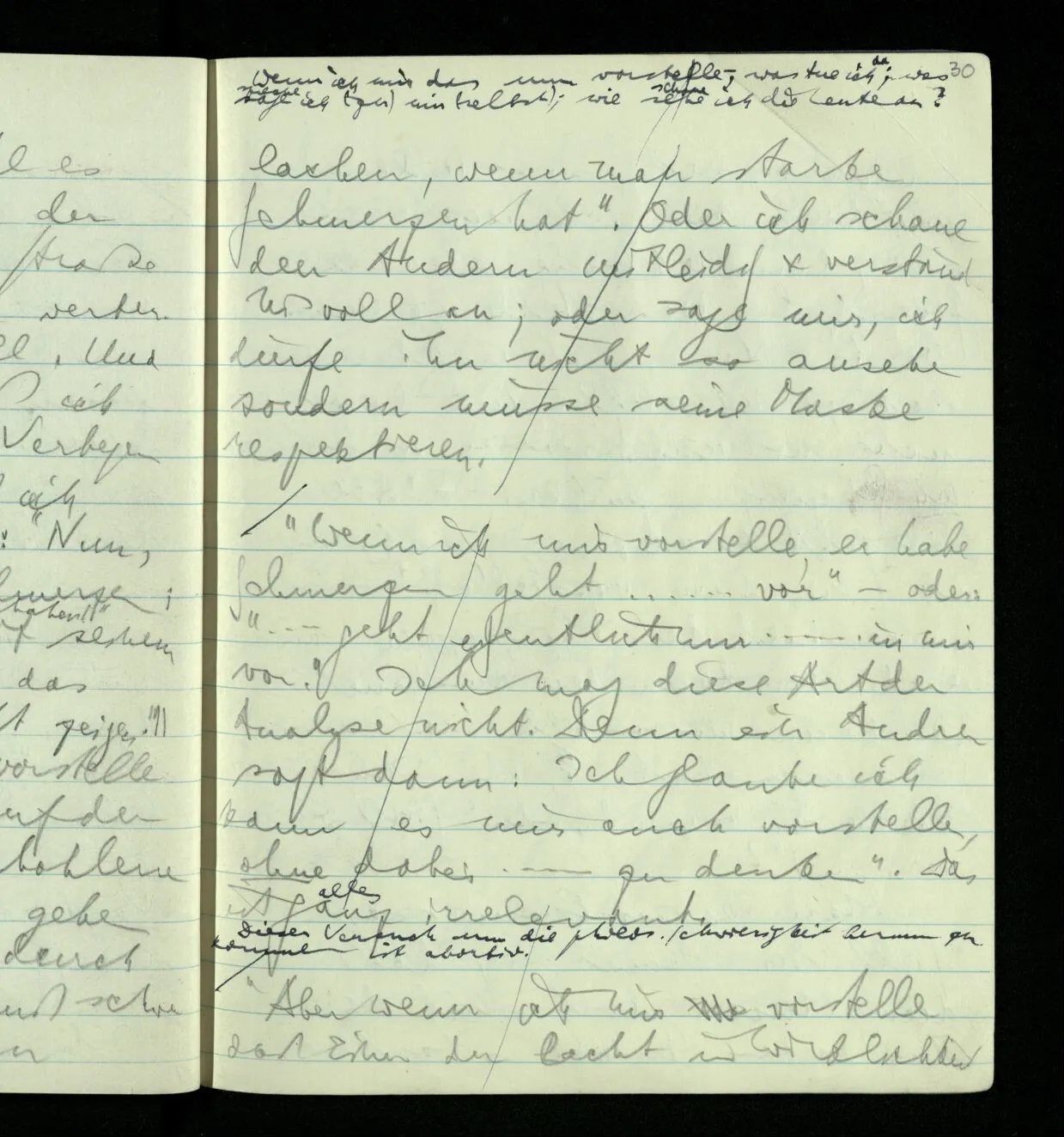 Ich kann mir vielleicht auch vorstellen (obwohl es nicht leicht ist) jeder der Leute die ich auf der Straße sehe habe Schmerzen verberge sie aber kunstvoll. Und hier ist es wichtig: daß ich mir ein kunstvolles Verbergen vorstellen muß. Daß ich mir also nicht einfach sage: “Nun, seine Seele hat Schmerzen; aber was hat das mit seinem Leib zu tun!” Wenn ich mir nun vorstelle daß die Leute die ich auf der Straße sehe alle verhohlene Schmerzen haben so gehen mir etwa Gedanken durch den Kopf wie: “Das muß schwer sein, so natürlich zu lachen, wenn man starke Schmerzen hat”. Wenn ich mir das nun vorstelle, was tue ich; was sage ich (zu) mir (selbst); wie sehe ich die Leute an? Oder ich schaue den andern mitleidig & verständnisvoll an; oder sage mir, ich dürfe ihn nicht so ansehen sondern müsse seine Maske respektieren.