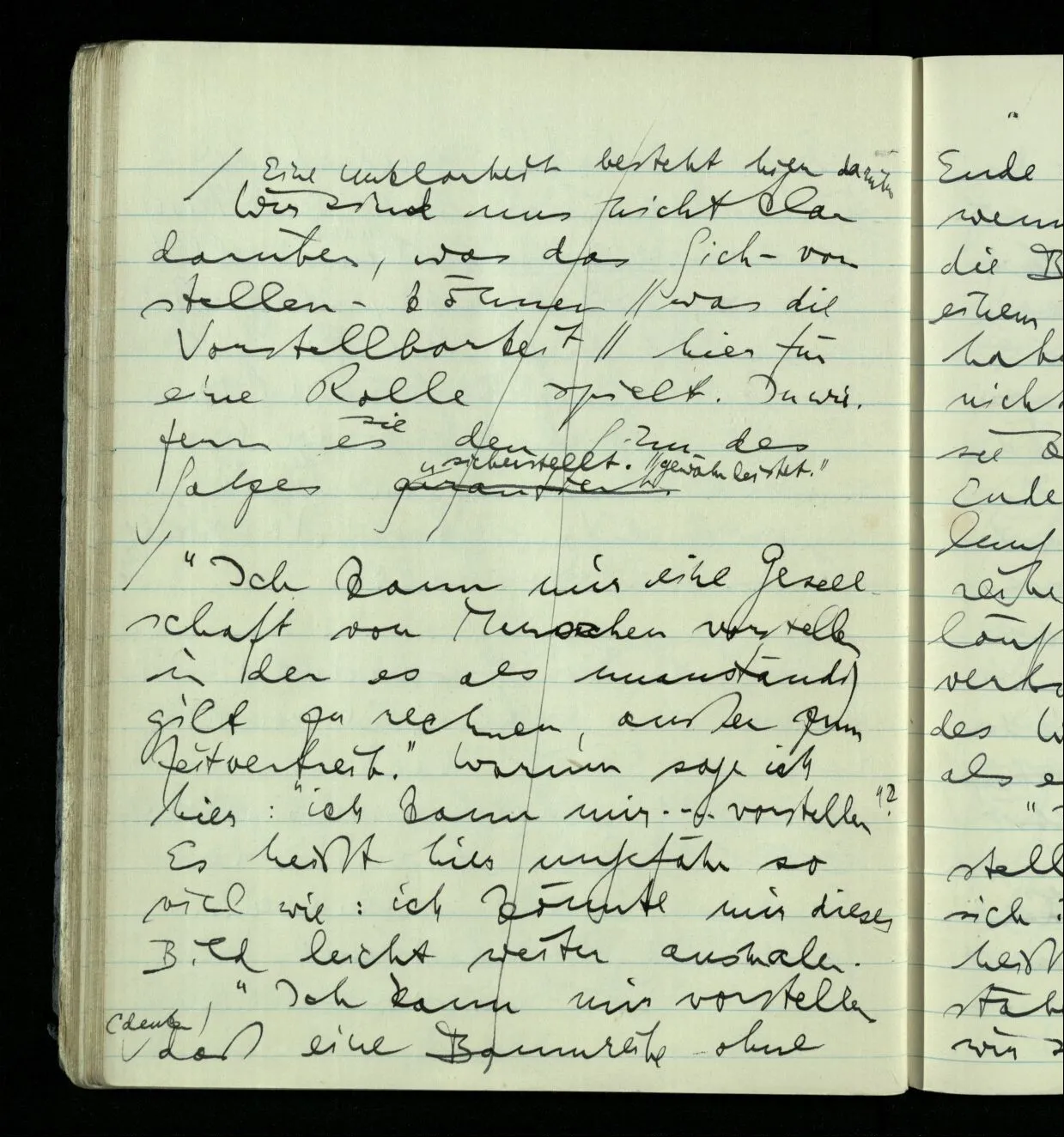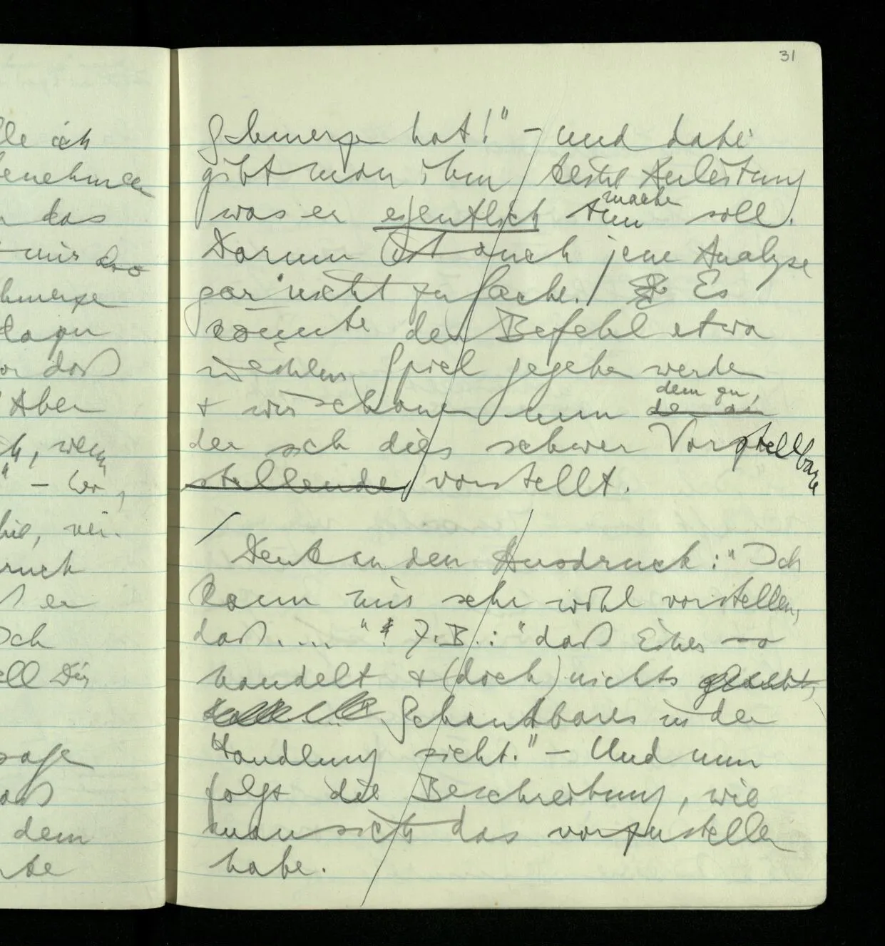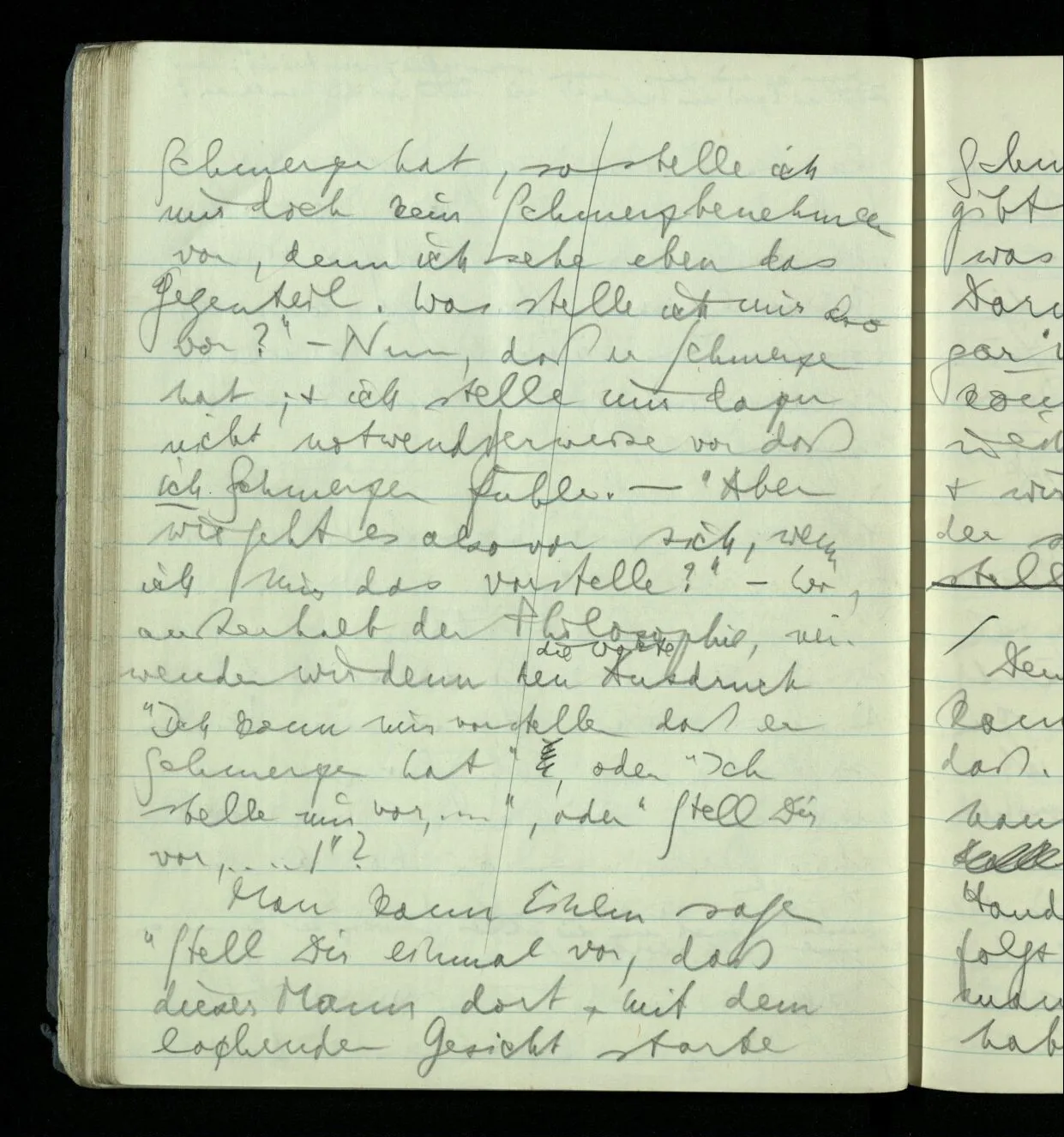 “Aber wenn ich mir vorstelle daß einer der lacht in Wirklichkeit Schmerzen hat, so stelle ich mir doch kein Schmerzbenehmen vor, denn ich sehe eben das Gegenteil. Was stelle ich mir also vor?” – Nun, daß er Schmerzen hat; & ich stelle mir dazu nicht notwendigerweise vor daß ich Schmerzen fühle. – “Aber wie geht es also vor sich, wenn ich mir das vorstelle?” – Wo außerhalb der Philosophie, verwenden wir denn den Ausdruck “Ich kann mir vorstellen daß er Schmerzen hat”, oder “Ich stelle mir vor, …”, oder “Stell Dir vor, …!”? Man kann einem sagen “Stell Dir einmal vor, daß dieser Mann dort mit dem lachenden Gesicht starke Schmerzen hat!”– und dabei gibt man ihm keine Anleitung was er eigentlich tun soll. Darum ist auch jene Analyse gar nicht zur Sache. Es könnte der Befehl etwa in einem Spiel gegeben werden & wir schauen nun dem zu, der sich dies schwer Vorstellbare vorstellt.