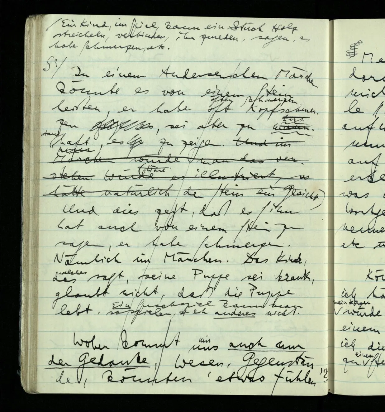 In einem Andersenschen Märchen könnte es von einem Stein heißen, er habe oft Kopfschmerzen, sei aber zu standhaft, es zu zeigen. (Würde es illustriert, so hätte natürlich der Stein ein Gesicht.) Und dies zeigt, daß es Sinn hat auch von einem Stein zu sagen, er habe Schmerzen. Nämlich im Märchen. Das Kind, das sagt, seine Puppe sei krank, glaubt nicht, daß die Puppe lebt. Ein Sprachspiel kann man so spielen, & ein anderes nicht.