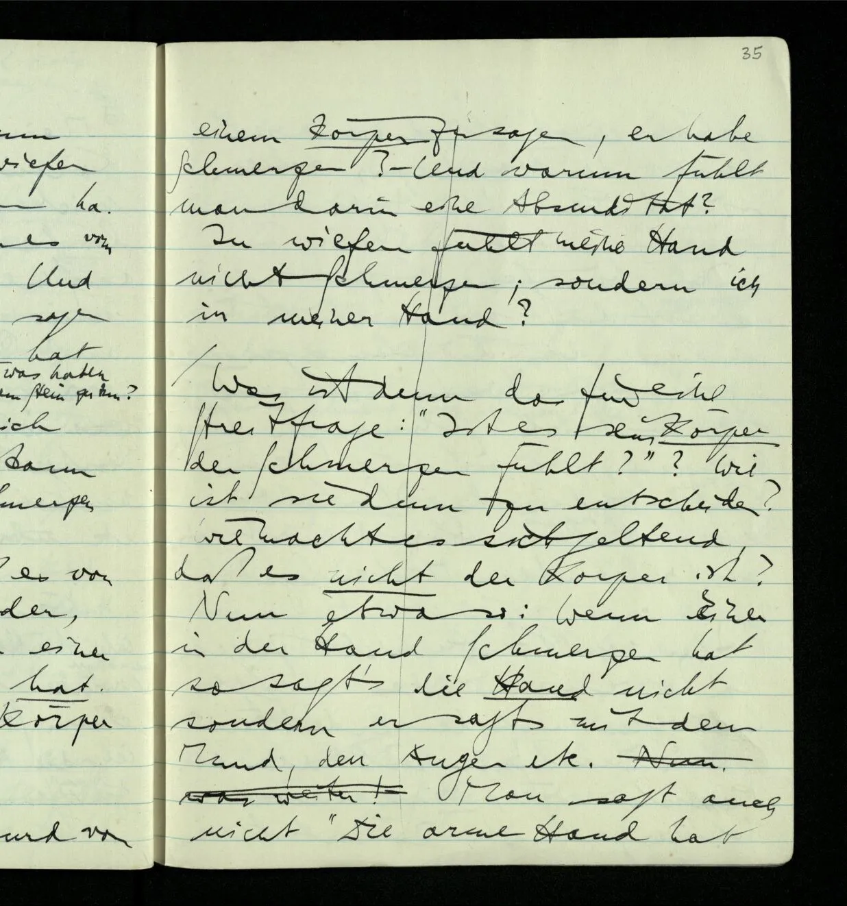 Was ist denn das für eine Streitfrage: “Ist es sein Körper der Schmerzen fühlt?” Wie ist sie denn zu entscheiden? Wie macht es sich geltend, daß es nicht der Körper ist? Nun etwa so: Wenn einer in der Hand Schmerzen hat so sagt’s die Hand nicht sondern er sagt’s mit dem Mund, den Augen etc. Man sagt auch nicht “Die arme Hand hat Schmerzen!” Und man spricht nicht der Hand zu, sondern sieht ihm in die Augen. –