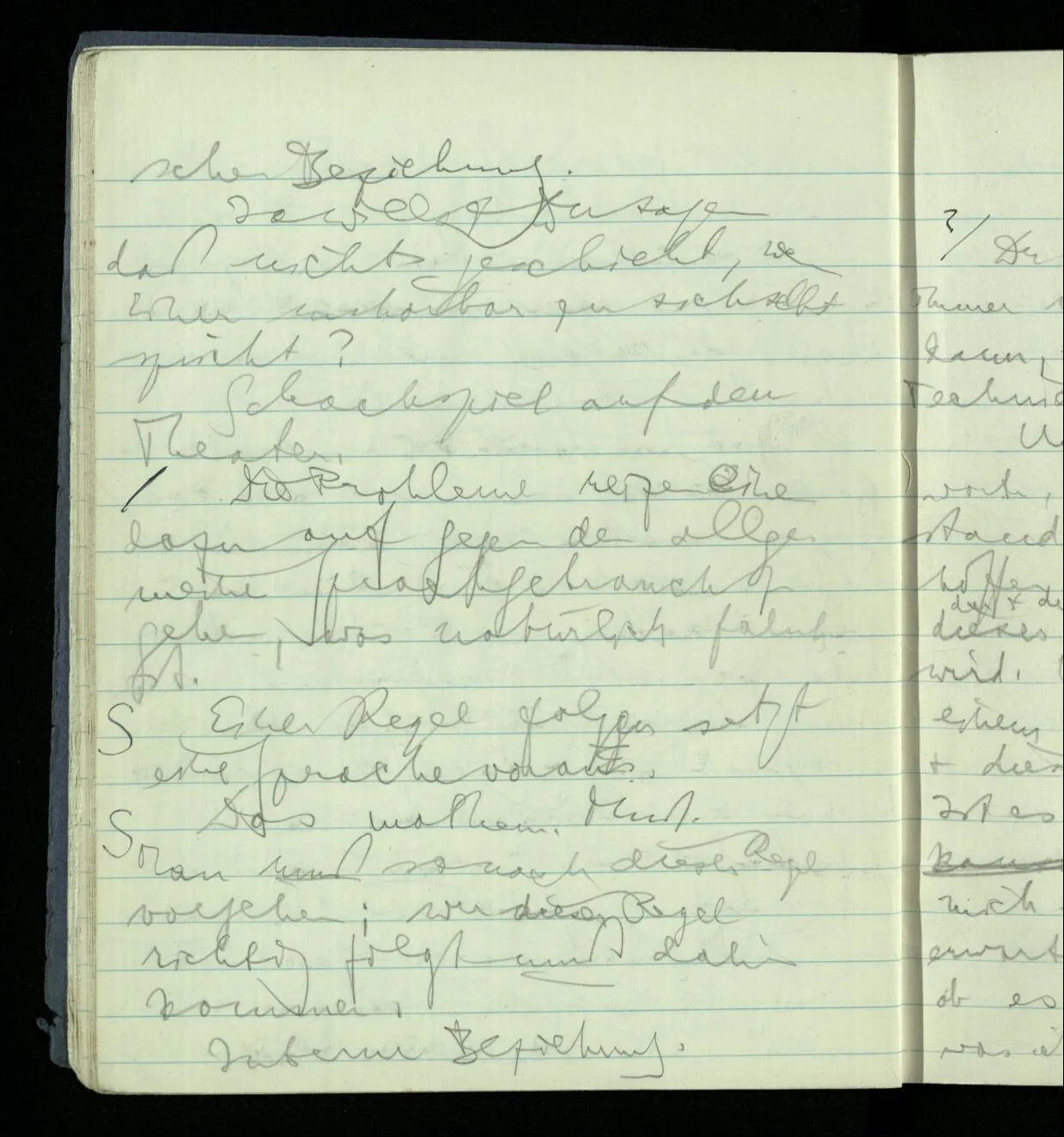 Wie ist es wenn man zu sich selber unhörbar spricht oder liest? Ich weiß doch daß sich meine Worte auf ein Erlebnis beziehen! Aber wie beziehen sich Worte auf ein Erlebnis. Wie meine ich mit Worten ein Erlebnis. Wie meine ich mit Worten irgendetwas. “Worte beziehen sich auf ein Ereignis.” Die Idee der psychologischen Beziehung. Ja willst Du sagen daß nichts geschieht, wenn einer unhörbar zu sich selbst spricht? Schachspiel auf dem Theater.
