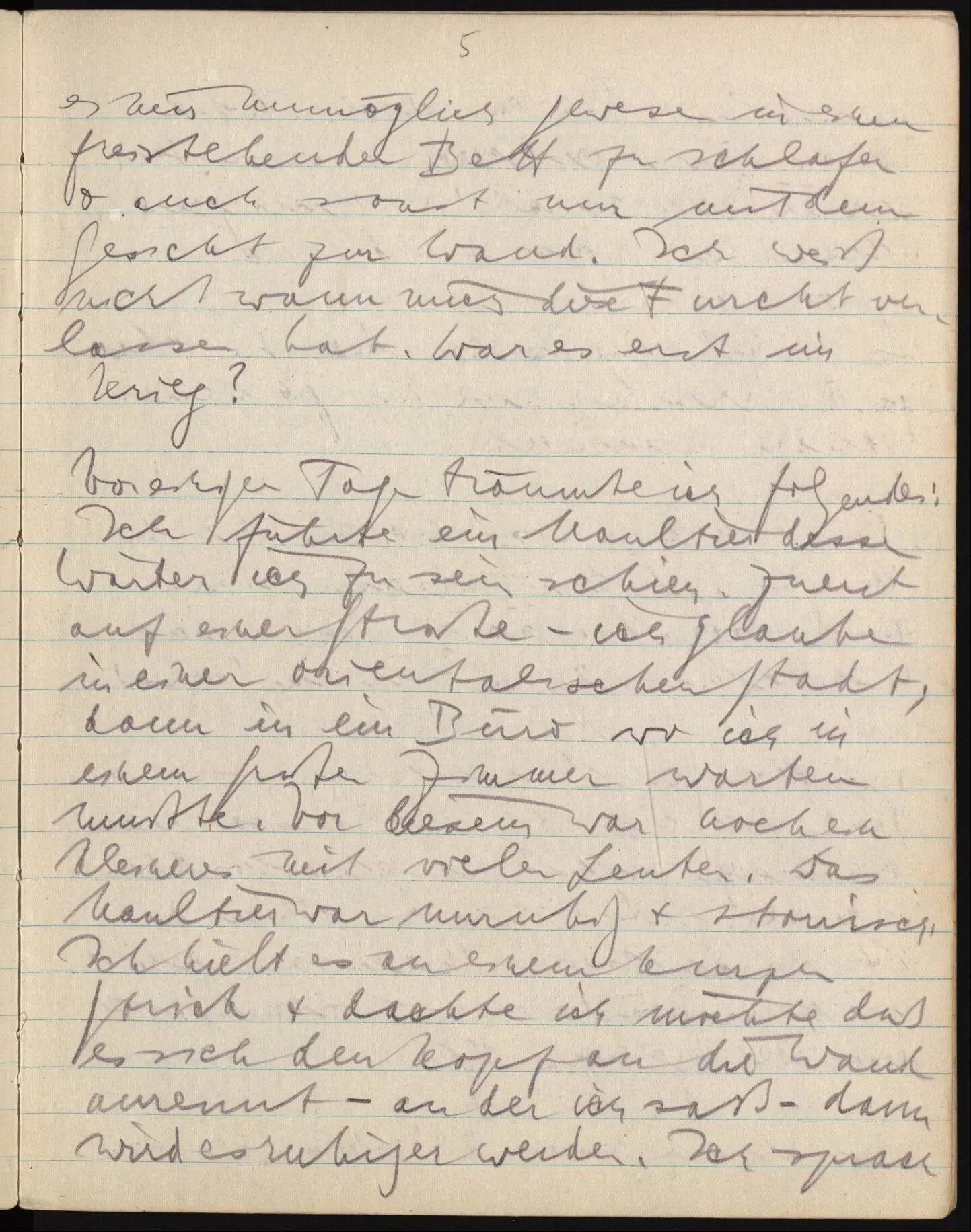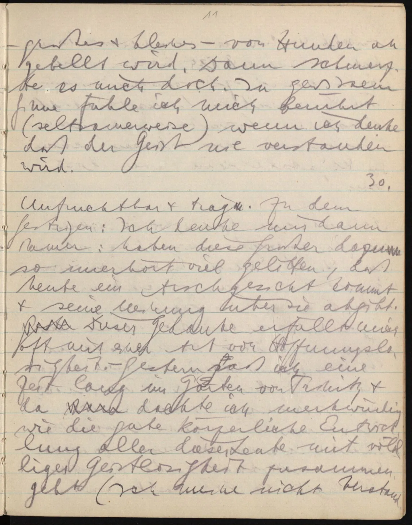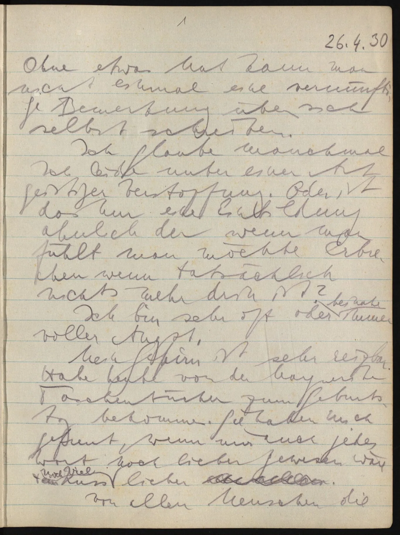 27.04.1930 Bis etwa zu meinem 23ten Lebensjahr wäre es mir unmöglich gewesen in einem freistehenden Bett zu schlafen & auch sonst nur mit dem Gesicht zur Wand. Ich weiß nicht wann mich diese Furcht verlassen hat. War es erst im Krieg?