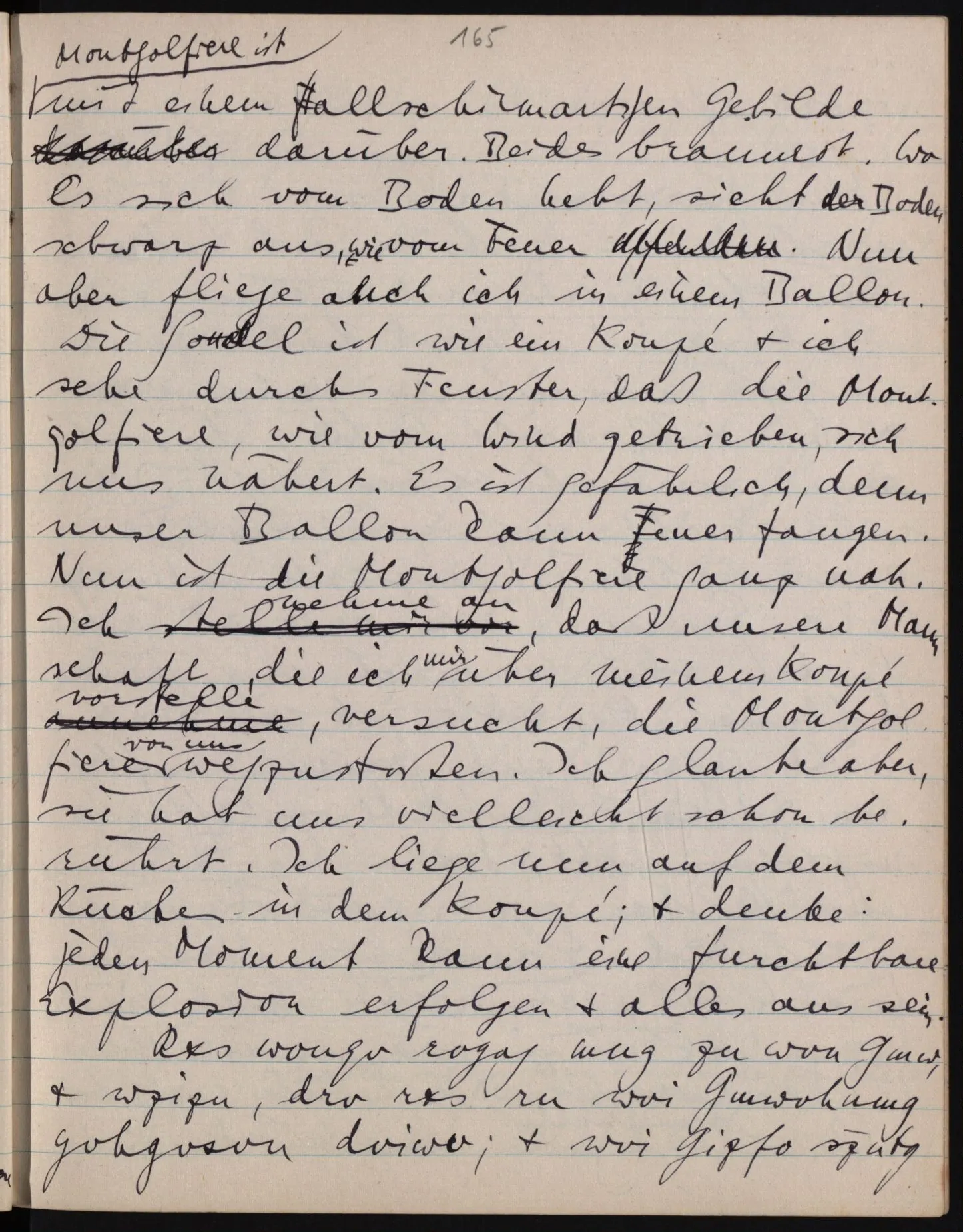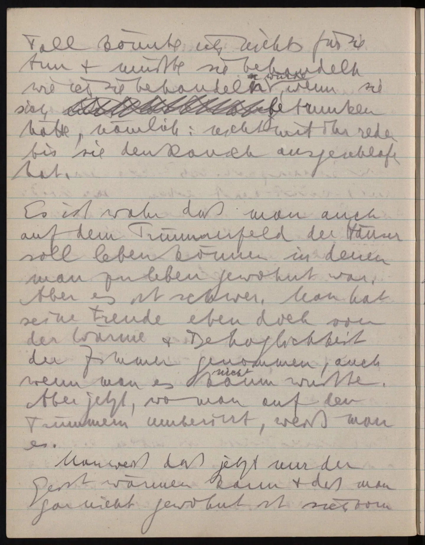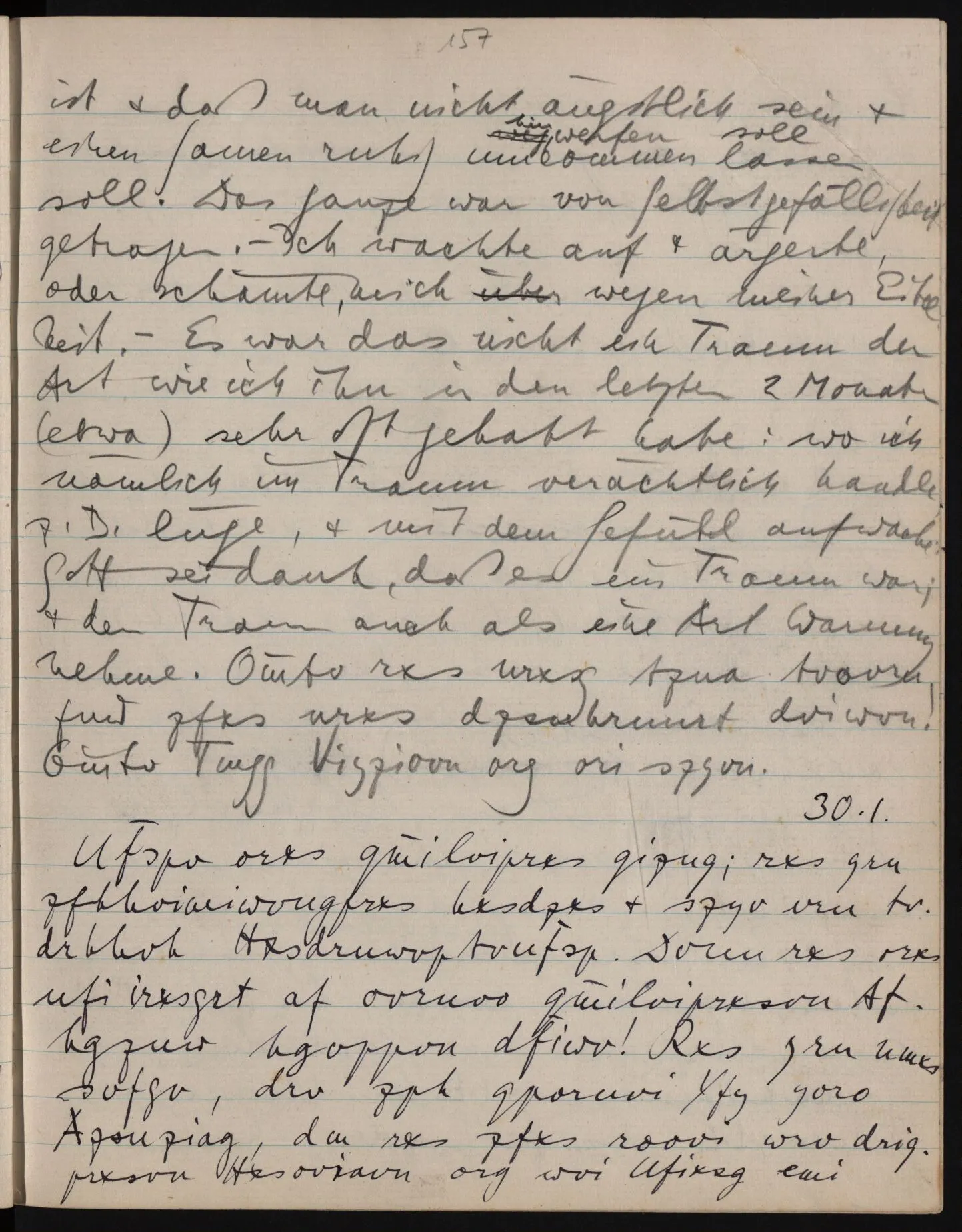 27.04.1930 Bis etwa zu meinem 23ten Lebensjahr wäre es mir unmöglich gewesen in einem freistehenden Bett zu schlafen & auch sonst nur mit dem Gesicht zur Wand. Ich weiß nicht wann mich diese Furcht verlassen hat. War es erst im Krieg?