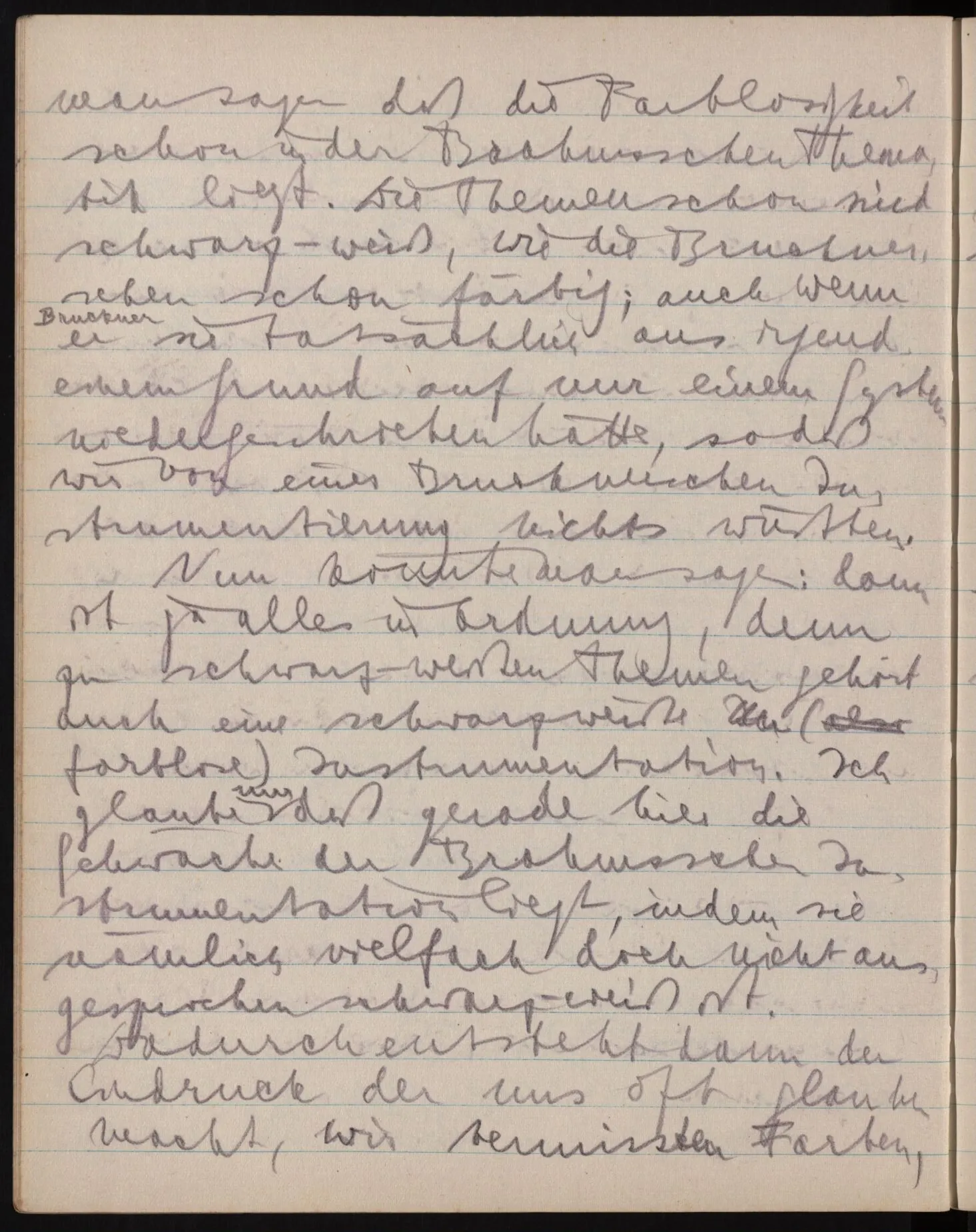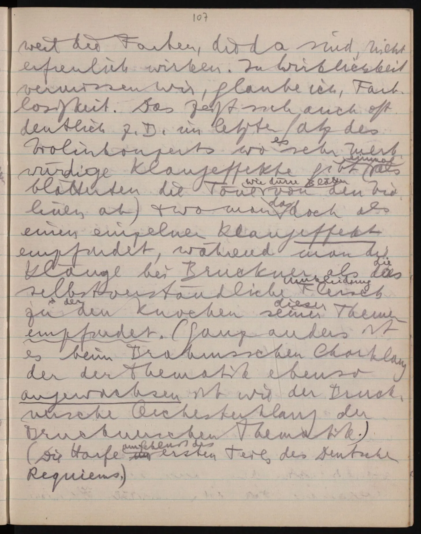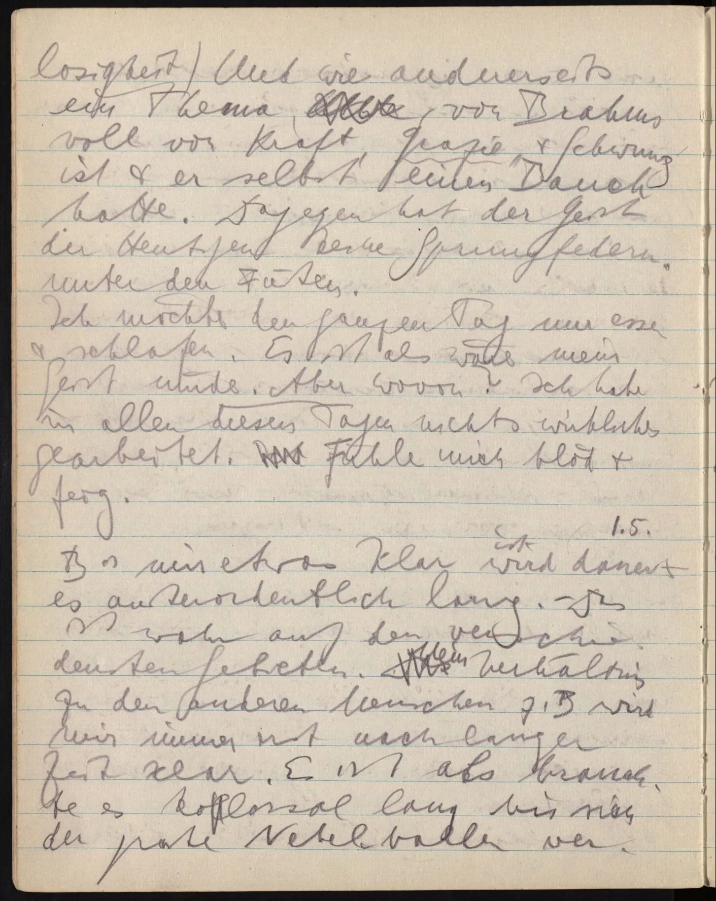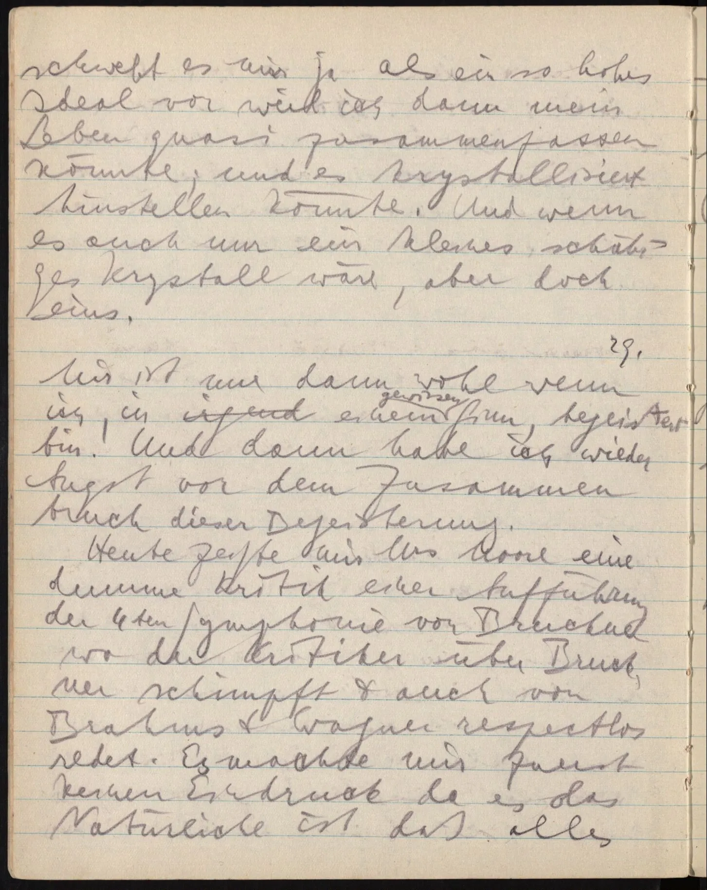 29.04.1930 Mir ist nur dann wohl wenn ich, in einem gewissen Sinn, begeistert bin. Und dann habe ich wieder Angst vor dem Zusammenbruch dieser Begeisterung. Heute zeigte mir Mrs Moore eine dumme Kritik einer Aufführung der 4ten Symphonie von Bruckner wo der Kritiker über Bruckner schimpft & auch von Brahms & Wagner respektlos redet. Es machte mir zuerst keinen Eindruck da es das Natürliche ist daß alles – großes & kleines – von Hunden angebellt wird. Dann schmerzte es mich doch. In gewissem Sinne fühle ich mich berührt (seltsamerweise) wenn ich denke daß der Geist nie verstanden wird.