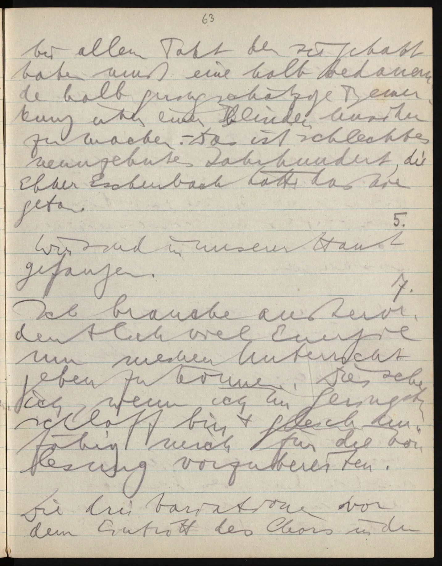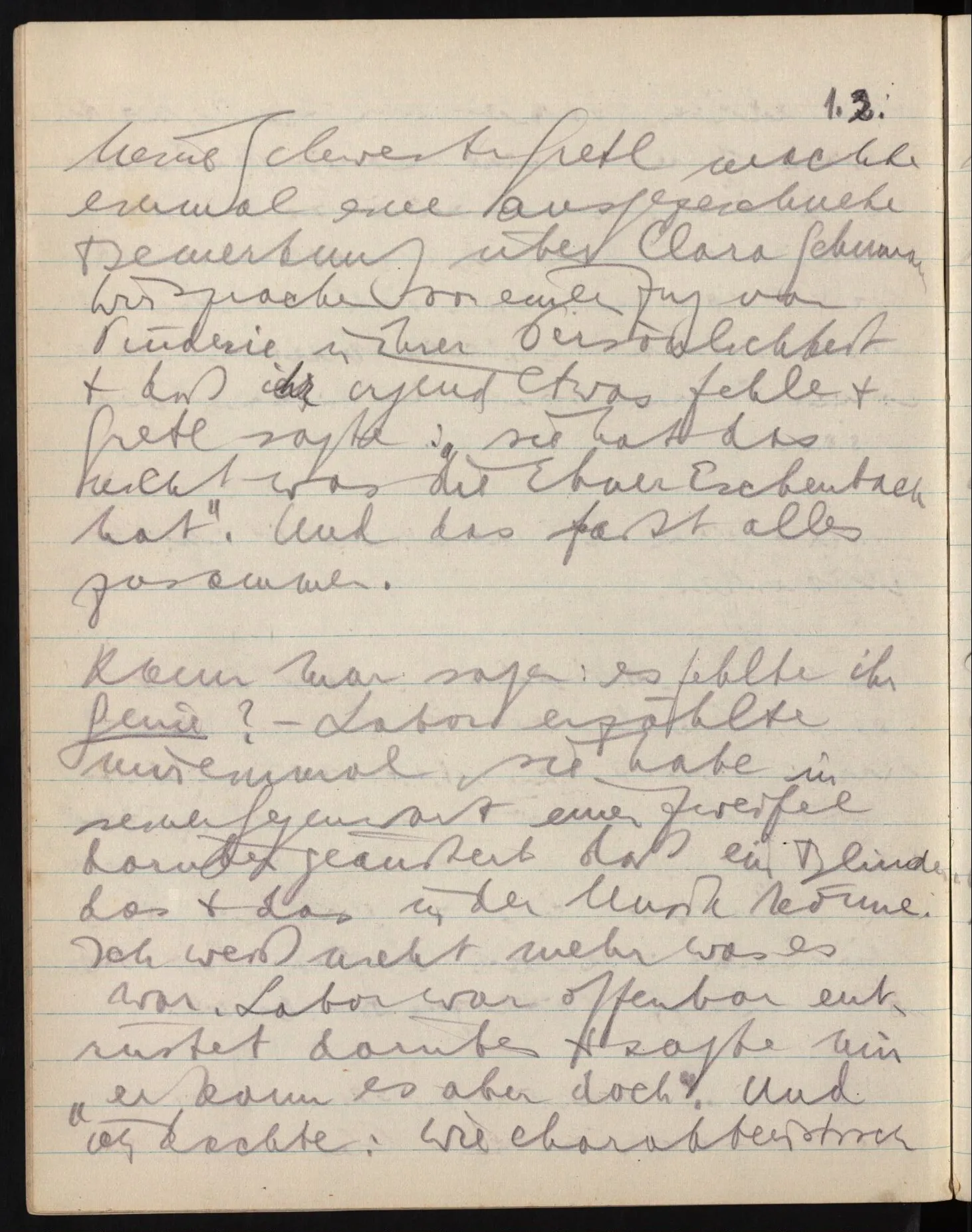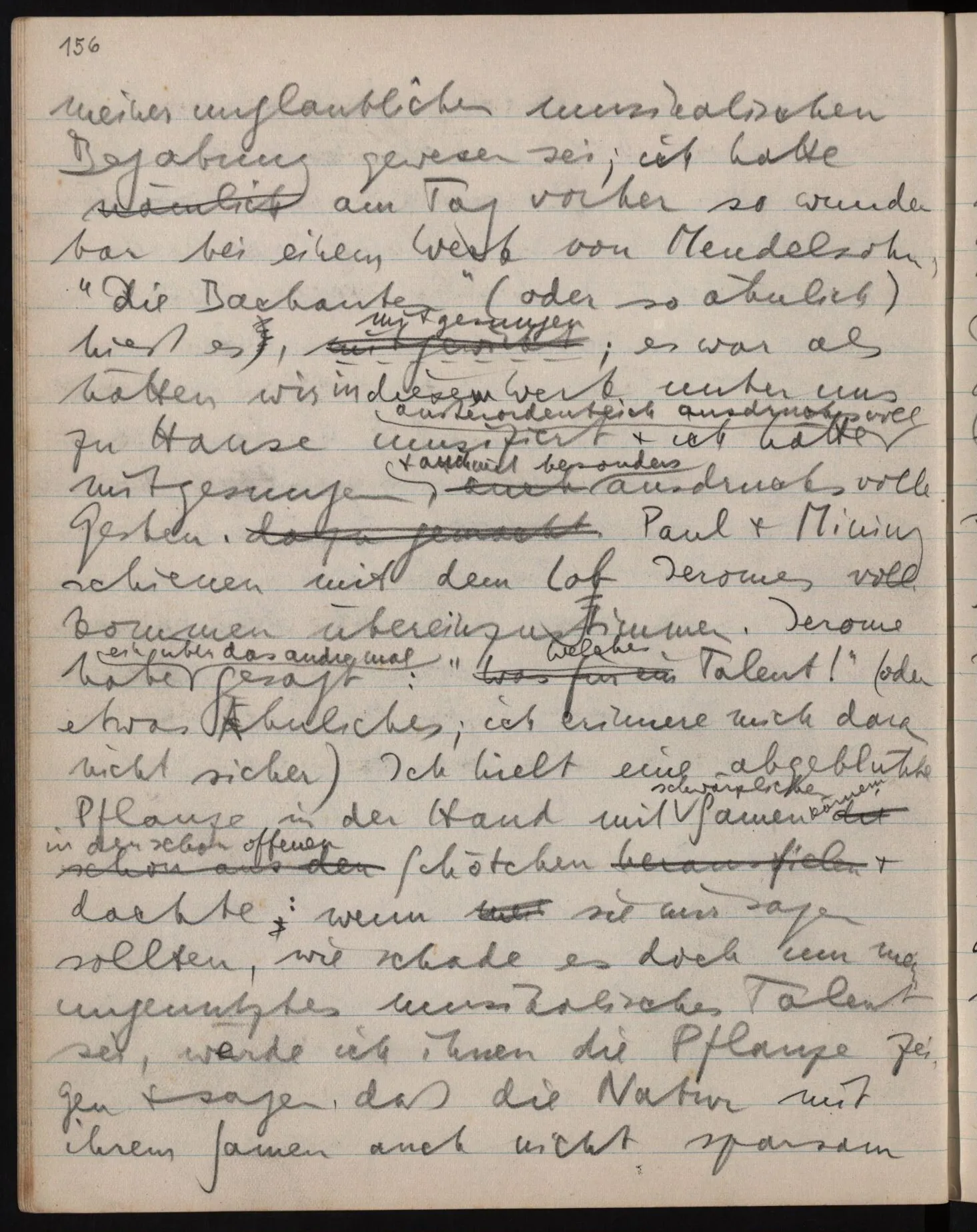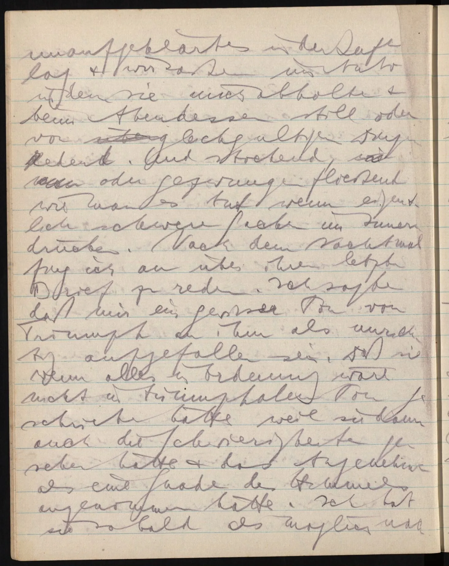 29.04.1930 Mir ist nur dann wohl wenn ich, in einem gewissen Sinn, begeistert bin. Und dann habe ich wieder Angst vor dem Zusammenbruch dieser Begeisterung. Heute zeigte mir Mrs Moore eine dumme Kritik einer Aufführung der 4ten Symphonie von Bruckner wo der Kritiker über Bruckner schimpft & auch von Brahms & Wagner respektlos redet. Es machte mir zuerst keinen Eindruck da es das Natürliche ist daß alles – großes & kleines – von Hunden angebellt wird. Dann schmerzte es mich doch. In gewissem Sinne fühle ich mich berührt (seltsamerweise) wenn ich denke daß der Geist nie verstanden wird.
