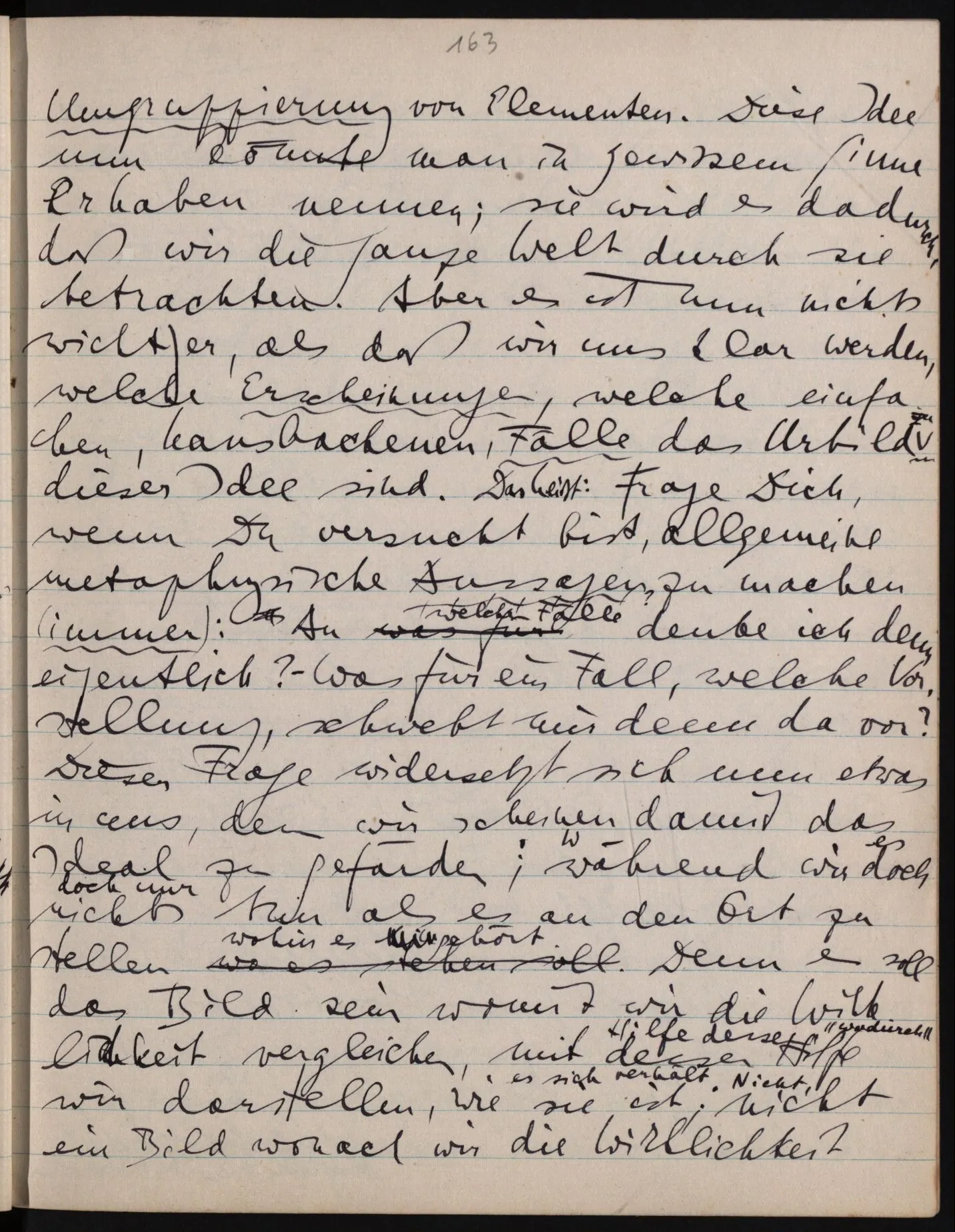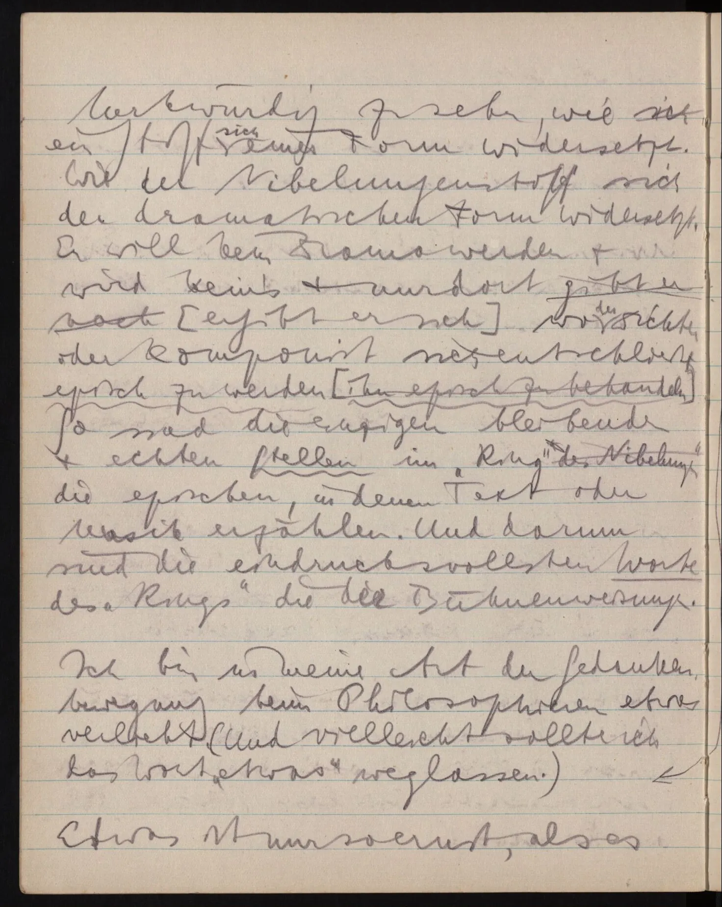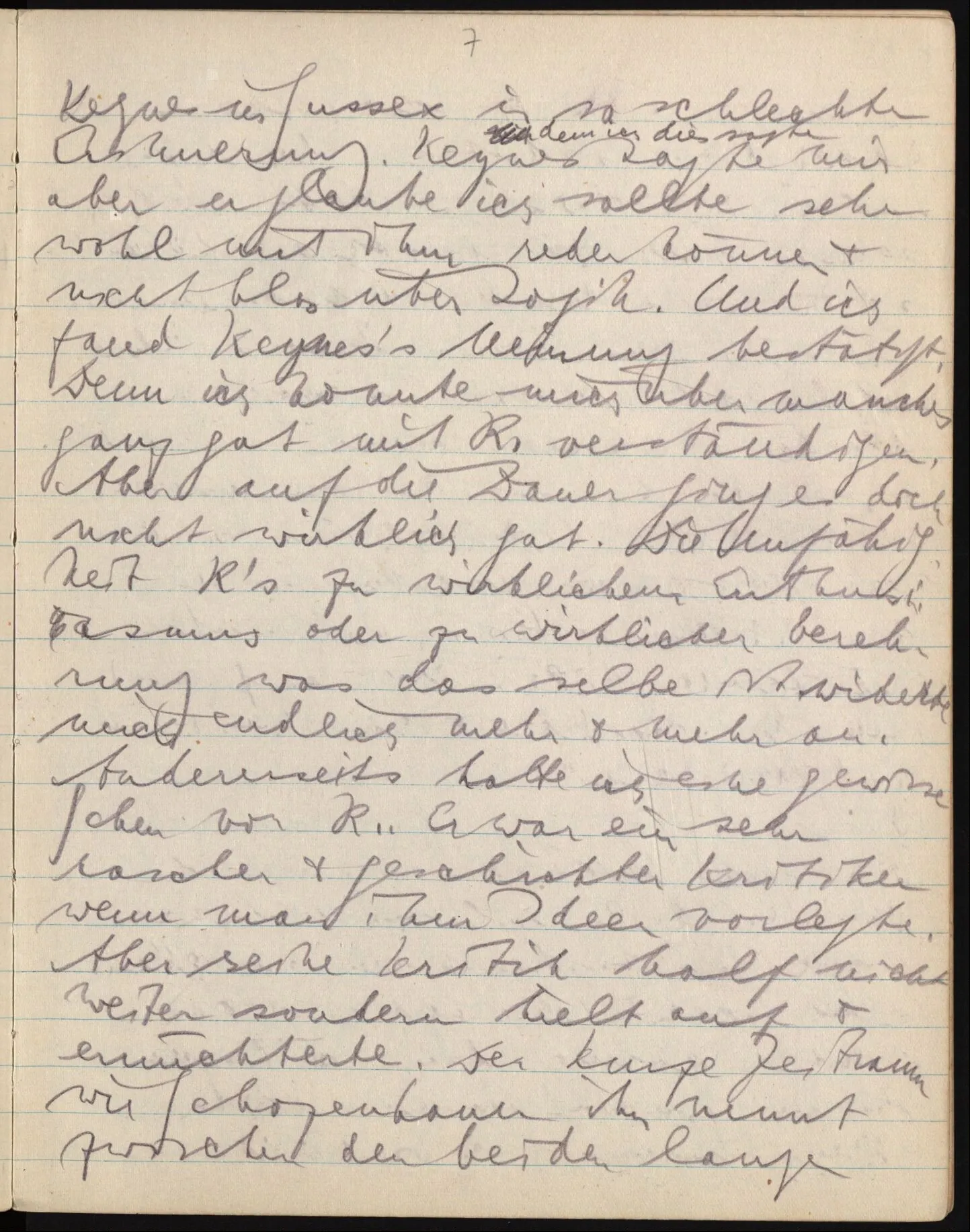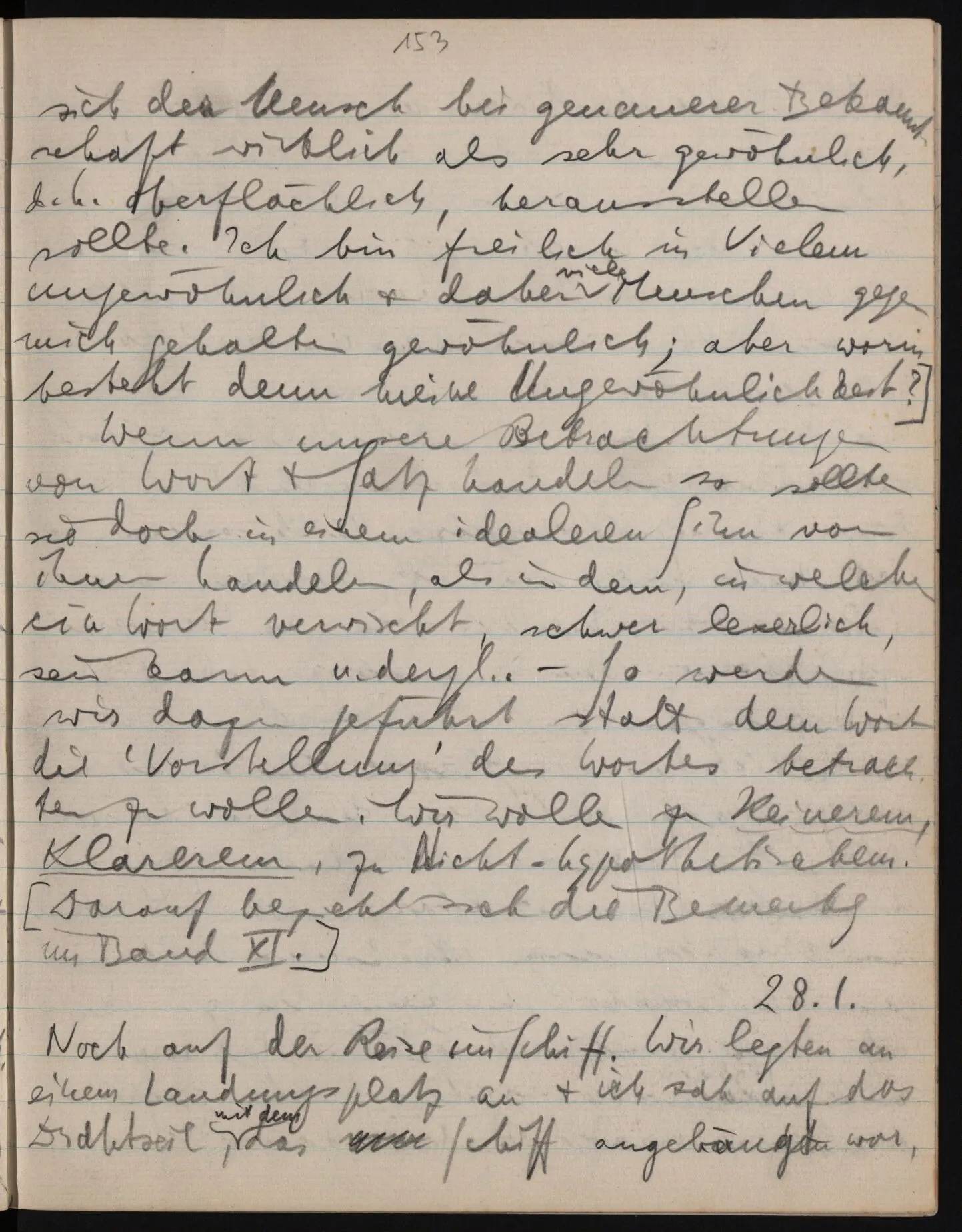 Ramseys Geist war mir sehr zuwider. Als ich vor 15 Monaten nach Cambridge kam da glaubte ich, ich würde nicht mit ihm verkehren können denn ich hatte ihn von unserer letzten Begegnung vor etwa 4 Jahren bei Keynes in Sussex in so schlechter Erinnerung. Keynes dem ich dies sagte sagte mir aber er glaube ich sollte sehr wohl mit ihm reden können & nicht bloß über Logik. Und ich fand Keynes’s Meinung bestätigt. Denn ich konnte mich über manches ganz gut mit Ramsey verständigen. Aber auf die Dauer ging es doch nicht wirklich gut. Die Unfähigkeit Ramseys zu wirklichem Enthusiasmus oder zu wirklicher Verehrung was das Selbe ist widerte mich endlich mehr & mehr an. Andererseits hatte ich eine gewisse Scheu vor Ramsey. Er war ein sehr rascher & geschickter Kritiker wenn man ihm Ideen vorlegte. Aber seine Kritik half nicht weiter sondern hielt auf & ernüchterte. Der kurze Zeitraum wie Schopenhauer ihn nennt zwischen den beiden langen in denen eine Wahrheit den Menschen, zuerst paradox, & dann trivial erscheint war bei Ramsey zu einem Punkt geworden. Und so plagte man sich zuerst lange vergebens ihm etwas klar zu machen bis er plötzlich die Achsel darüber zuckte & sagte es sei ja selbstverständlich. Dabei war er aber nicht unaufrichtig. Er hatte einen häßlichen Geist. Aber keine häßliche Seele. Er genoß Musik wirklich & mit Verständnis. Und man sah ihm an welche Wirkung sie auf ihn ausübte. Von dem letzten Satz eines der letzten Beethovenschen Quartette den er mehr als vielleicht alles andere liebte sagte er mir er fühle dabei die Himmel seien offen. Und das bedeutete etwas von ihm.
