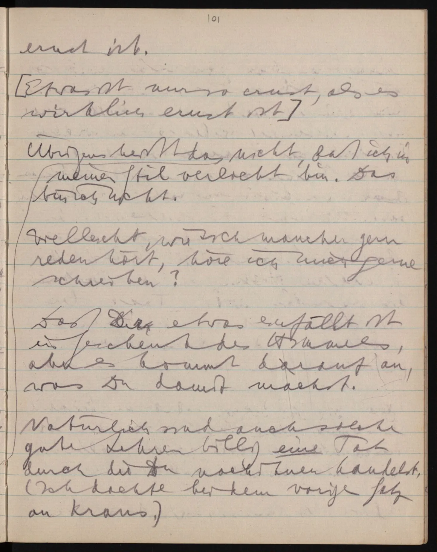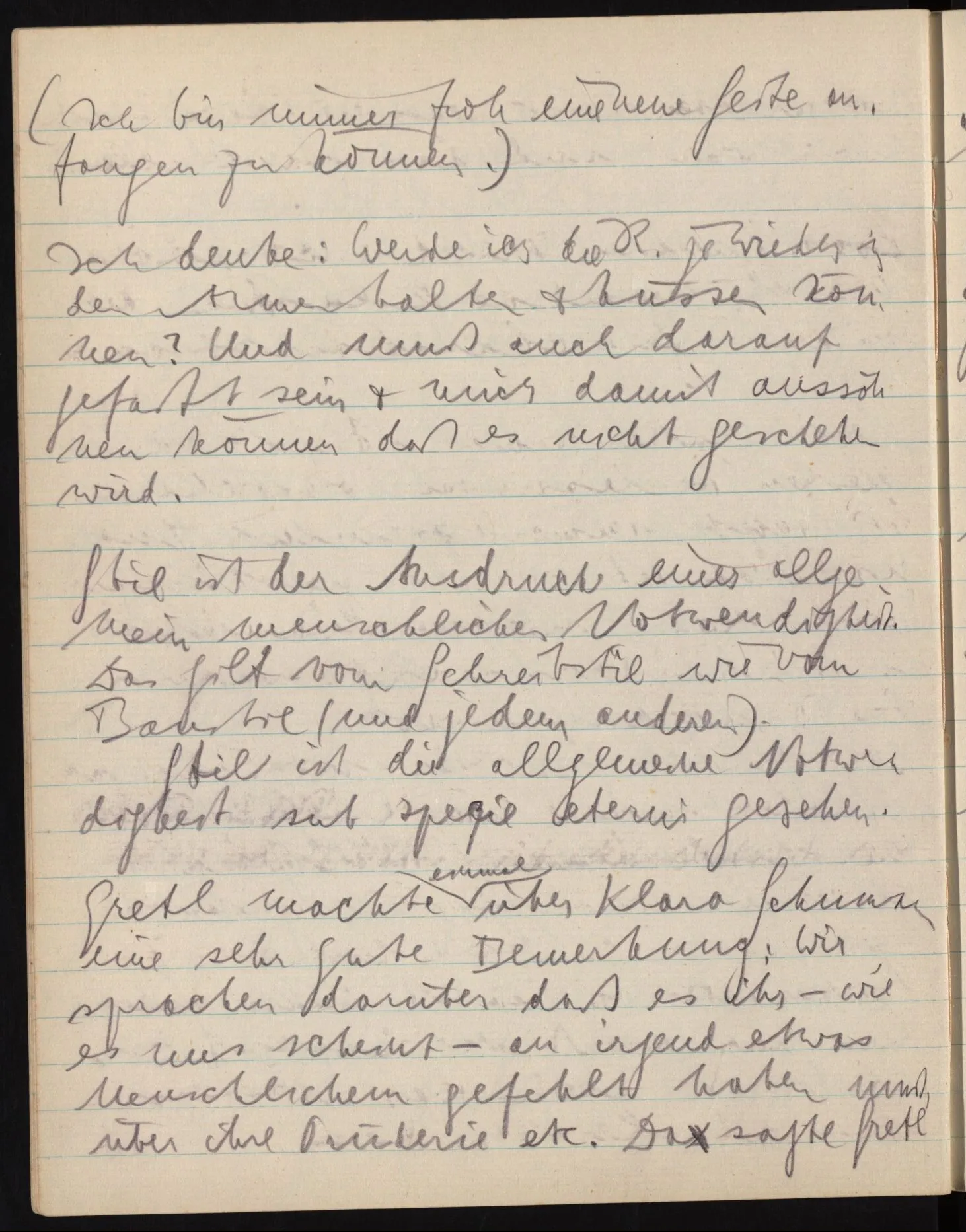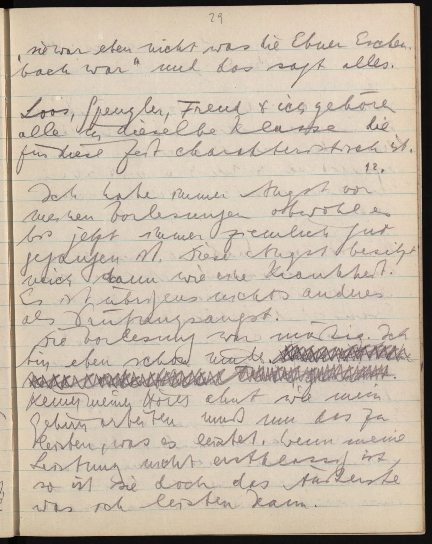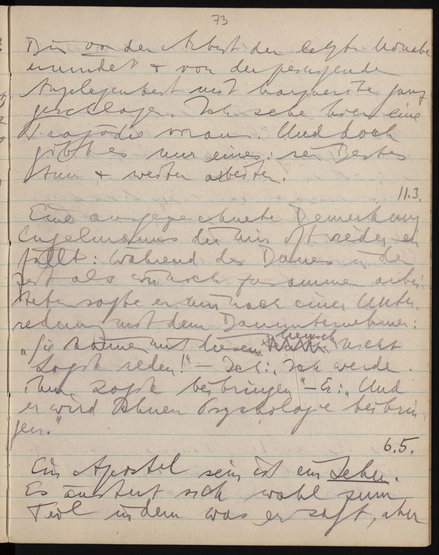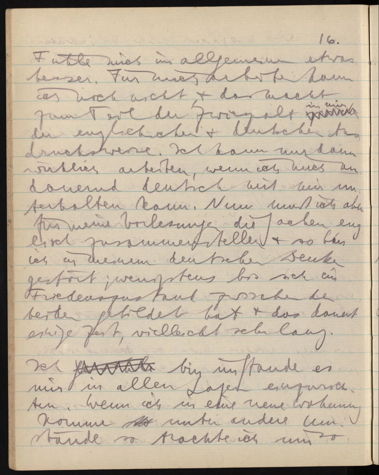 02.05.1930 In meinen Vorlesungen trachte ich oft die Gunst meiner Zuhörer durch eine etwas komische Wendung zu gewinnen; sie zu unterhalten damit sie mir willig Gehör schenken. Das ist gewiß etwas Schlechtes. Ich leide oft unter dem Gedanken wie sehr der Erfolg oder der Wert dessen was ich tue von meiner Disposition abhängt. Mehr als bei einem Konzertsänger. Nichts ist gleichsam in mir aufgespeichert; beinahe alles muß im Moment produziert werden. Das ist – glaube ich – eine sehr ungewöhnliche Art der Tätigkeit oder des Lebens.