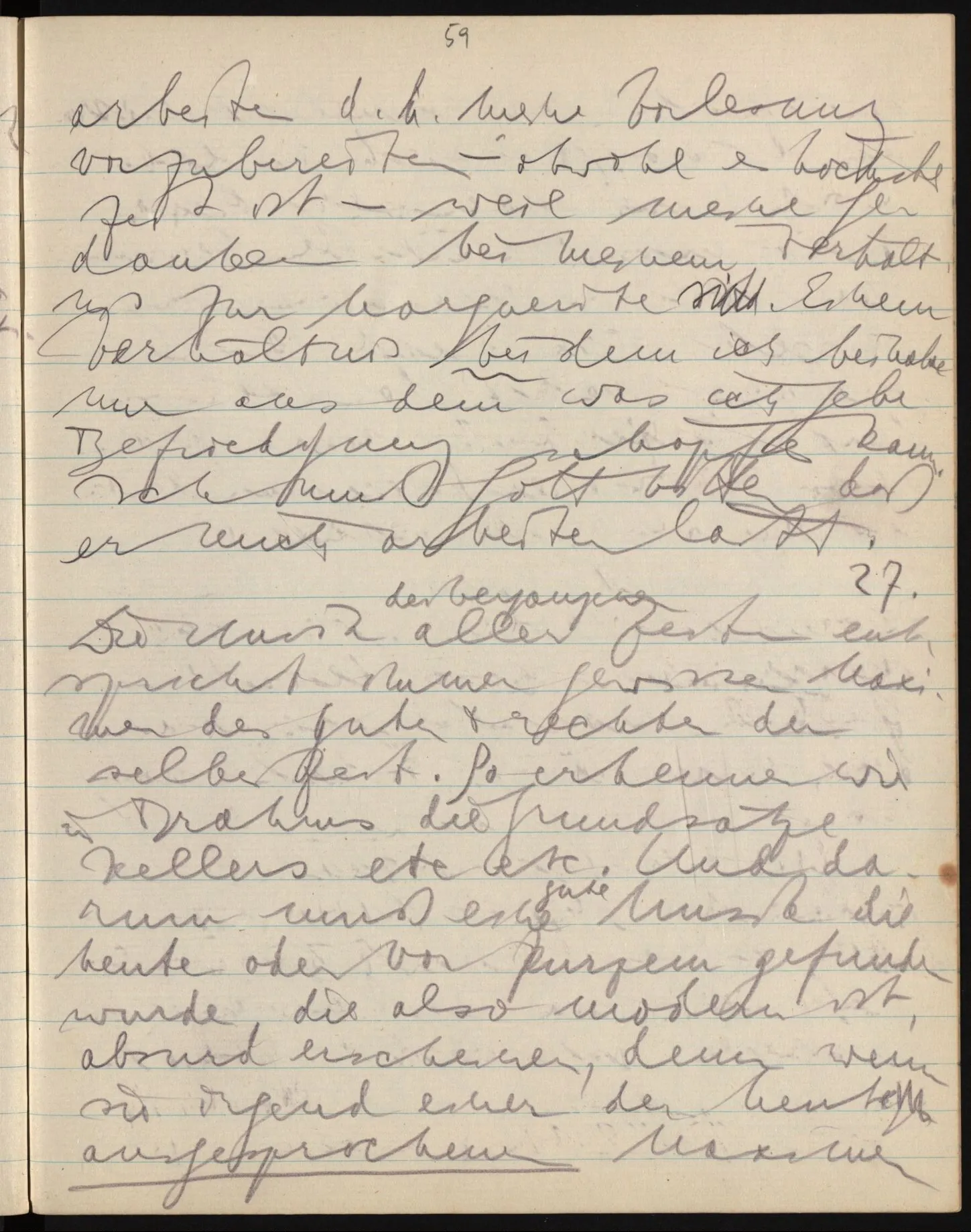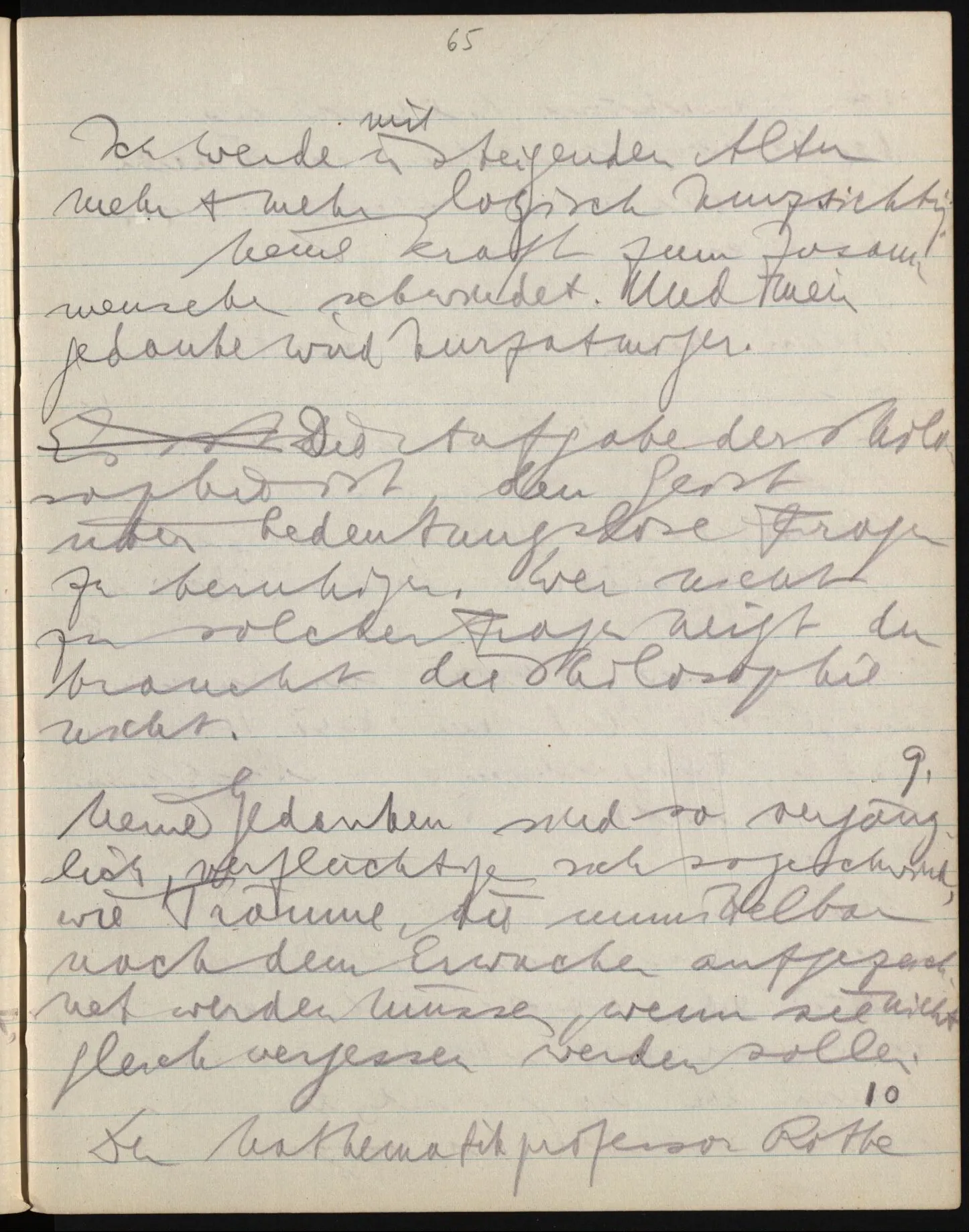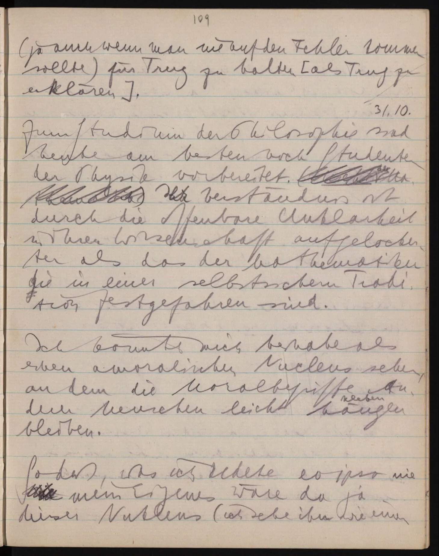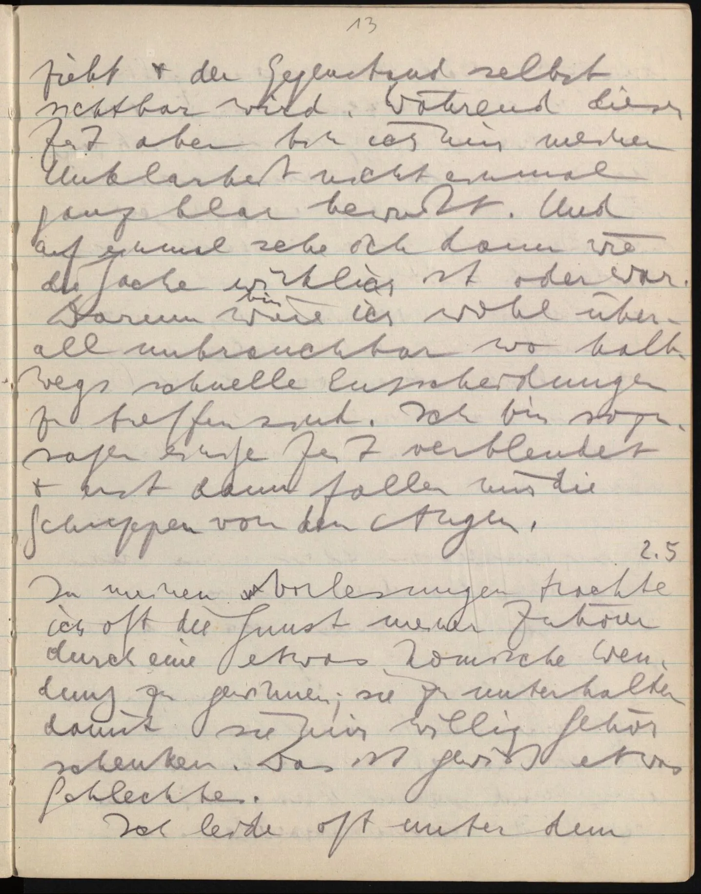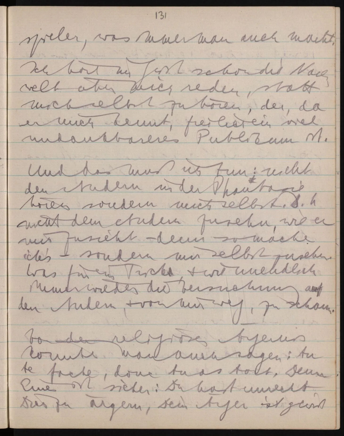 02.05.1930 In meinen Vorlesungen trachte ich oft die Gunst meiner Zuhörer durch eine etwas komische Wendung zu gewinnen; sie zu unterhalten damit sie mir willig Gehör schenken. Das ist gewiß etwas Schlechtes. Ich leide oft unter dem Gedanken wie sehr der Erfolg oder der Wert dessen was ich tue von meiner Disposition abhängt. Mehr als bei einem Konzertsänger. Nichts ist gleichsam in mir aufgespeichert; beinahe alles muß im Moment produziert werden. Das ist – glaube ich – eine sehr ungewöhnliche Art der Tätigkeit oder des Lebens.