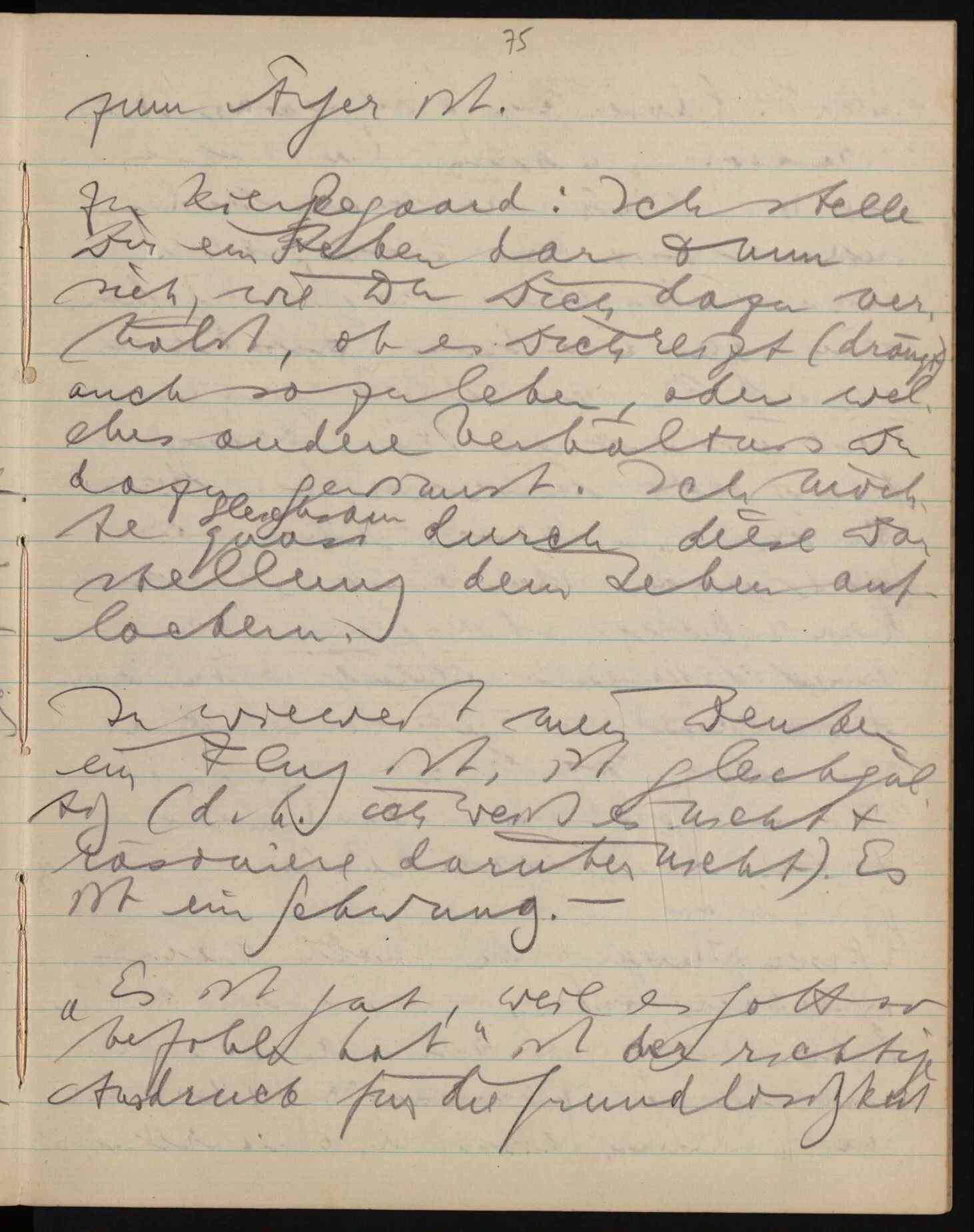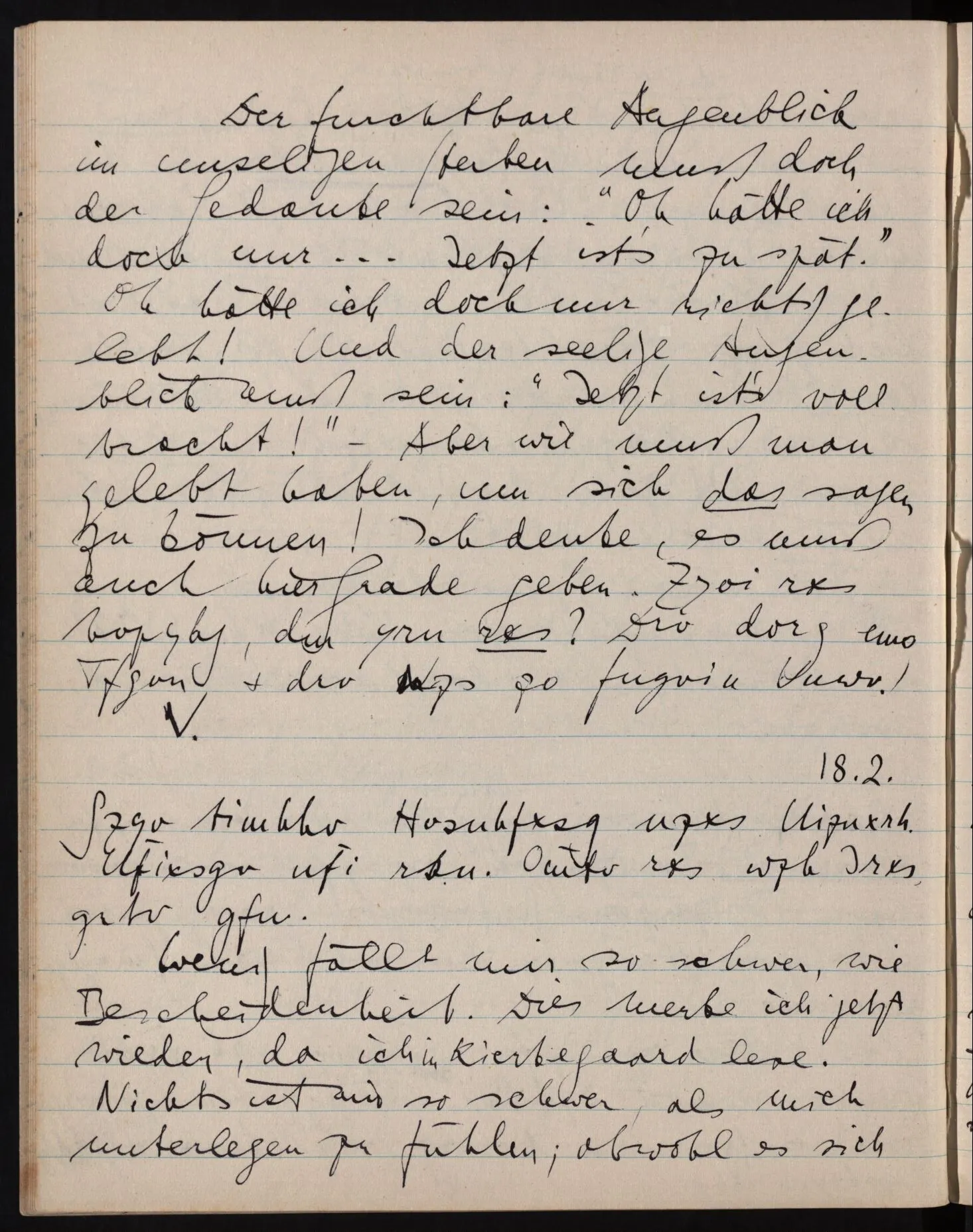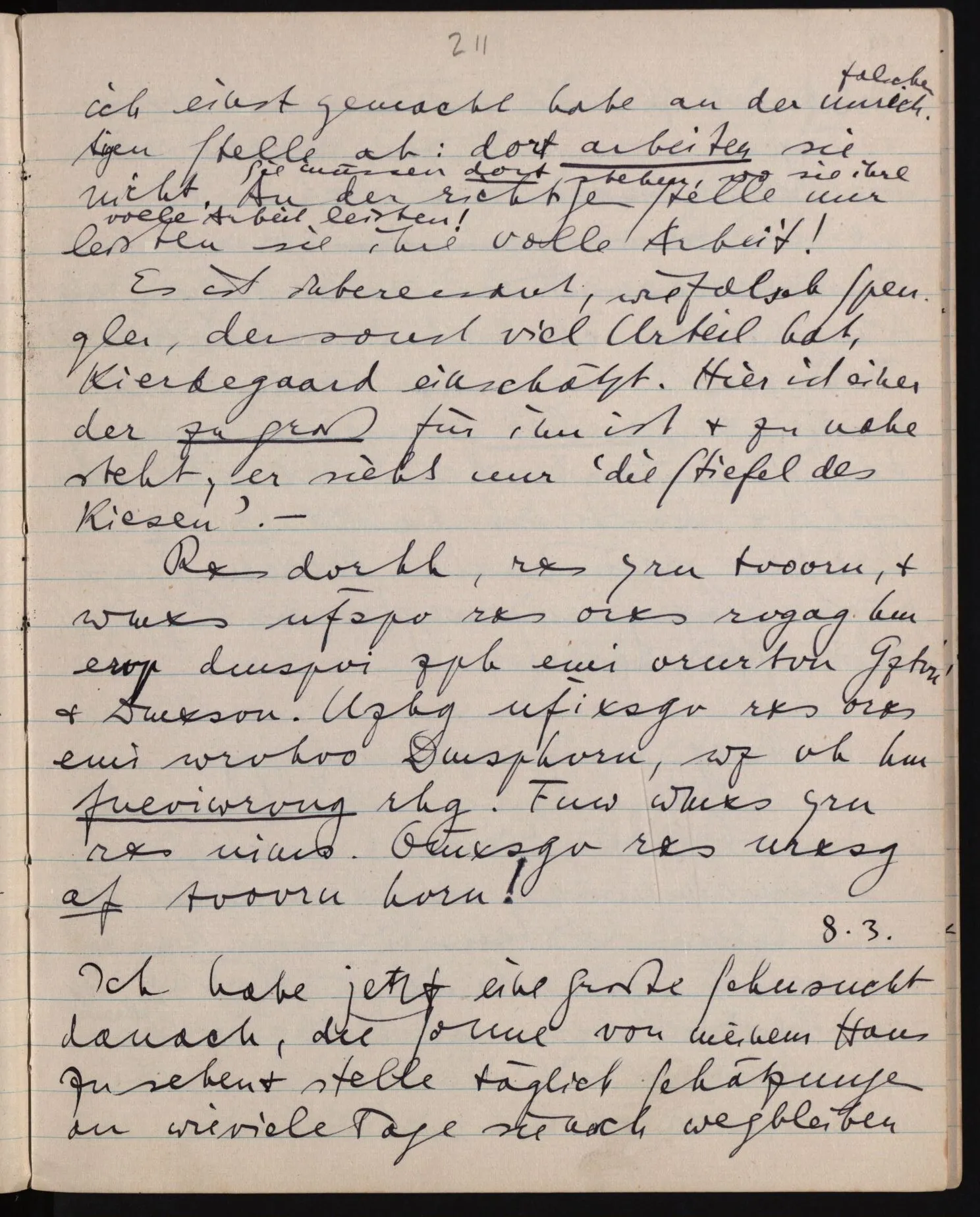 06.03.1937 Ich schreibe öfters Philosophische Bemerkungen die ich einst gemacht habe an der unrichtigen Stelle ab: dort arbeiten sie nicht! An der richtigen Stelle nur leisten sie ihre volle Arbeit! Es ist interessant, wie falsch Spengler, der sonst viel Urteil hat, Kierkegaard einschätzt. Hier ist einer der zu groß für ihn ist & zu nahe steht, er sieht nur ‘die Stiefel des Riesen’. – Ich weiß, ich bin gemein, & doch fühle ich mich jetzt so viel wohler als vor einigen Tagen & Wochen. Fast fürchte ich mich vor diesem Wohlsein, da es so unverdient ist. Und doch bin ich froh. Möchte ich nicht zu gemein sein!
