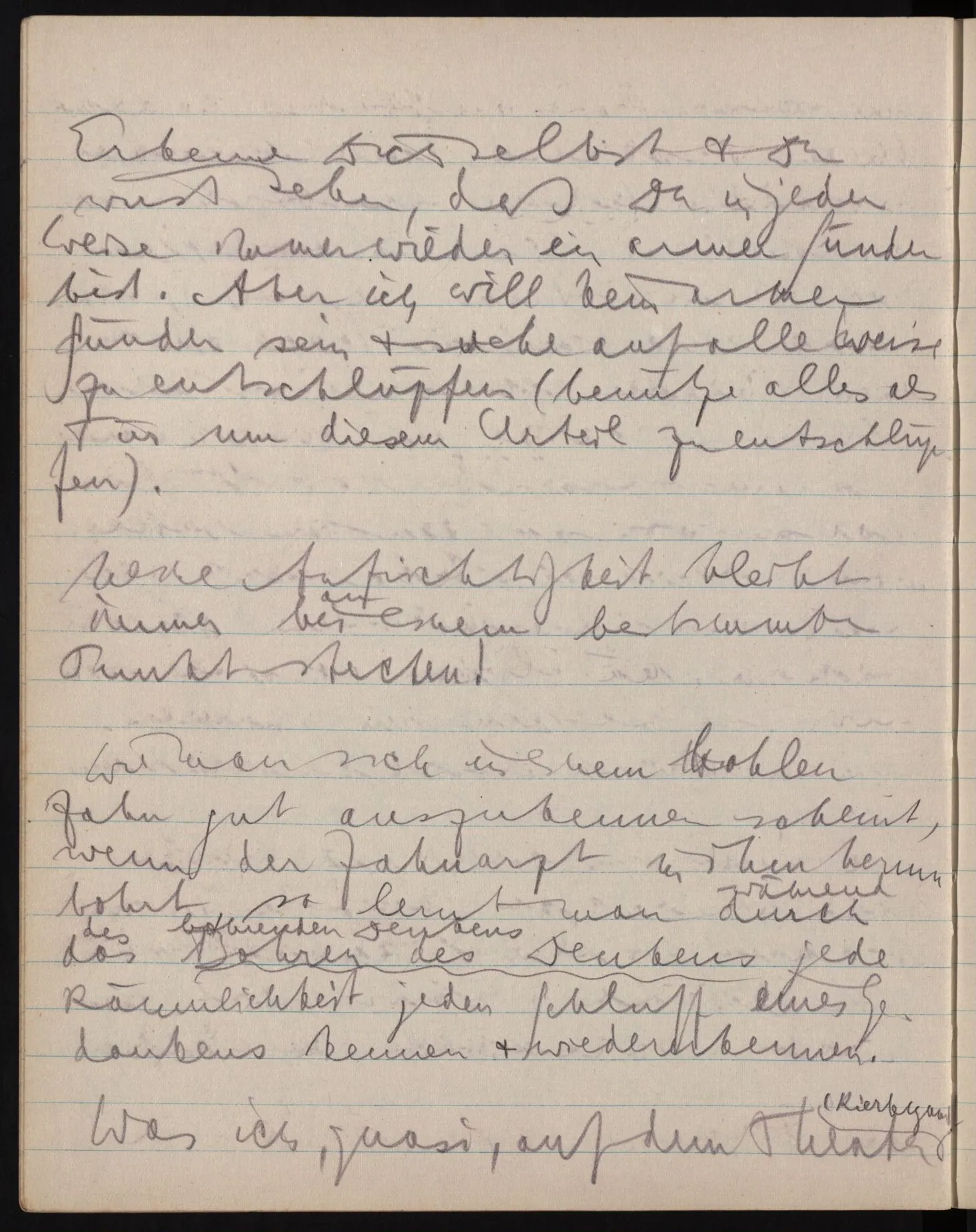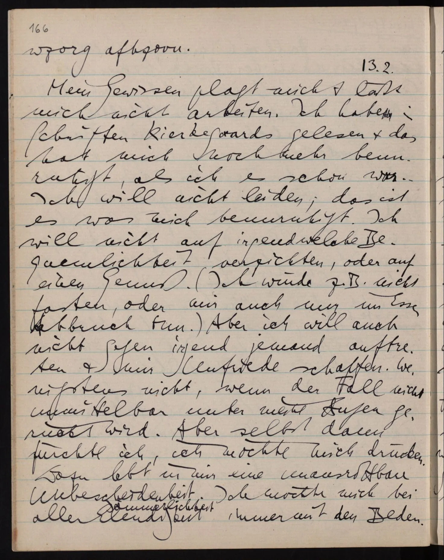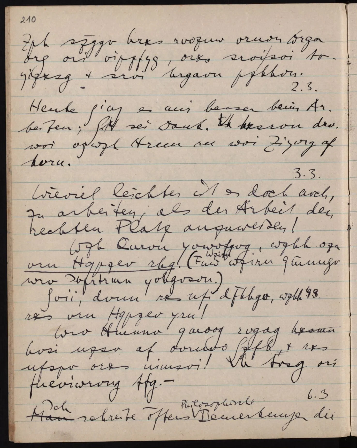 06.03.1937 Ich schreibe öfters Philosophische Bemerkungen die ich einst gemacht habe an der unrichtigen Stelle ab: dort arbeiten sie nicht! An der richtigen Stelle nur leisten sie ihre volle Arbeit! Es ist interessant, wie falsch Spengler, der sonst viel Urteil hat, Kierkegaard einschätzt. Hier ist einer der zu groß für ihn ist & zu nahe steht, er sieht nur ‘die Stiefel des Riesen’. – Ich weiß, ich bin gemein, & doch fühle ich mich jetzt so viel wohler als vor einigen Tagen & Wochen. Fast fürchte ich mich vor diesem Wohlsein, da es so unverdient ist. Und doch bin ich froh. Möchte ich nicht zu gemein sein!