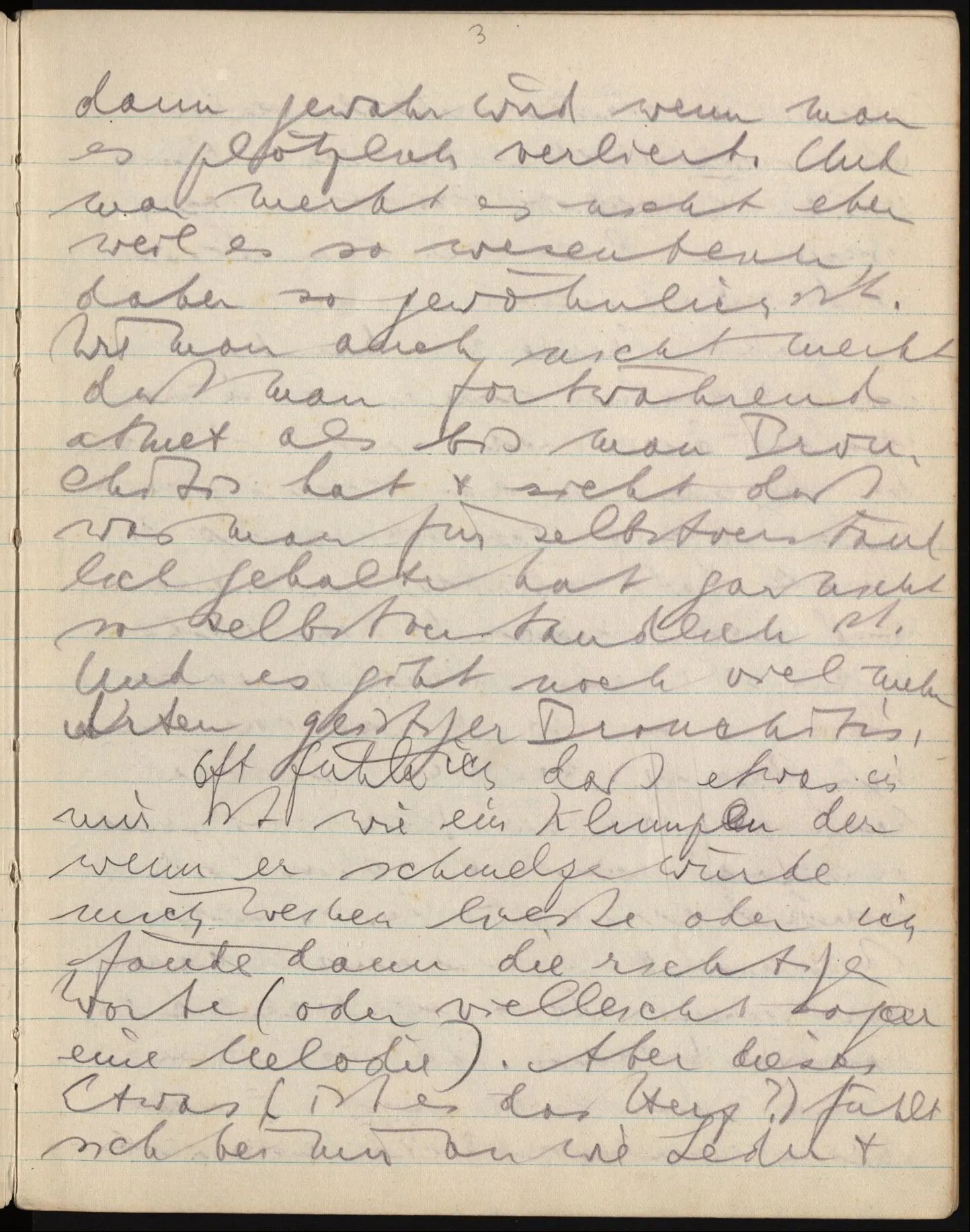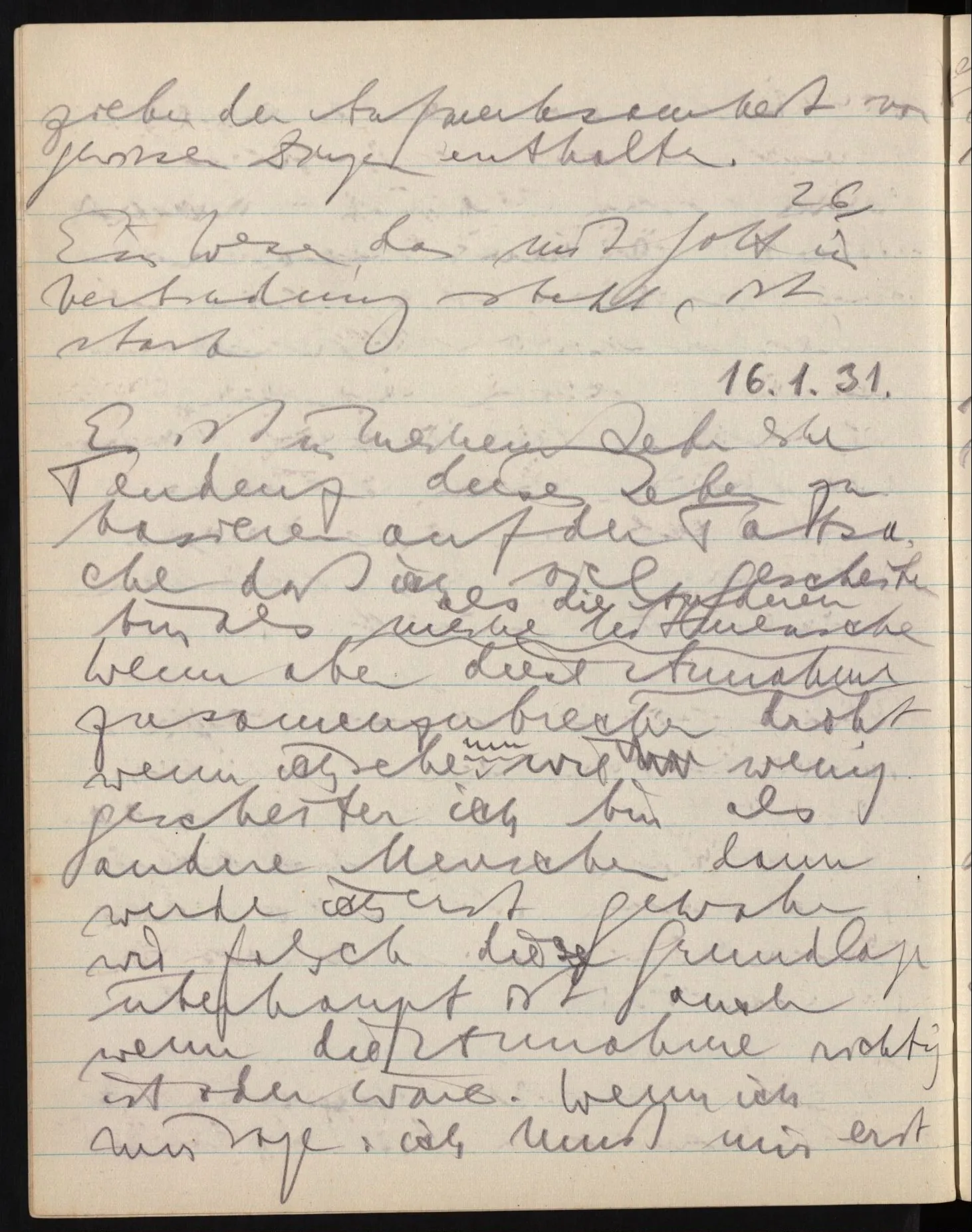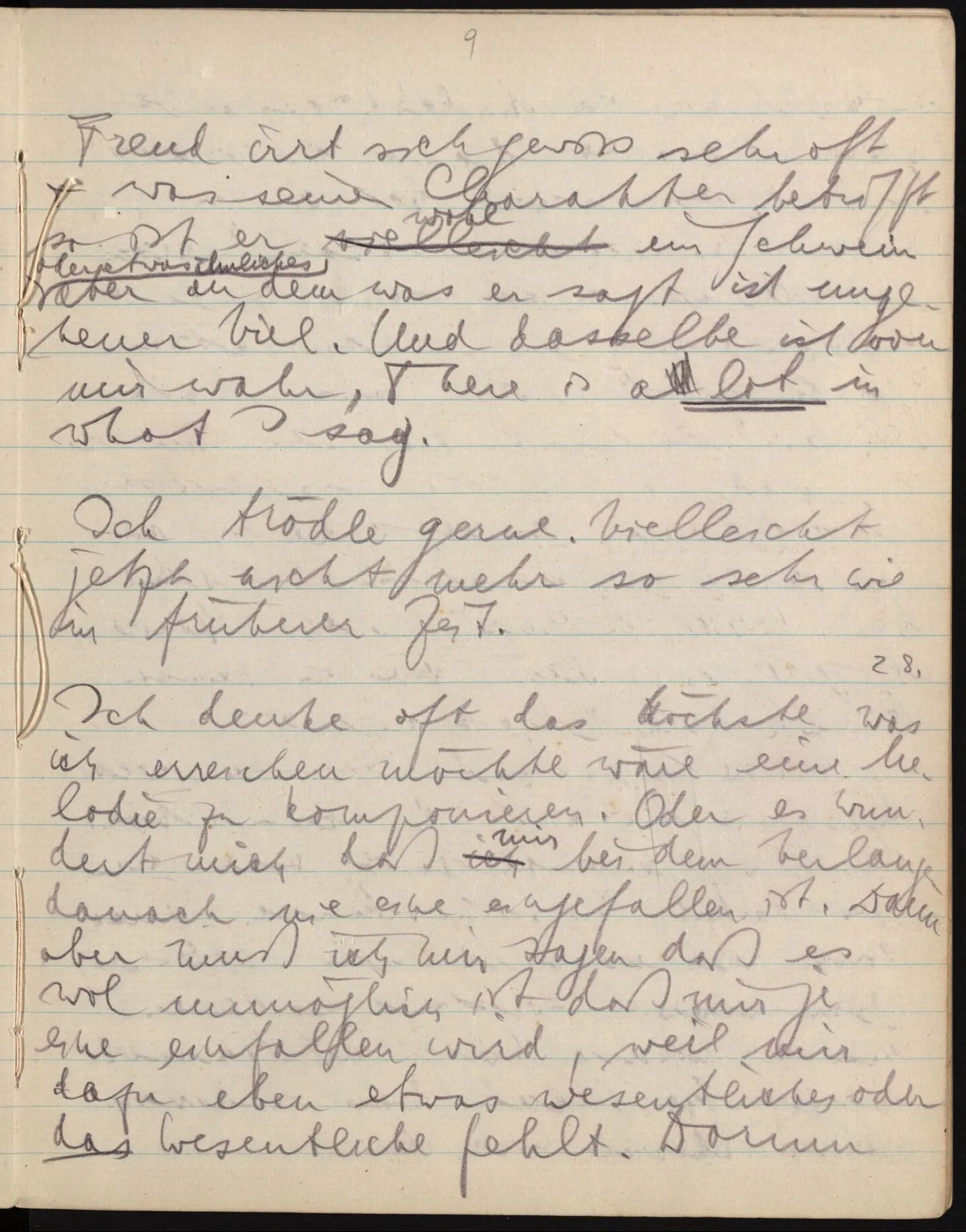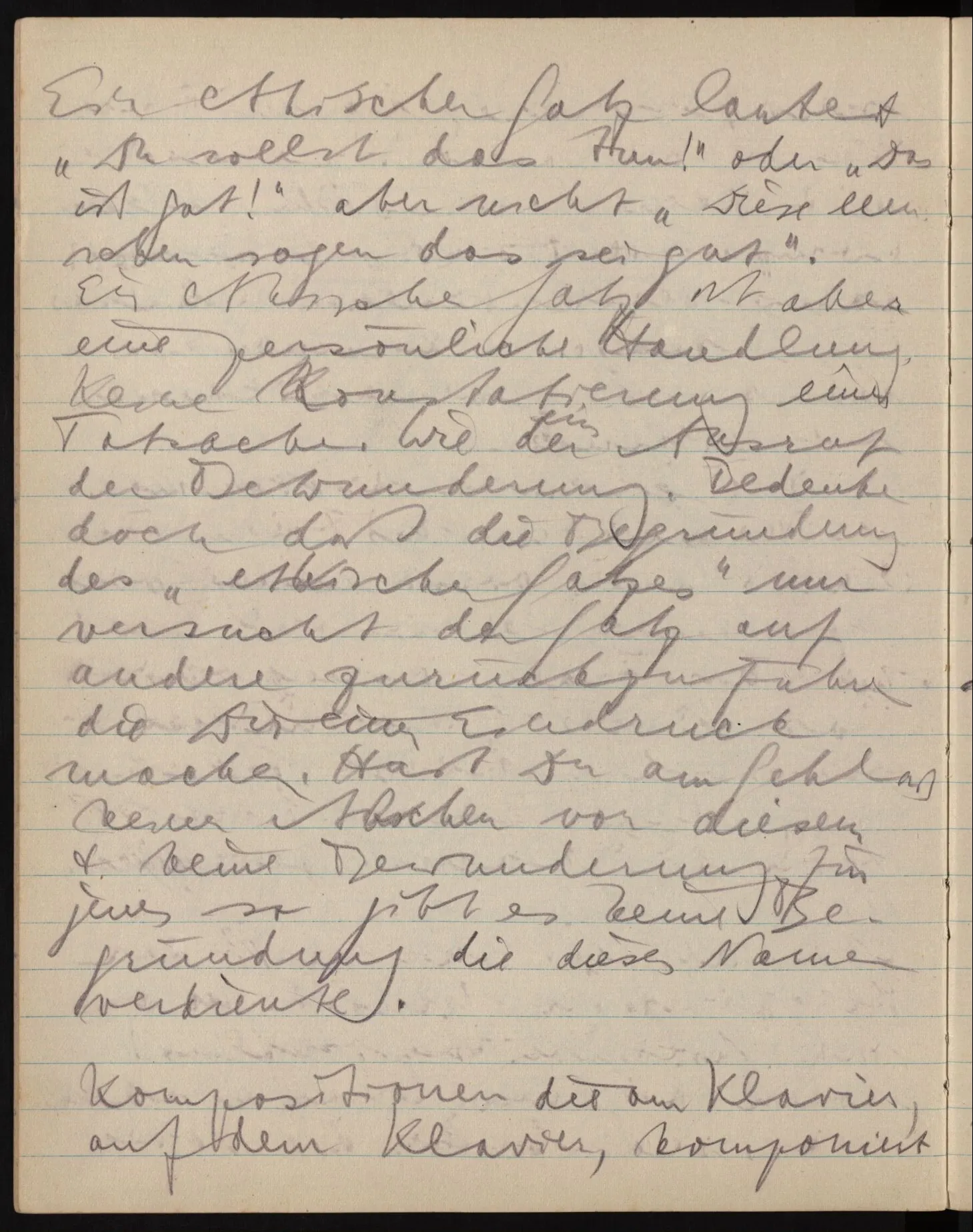 28.04.1930 Ich denke oft das Höchste was ich erreichen möchte wäre eine Melodie zu komponieren. Oder es wundert mich daß mir bei dem Verlangen danach nie eine eingefallen ist. Dann aber muß ich mir sagen daß es wohl unmöglich ist daß mir je eine einfallen wird, weil mir dazu eben etwas Wesentliches oder das Wesentliche fehlt. Darum schwebt es mir ja als ein so hohes Ideal vor weil ich dann mein Leben quasi zusammenfassen könnte; und es kristallisiert hinstellen könnte. Und wenn es auch nur ein kleines schäbiges Kristall wäre, aber doch eins.