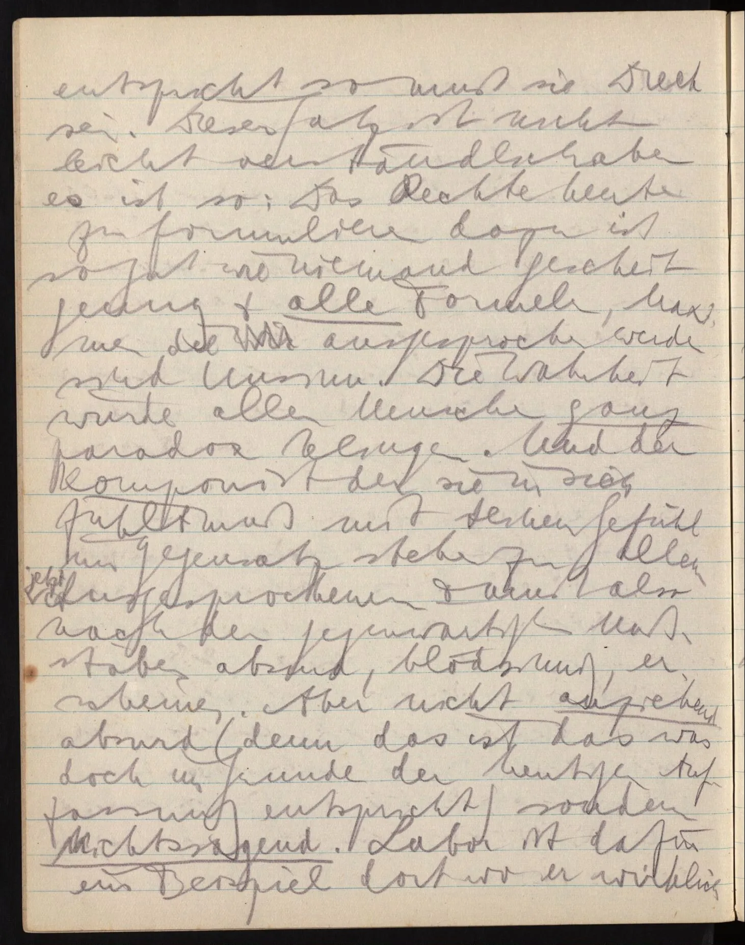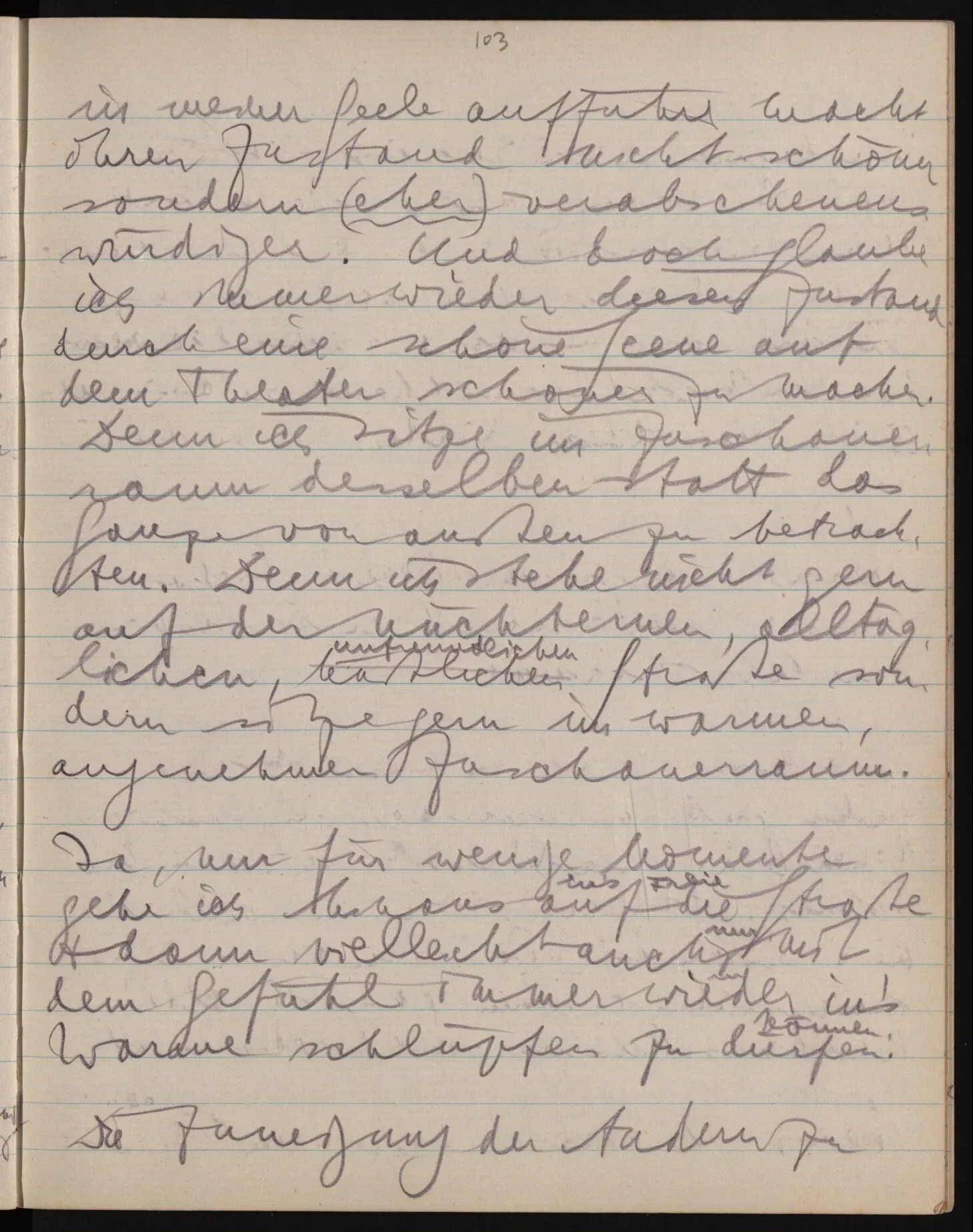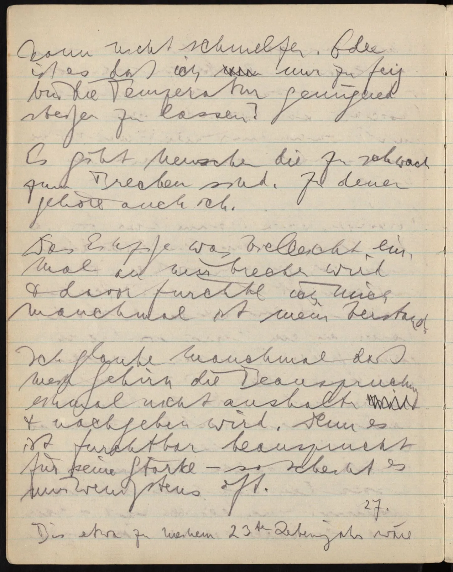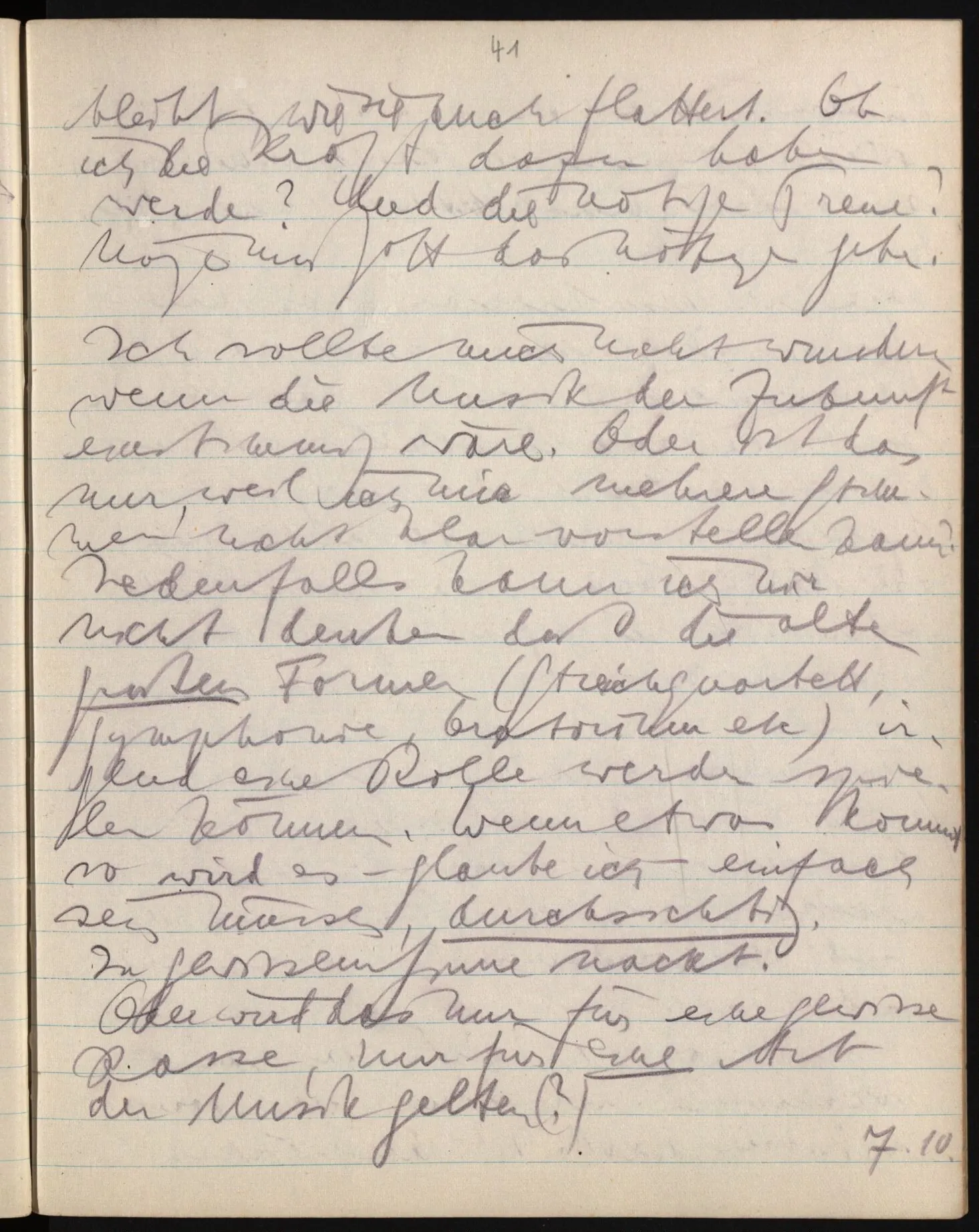 28.04.1930 Ich denke oft das Höchste was ich erreichen möchte wäre eine Melodie zu komponieren. Oder es wundert mich daß mir bei dem Verlangen danach nie eine eingefallen ist. Dann aber muß ich mir sagen daß es wohl unmöglich ist daß mir je eine einfallen wird, weil mir dazu eben etwas Wesentliches oder das Wesentliche fehlt. Darum schwebt es mir ja als ein so hohes Ideal vor weil ich dann mein Leben quasi zusammenfassen könnte; und es kristallisiert hinstellen könnte. Und wenn es auch nur ein kleines schäbiges Kristall wäre, aber doch eins.