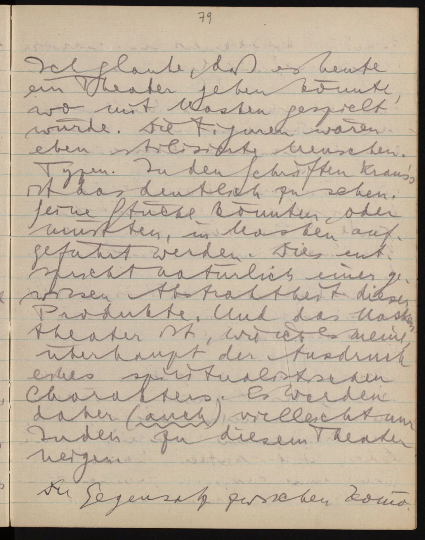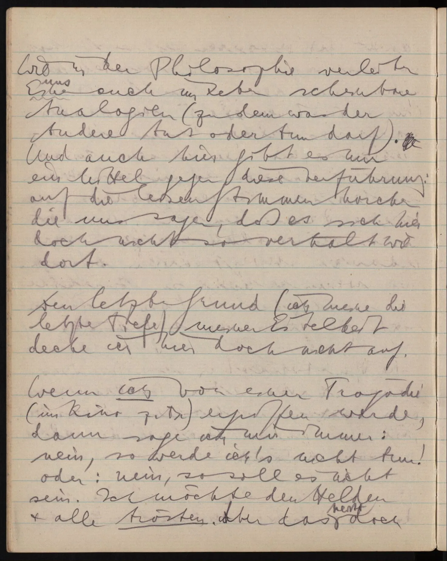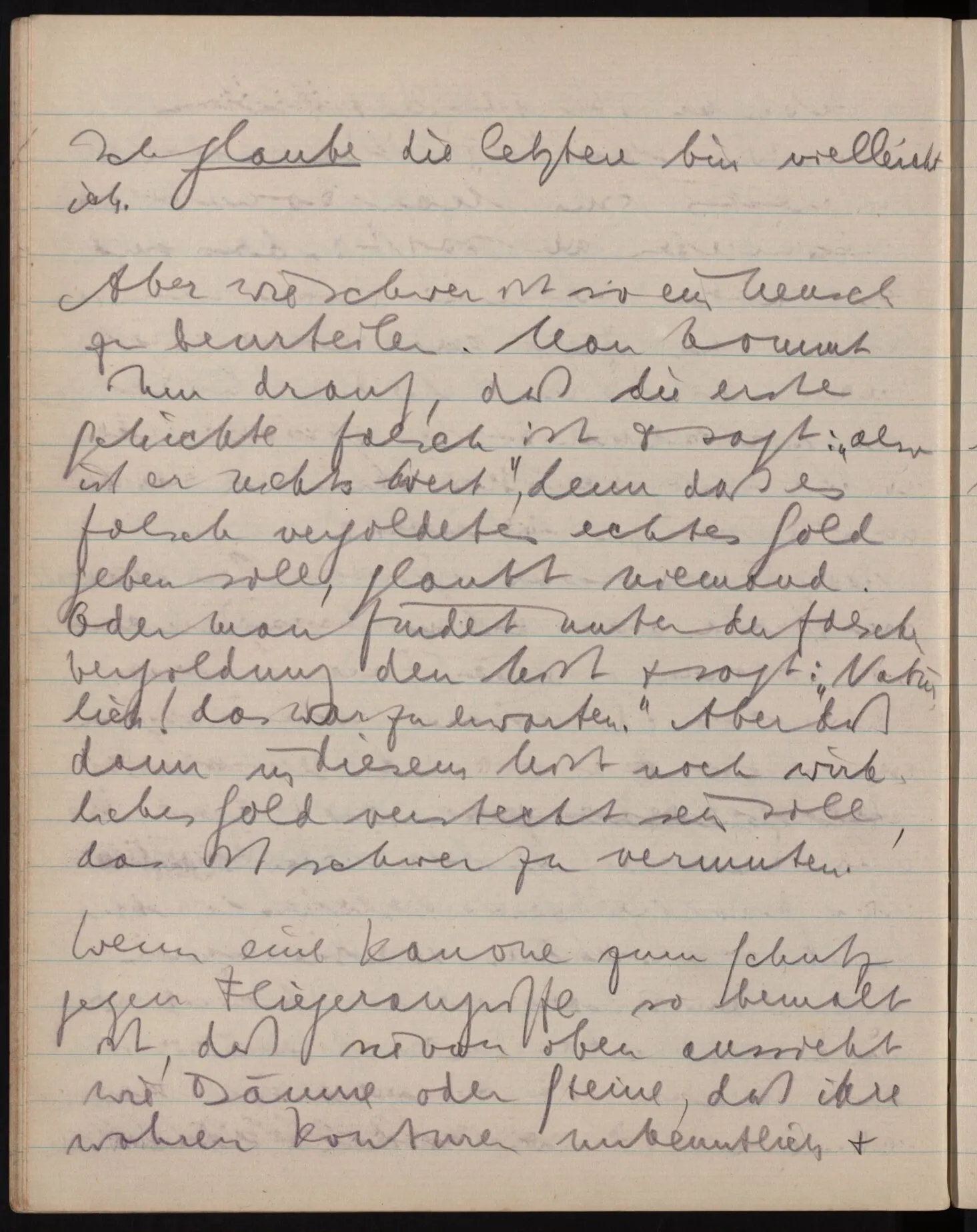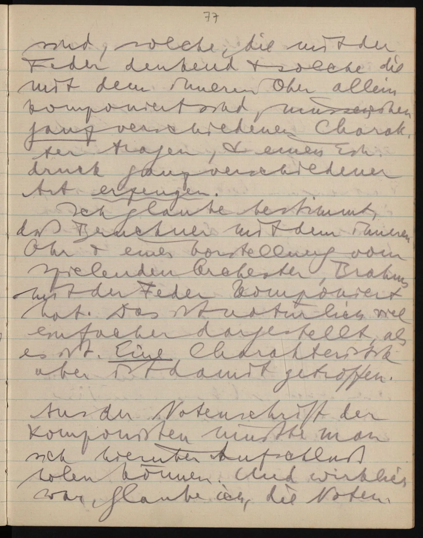 28.04.1930 Ich denke oft das Höchste was ich erreichen möchte wäre eine Melodie zu komponieren. Oder es wundert mich daß mir bei dem Verlangen danach nie eine eingefallen ist. Dann aber muß ich mir sagen daß es wohl unmöglich ist daß mir je eine einfallen wird, weil mir dazu eben etwas Wesentliches oder das Wesentliche fehlt. Darum schwebt es mir ja als ein so hohes Ideal vor weil ich dann mein Leben quasi zusammenfassen könnte; und es kristallisiert hinstellen könnte. Und wenn es auch nur ein kleines schäbiges Kristall wäre, aber doch eins.