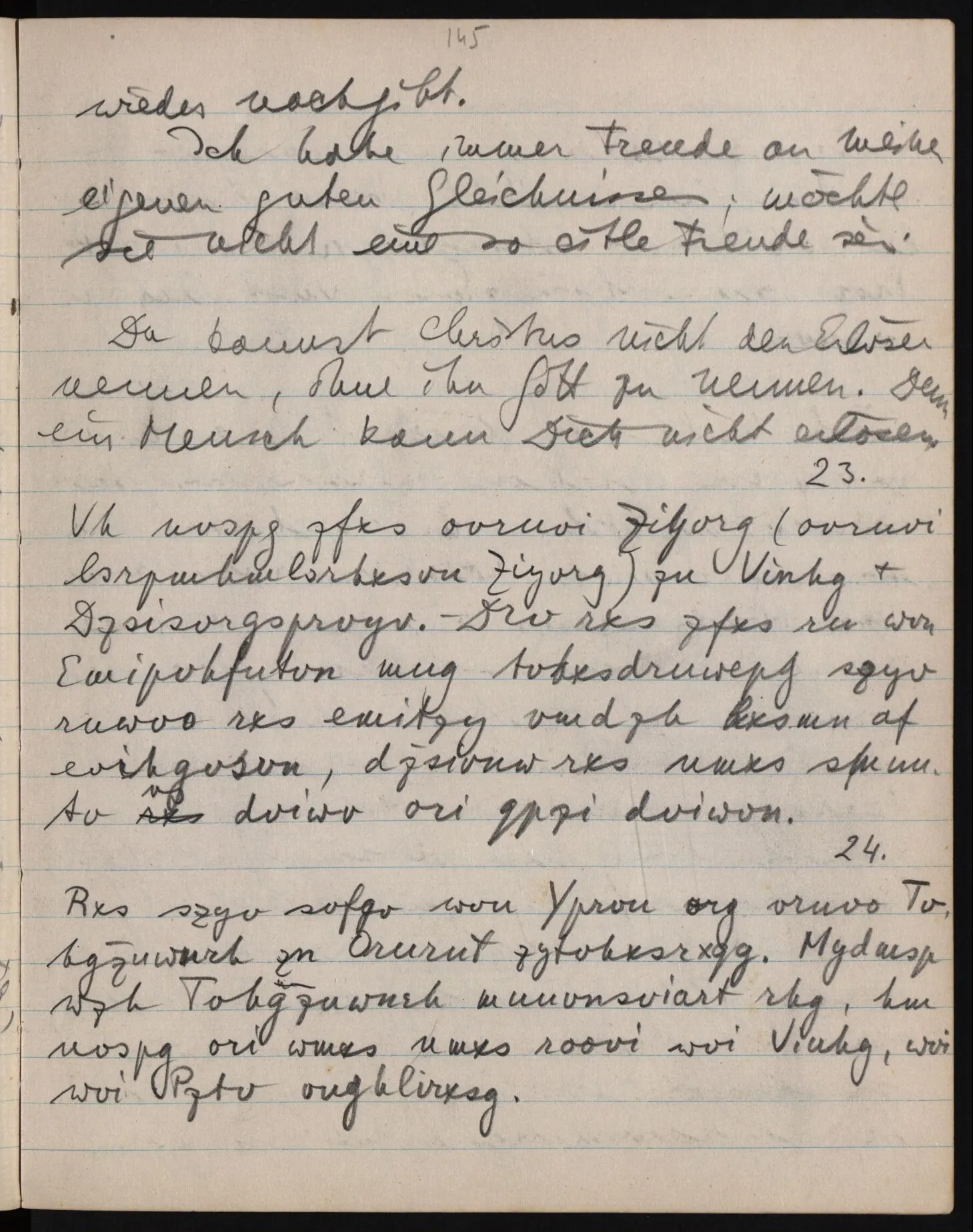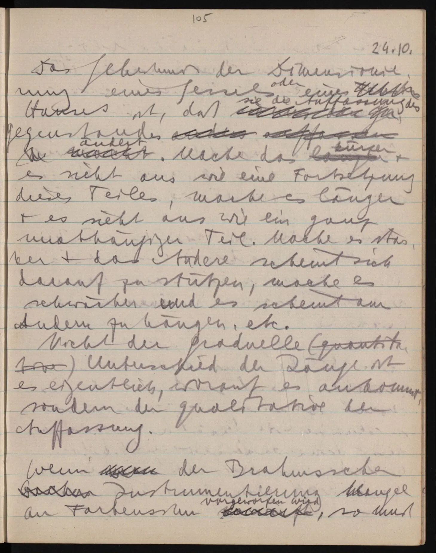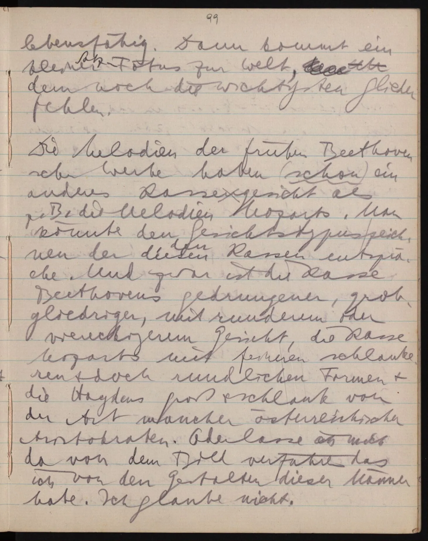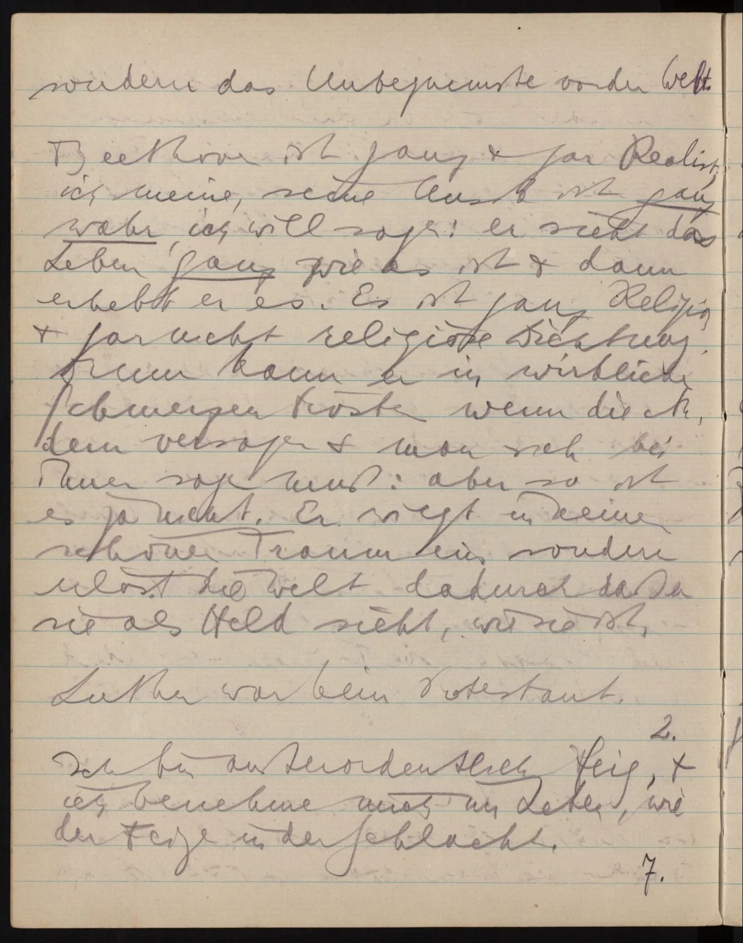 28.04.1930 Ich denke oft das Höchste was ich erreichen möchte wäre eine Melodie zu komponieren. Oder es wundert mich daß mir bei dem Verlangen danach nie eine eingefallen ist. Dann aber muß ich mir sagen daß es wohl unmöglich ist daß mir je eine einfallen wird, weil mir dazu eben etwas Wesentliches oder das Wesentliche fehlt. Darum schwebt es mir ja als ein so hohes Ideal vor weil ich dann mein Leben quasi zusammenfassen könnte; und es kristallisiert hinstellen könnte. Und wenn es auch nur ein kleines schäbiges Kristall wäre, aber doch eins.