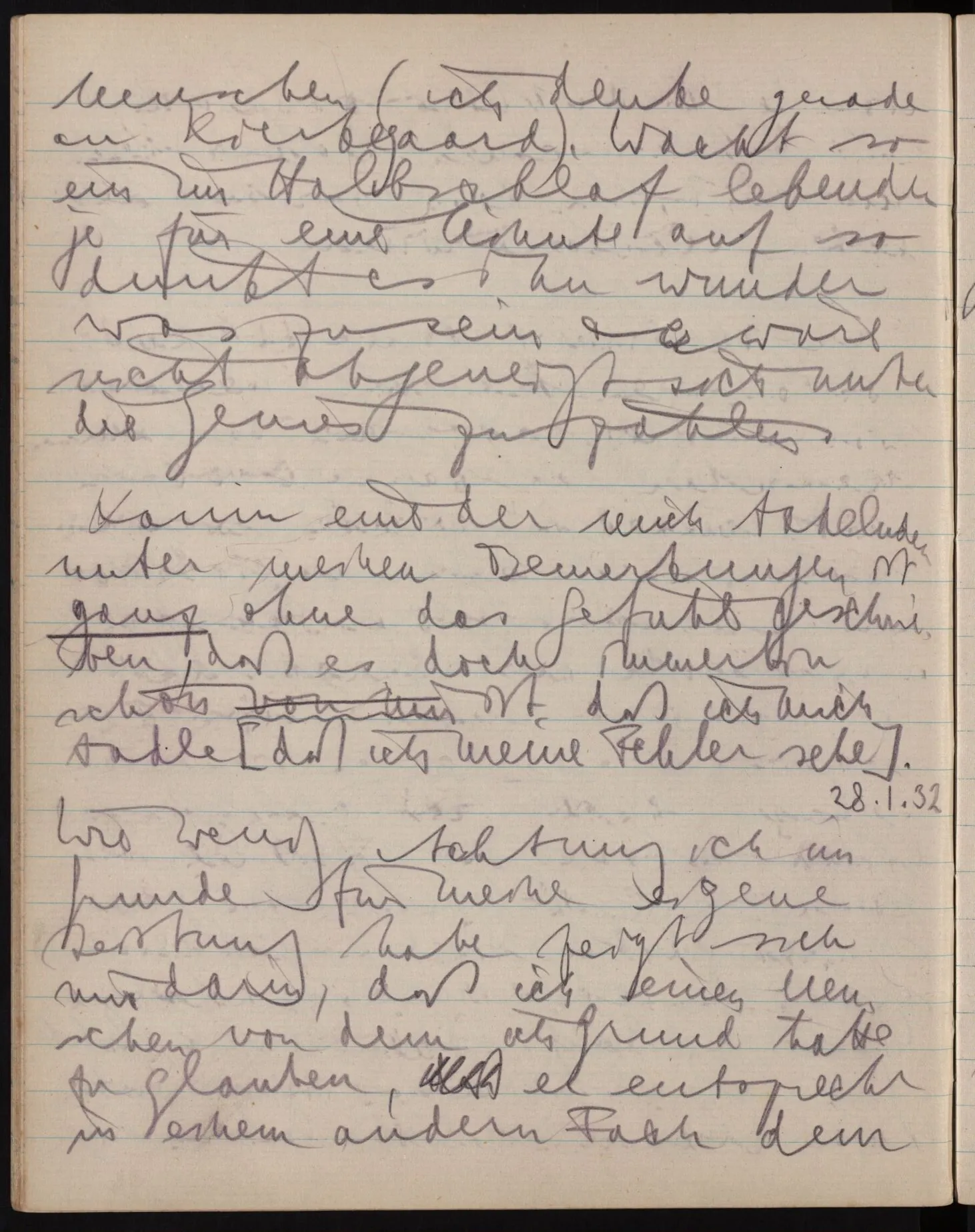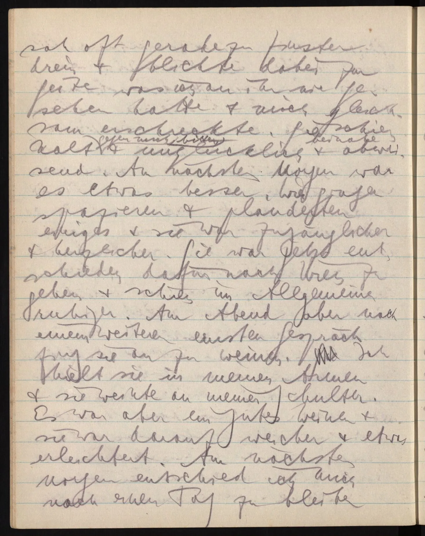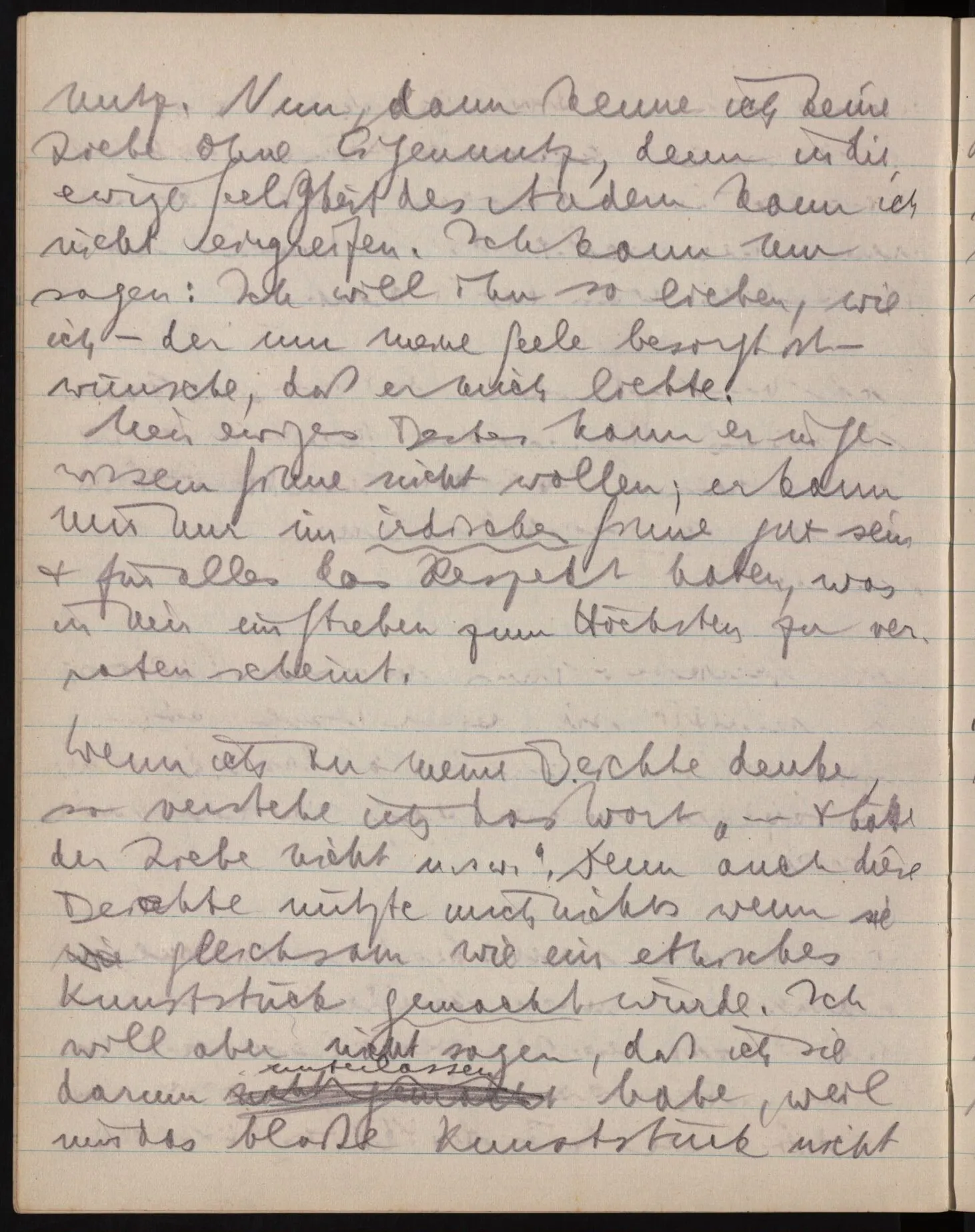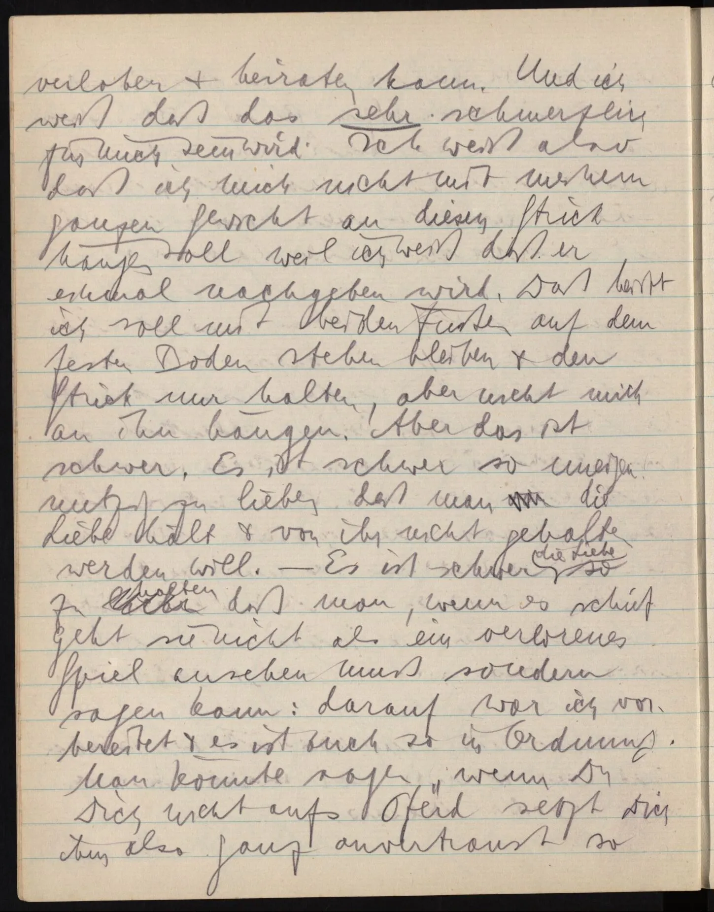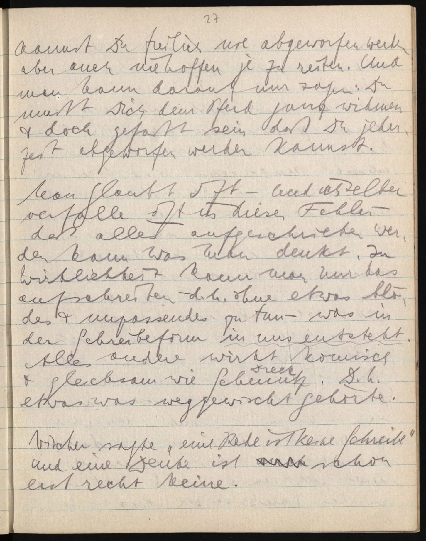 09.05.1930 Ich bin sehr verliebt in die Respinger freilich schon seit langem aber jetzt besonders stark. Dabei weiß ich aber daß die Sache aller Wahrscheinlichkeit nach hoffnungslos ist. D.h. ich muß gefaßt sein, daß sie jeden Moment sich verloben & heiraten kann. Und ich weiß daß das sehr schmerzlich für mich sein wird. Ich weiß also daß ich mich nicht mit meinem ganzen Gewicht an diesen Strick hängen soll weil ich weiß daß er einmal nachgeben wird. Das heißt ich soll mit beiden Füßen auf dem festen Boden stehen bleiben & den Strick nur halten, aber nicht mich an ihn hängen. Aber das ist schwer. Es ist schwer so uneigennützig zu lieben daß man die Liebe hält & von ihr nicht gehalten werden will. – Es ist schwer die Liebe so zu halten daß man, wenn es schief geht sie nicht als ein verlorenes Spiel ansehen muß sondern sagen kann: darauf war ich vorbereitet & es ist auch so in Ordnung. Man könnte sagen „wenn Du Dich nicht aufs Pferd setzt Dich ihm also ganz anvertraust so kannst Du freilich nie abgeworfen werden aber auch nie hoffen je zu reiten.” Und man kann darauf nur sagen: Du mußt Dich dem Pferd ganz widmen & doch gefaßt sein daß Du jederzeit abgeworfen werden kannst.