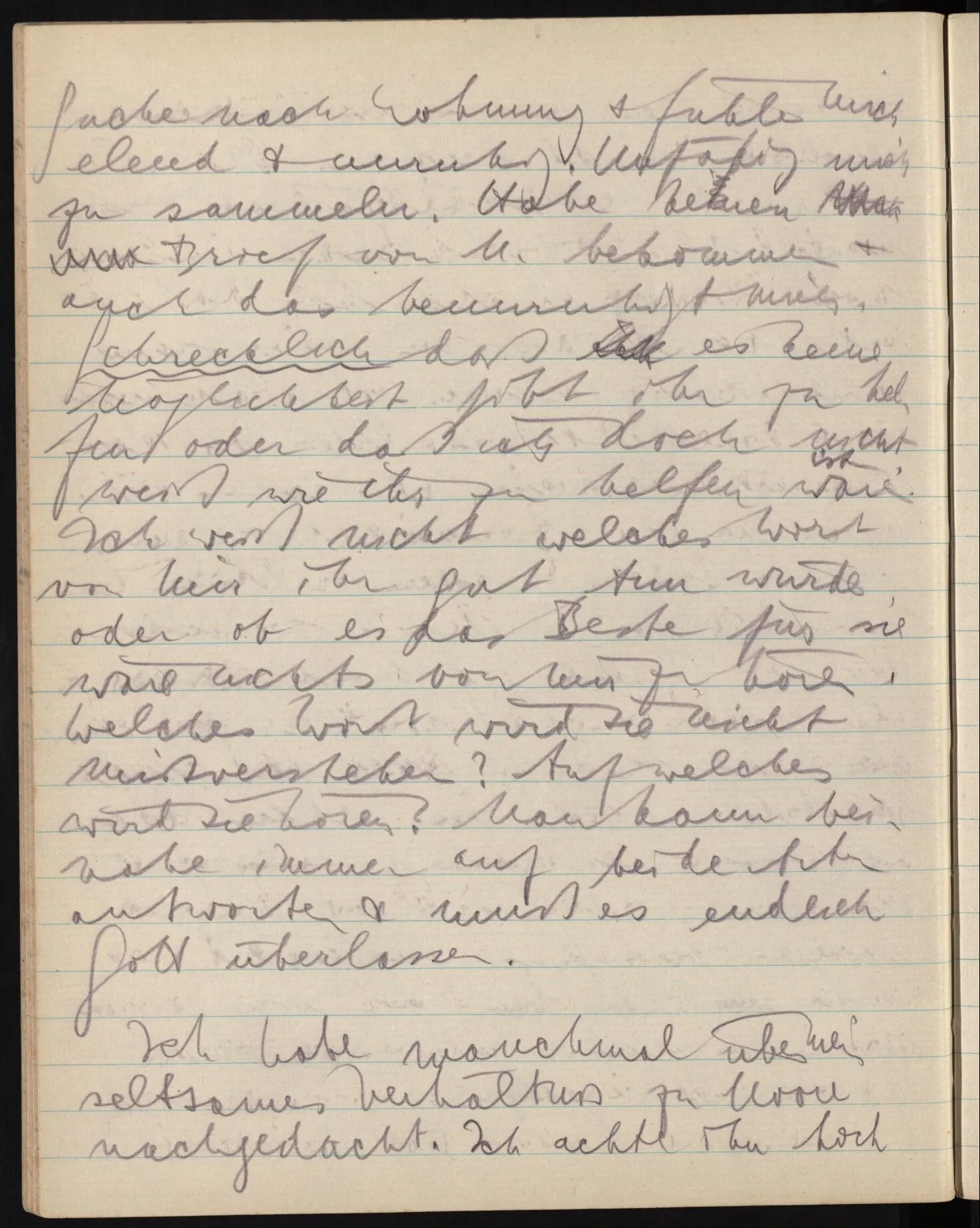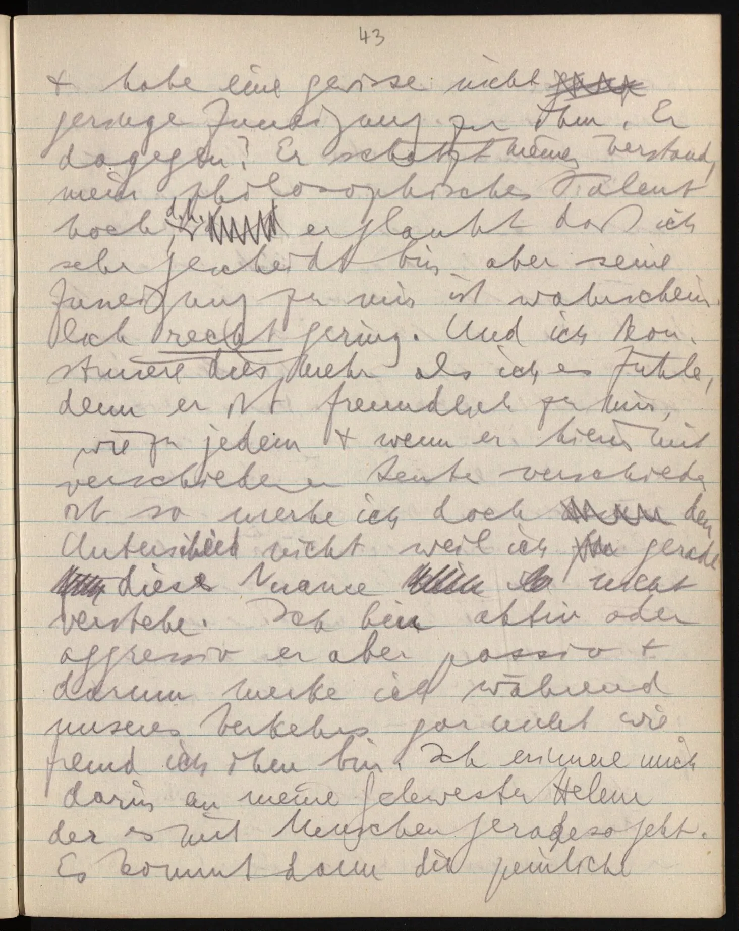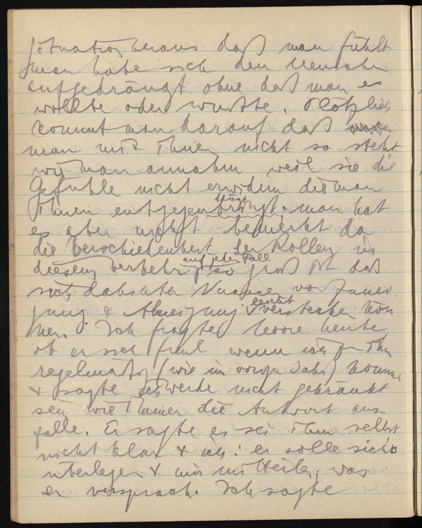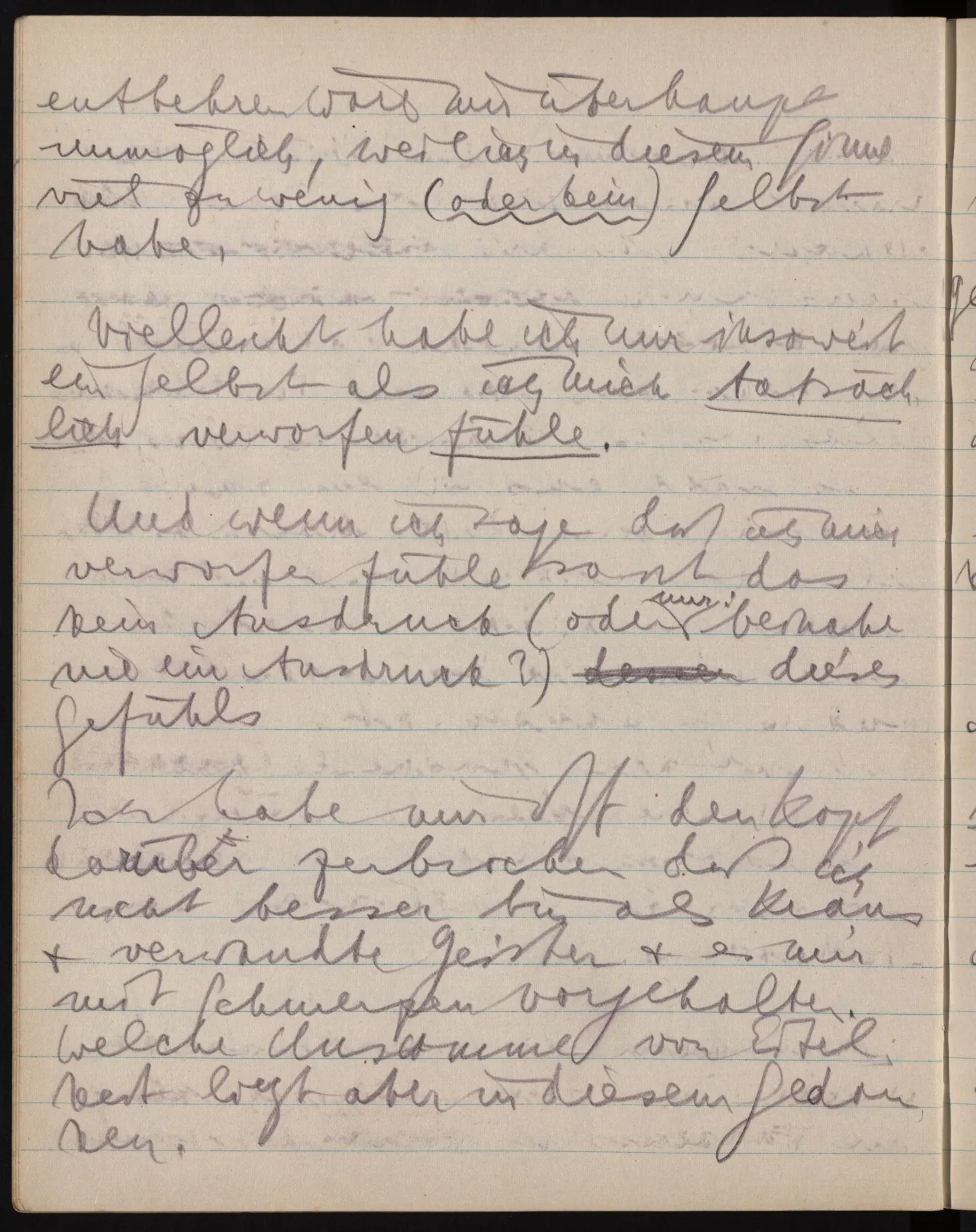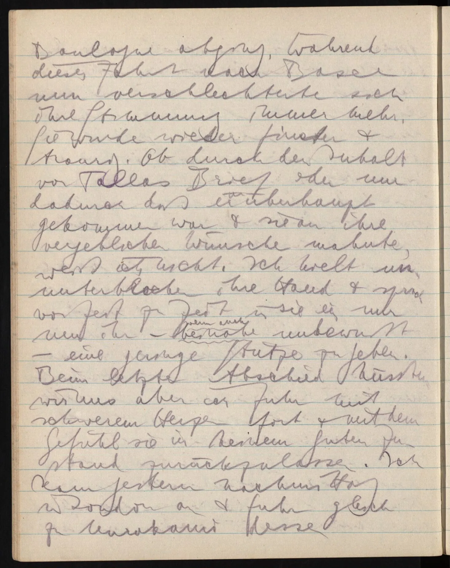 09.05.1930 Ich bin sehr verliebt in die Respinger freilich schon seit langem aber jetzt besonders stark. Dabei weiß ich aber daß die Sache aller Wahrscheinlichkeit nach hoffnungslos ist. D.h. ich muß gefaßt sein, daß sie jeden Moment sich verloben & heiraten kann. Und ich weiß daß das sehr schmerzlich für mich sein wird. Ich weiß also daß ich mich nicht mit meinem ganzen Gewicht an diesen Strick hängen soll weil ich weiß daß er einmal nachgeben wird. Das heißt ich soll mit beiden Füßen auf dem festen Boden stehen bleiben & den Strick nur halten, aber nicht mich an ihn hängen. Aber das ist schwer. Es ist schwer so uneigennützig zu lieben daß man die Liebe hält & von ihr nicht gehalten werden will. – Es ist schwer die Liebe so zu halten daß man, wenn es schief geht sie nicht als ein verlorenes Spiel ansehen muß sondern sagen kann: darauf war ich vorbereitet & es ist auch so in Ordnung. Man könnte sagen „wenn Du Dich nicht aufs Pferd setzt Dich ihm also ganz anvertraust so kannst Du freilich nie abgeworfen werden aber auch nie hoffen je zu reiten.” Und man kann darauf nur sagen: Du mußt Dich dem Pferd ganz widmen & doch gefaßt sein daß Du jederzeit abgeworfen werden kannst.