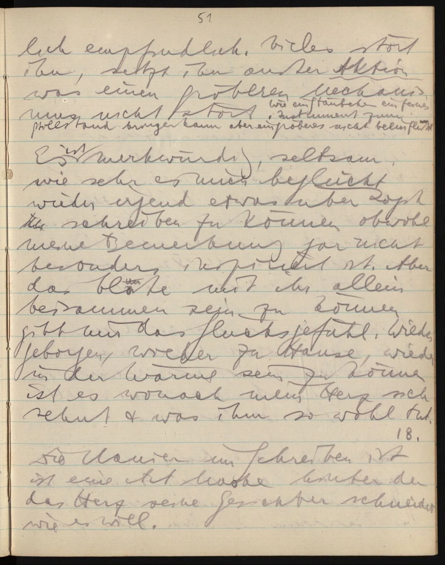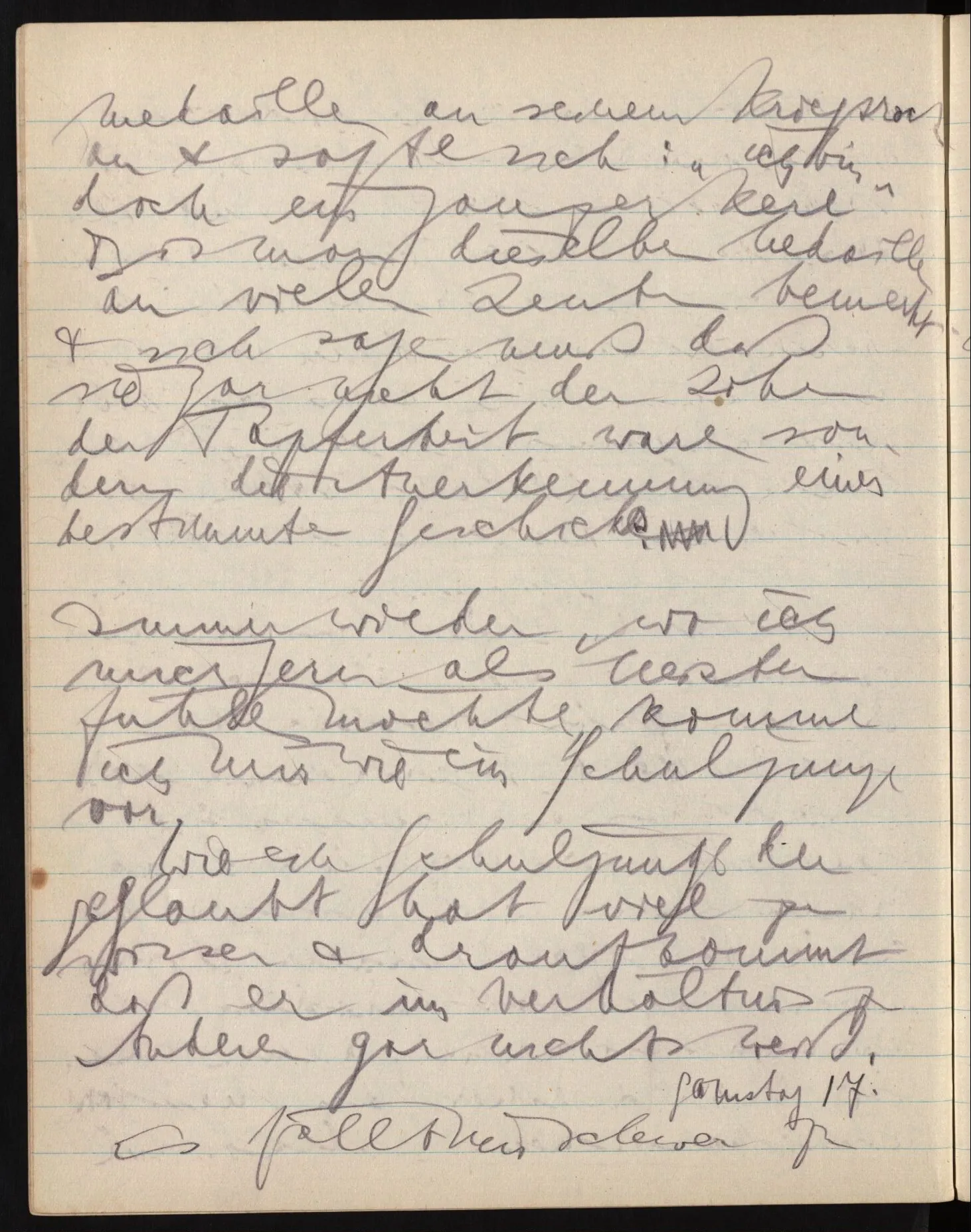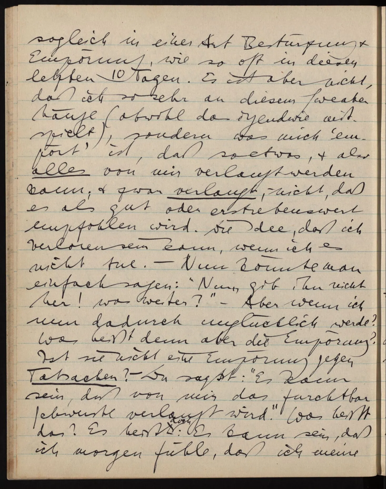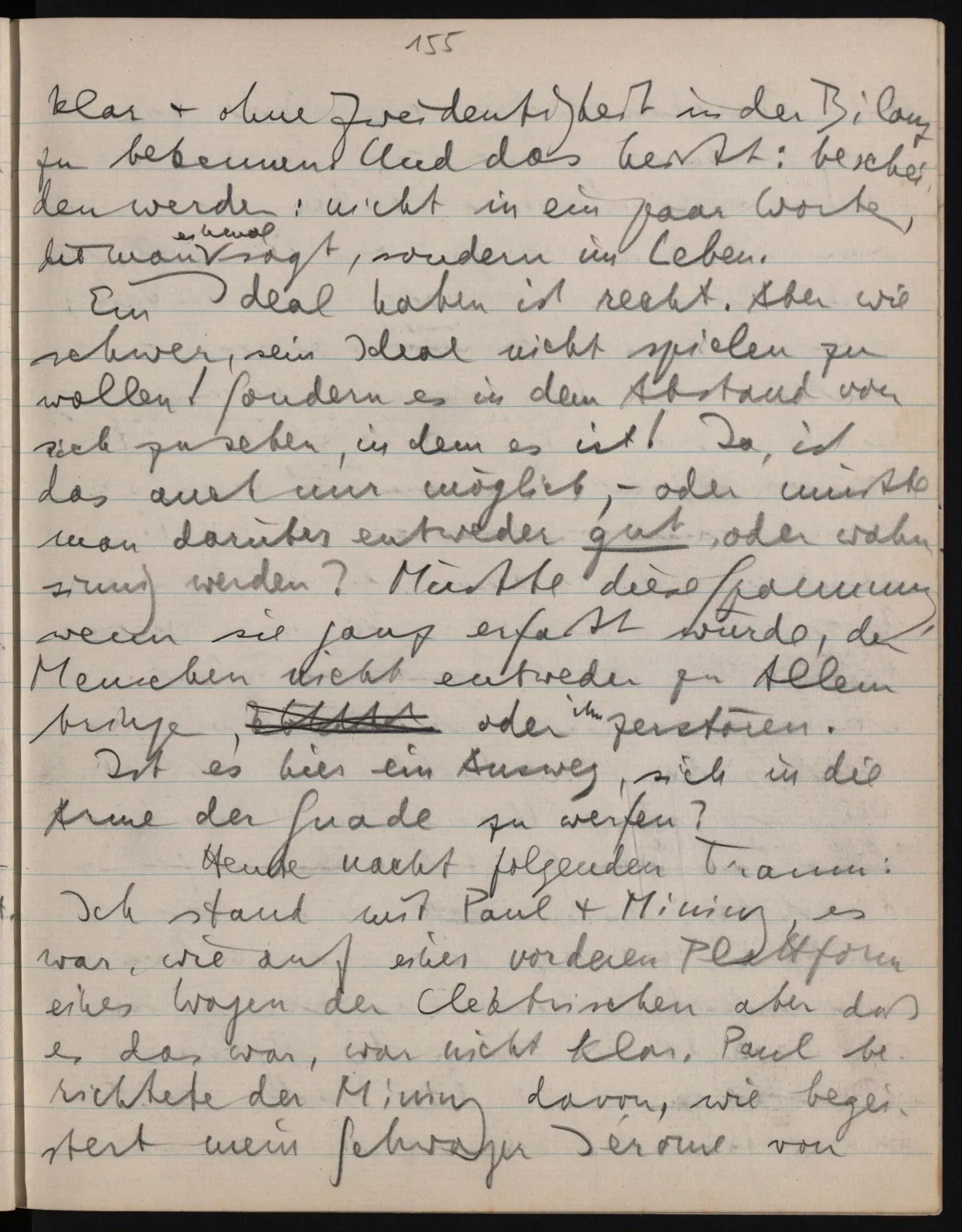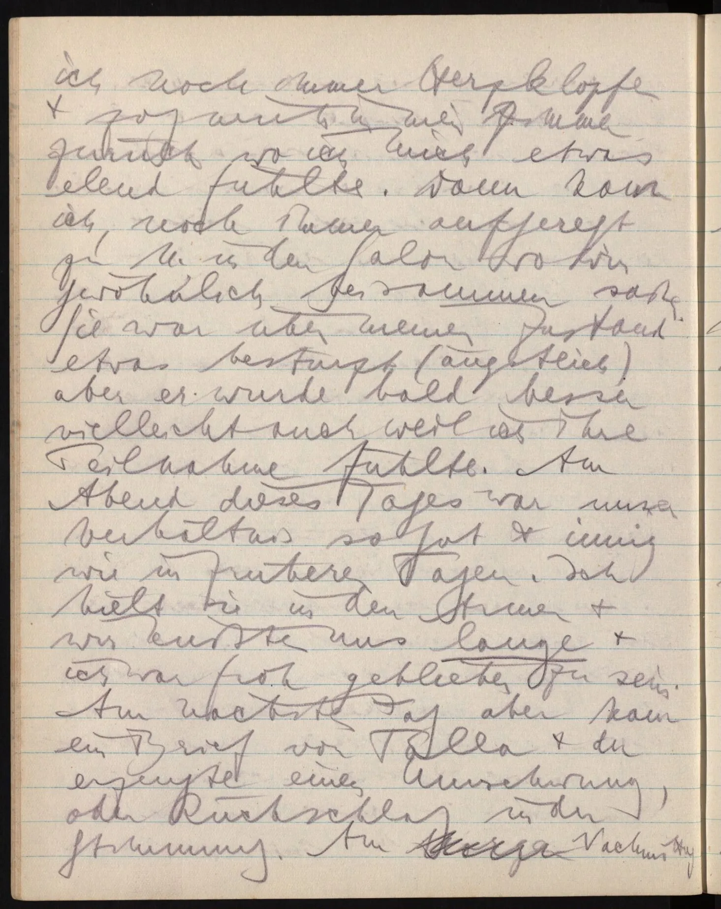 09.05.1930 Ich bin sehr verliebt in die Respinger freilich schon seit langem aber jetzt besonders stark. Dabei weiß ich aber daß die Sache aller Wahrscheinlichkeit nach hoffnungslos ist. D.h. ich muß gefaßt sein, daß sie jeden Moment sich verloben & heiraten kann. Und ich weiß daß das sehr schmerzlich für mich sein wird. Ich weiß also daß ich mich nicht mit meinem ganzen Gewicht an diesen Strick hängen soll weil ich weiß daß er einmal nachgeben wird. Das heißt ich soll mit beiden Füßen auf dem festen Boden stehen bleiben & den Strick nur halten, aber nicht mich an ihn hängen. Aber das ist schwer. Es ist schwer so uneigennützig zu lieben daß man die Liebe hält & von ihr nicht gehalten werden will. – Es ist schwer die Liebe so zu halten daß man, wenn es schief geht sie nicht als ein verlorenes Spiel ansehen muß sondern sagen kann: darauf war ich vorbereitet & es ist auch so in Ordnung. Man könnte sagen „wenn Du Dich nicht aufs Pferd setzt Dich ihm also ganz anvertraust so kannst Du freilich nie abgeworfen werden aber auch nie hoffen je zu reiten.” Und man kann darauf nur sagen: Du mußt Dich dem Pferd ganz widmen & doch gefaßt sein daß Du jederzeit abgeworfen werden kannst.