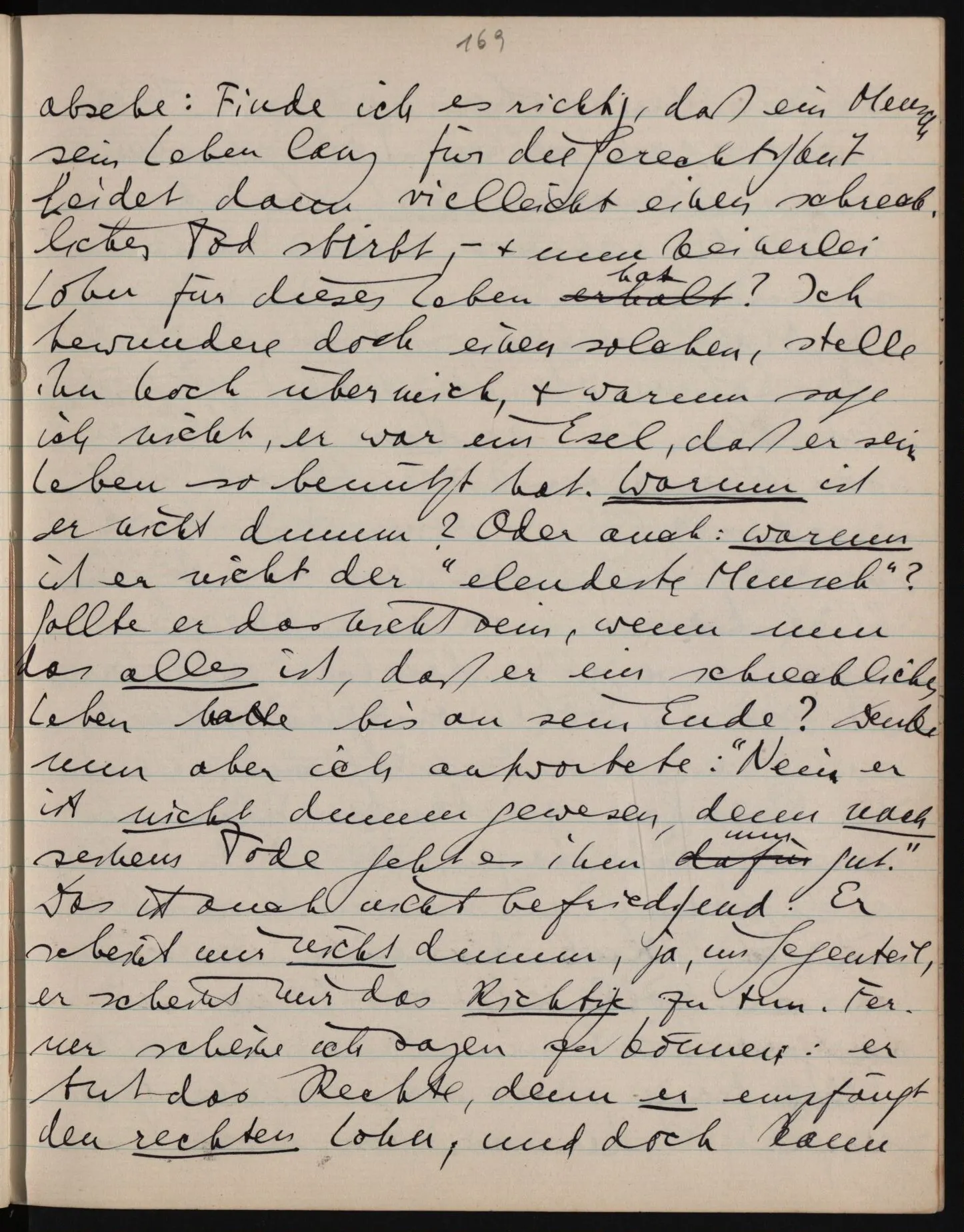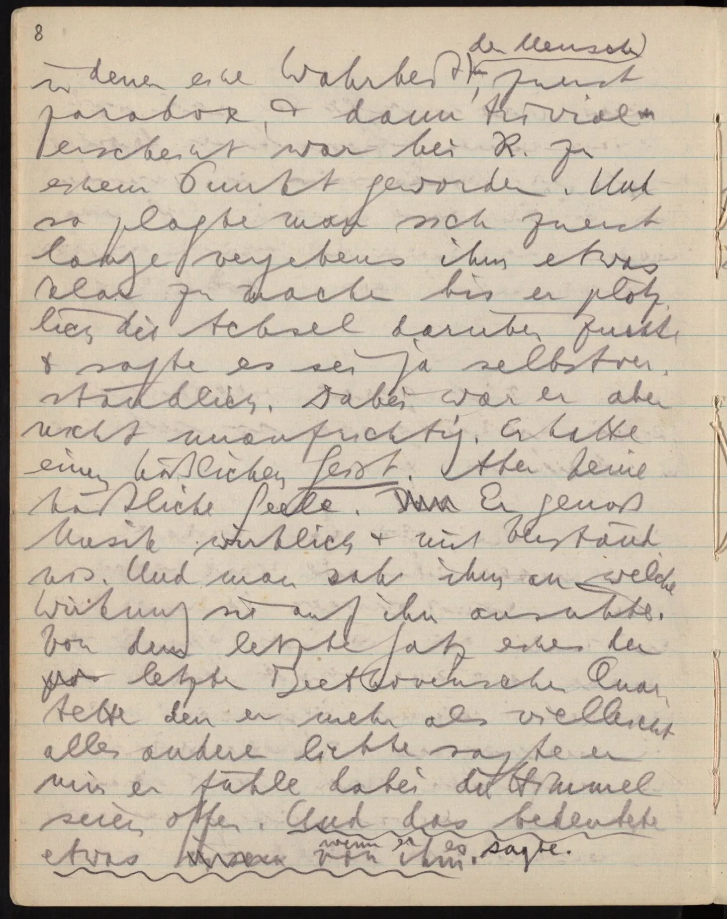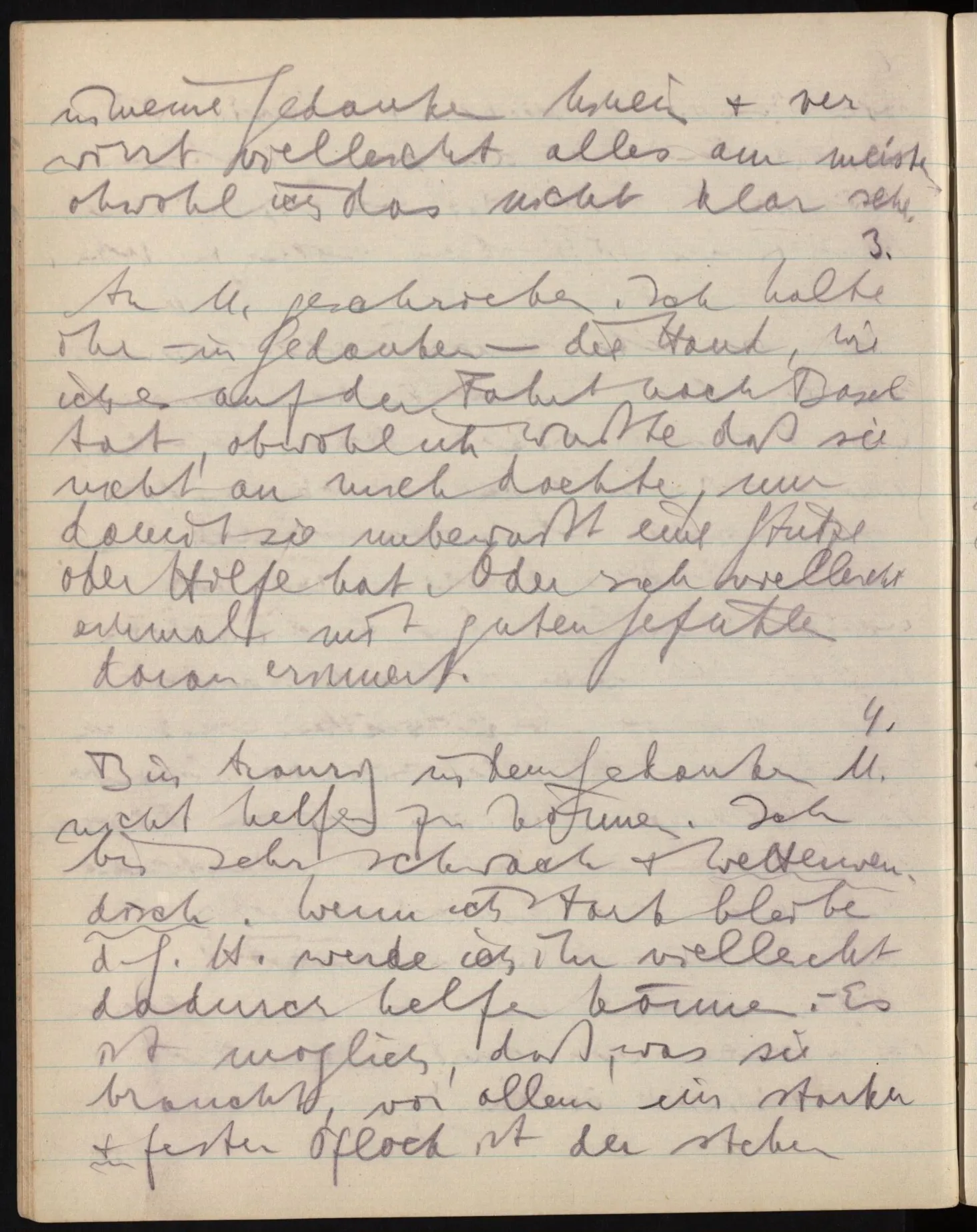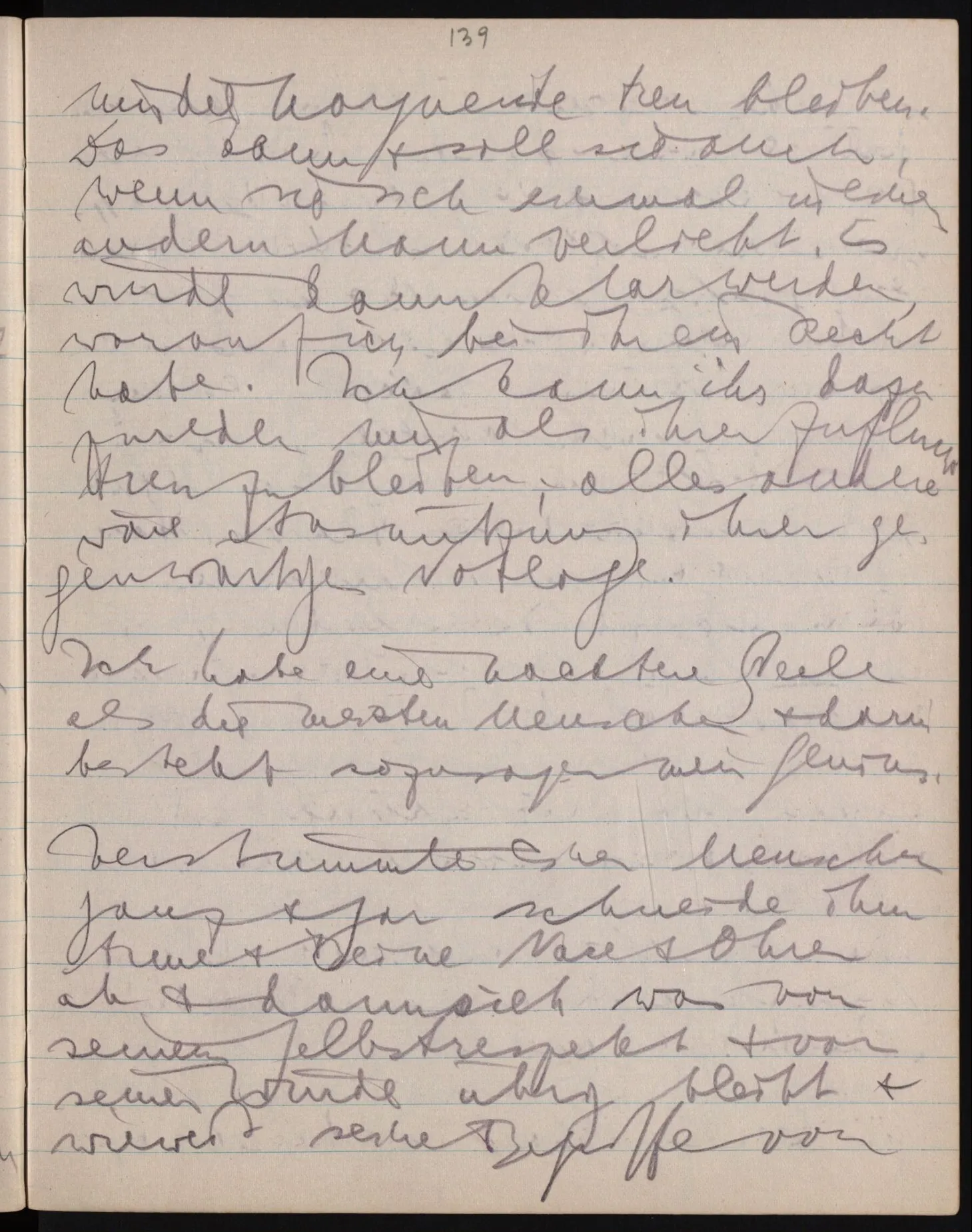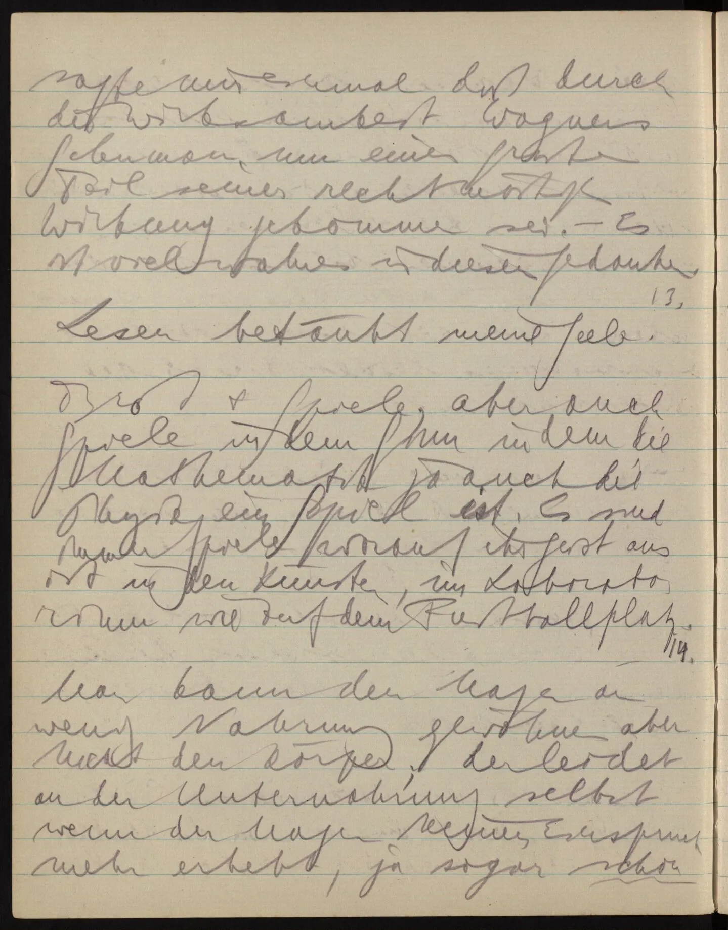 09.05.1930 Ich bin sehr verliebt in die Respinger freilich schon seit langem aber jetzt besonders stark. Dabei weiß ich aber daß die Sache aller Wahrscheinlichkeit nach hoffnungslos ist. D.h. ich muß gefaßt sein, daß sie jeden Moment sich verloben & heiraten kann. Und ich weiß daß das sehr schmerzlich für mich sein wird. Ich weiß also daß ich mich nicht mit meinem ganzen Gewicht an diesen Strick hängen soll weil ich weiß daß er einmal nachgeben wird. Das heißt ich soll mit beiden Füßen auf dem festen Boden stehen bleiben & den Strick nur halten, aber nicht mich an ihn hängen. Aber das ist schwer. Es ist schwer so uneigennützig zu lieben daß man die Liebe hält & von ihr nicht gehalten werden will. – Es ist schwer die Liebe so zu halten daß man, wenn es schief geht sie nicht als ein verlorenes Spiel ansehen muß sondern sagen kann: darauf war ich vorbereitet & es ist auch so in Ordnung. Man könnte sagen „wenn Du Dich nicht aufs Pferd setzt Dich ihm also ganz anvertraust so kannst Du freilich nie abgeworfen werden aber auch nie hoffen je zu reiten.” Und man kann darauf nur sagen: Du mußt Dich dem Pferd ganz widmen & doch gefaßt sein daß Du jederzeit abgeworfen werden kannst.