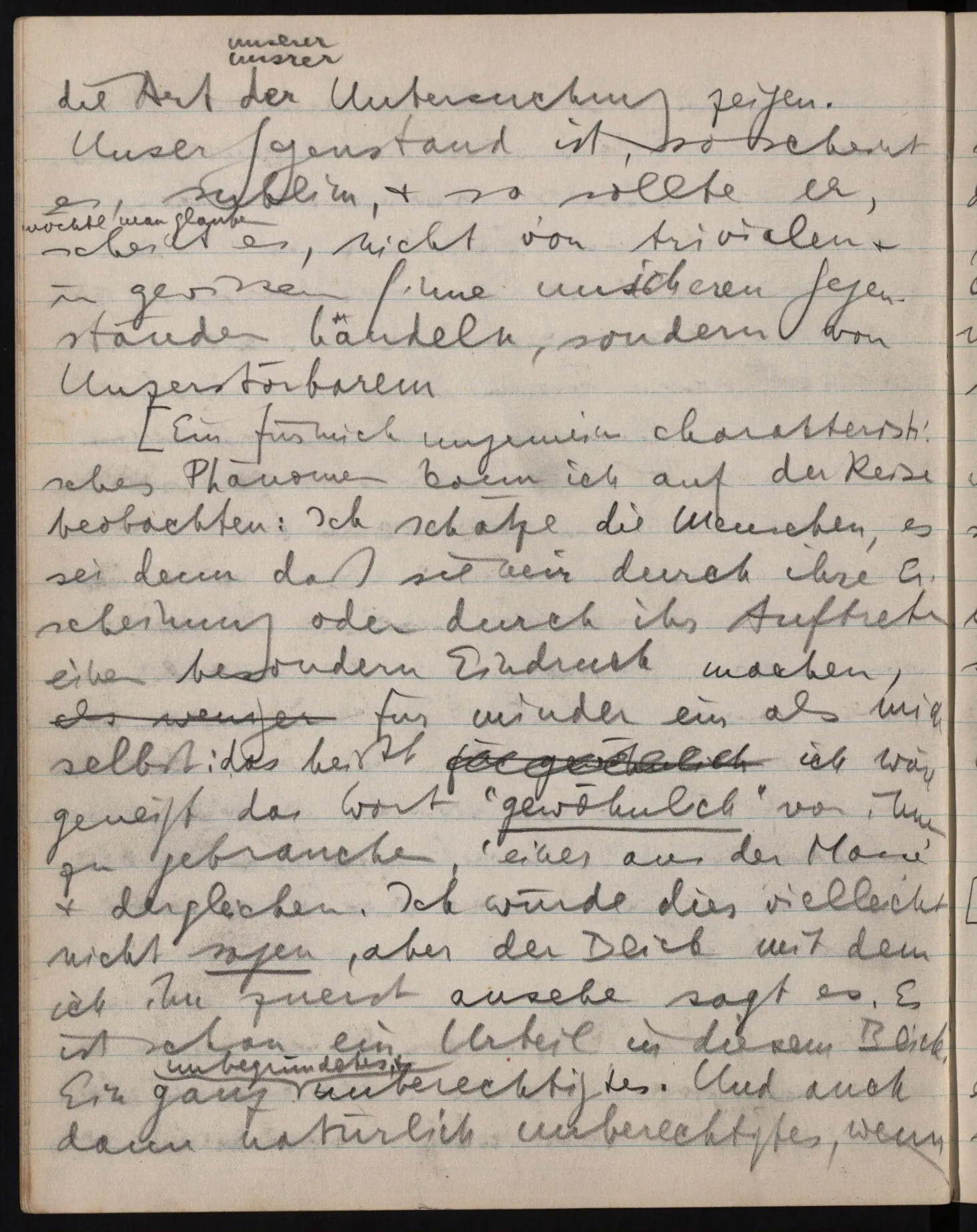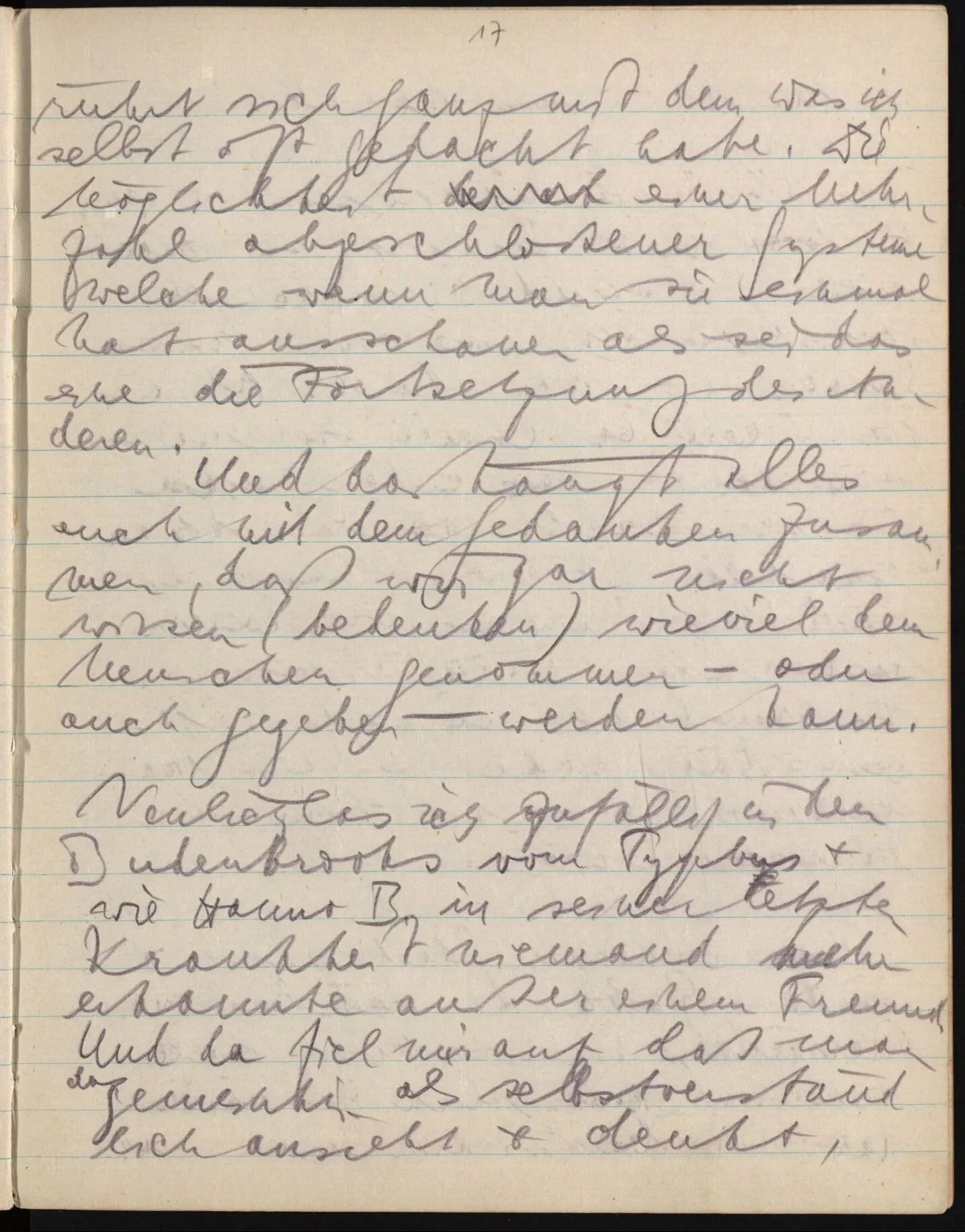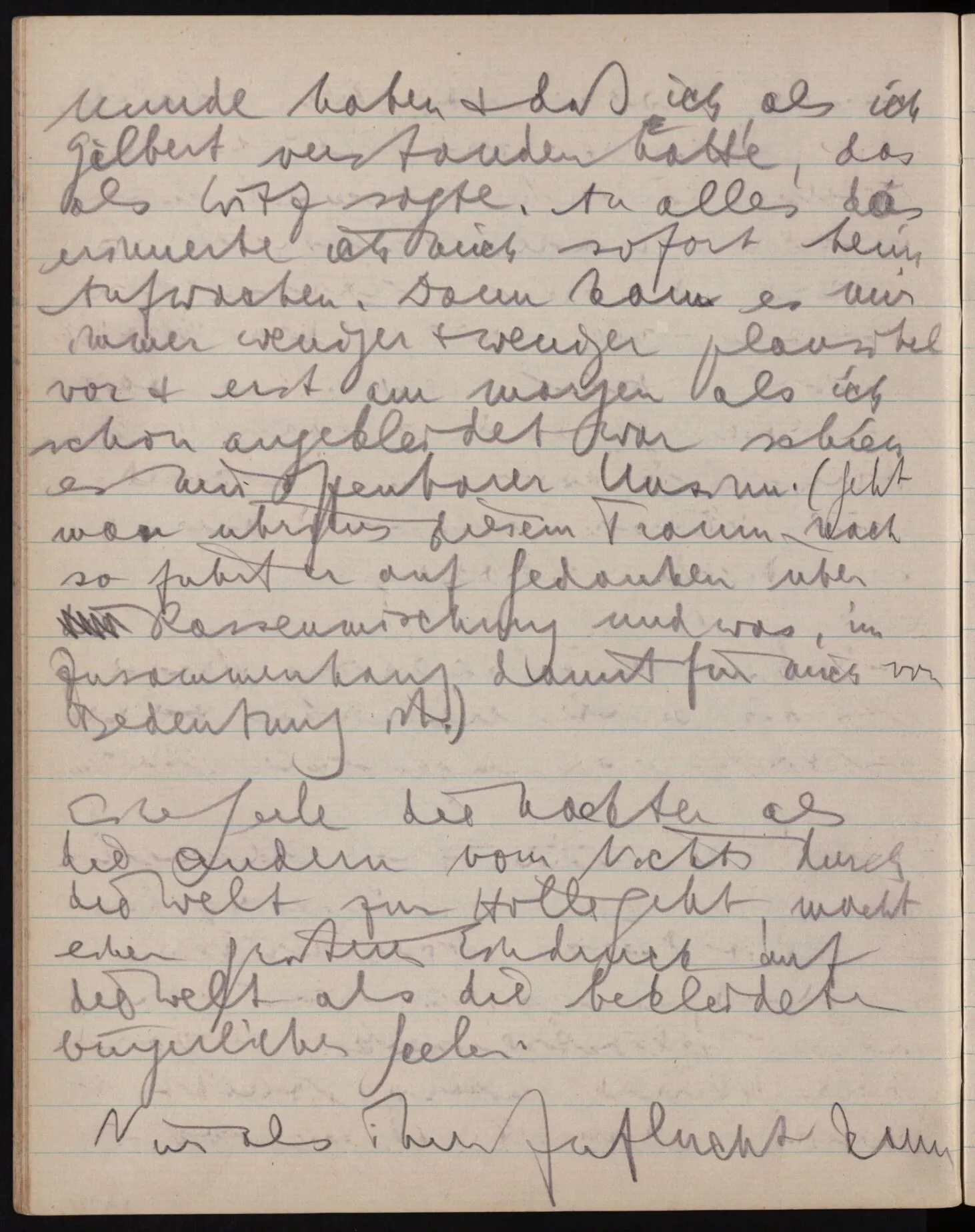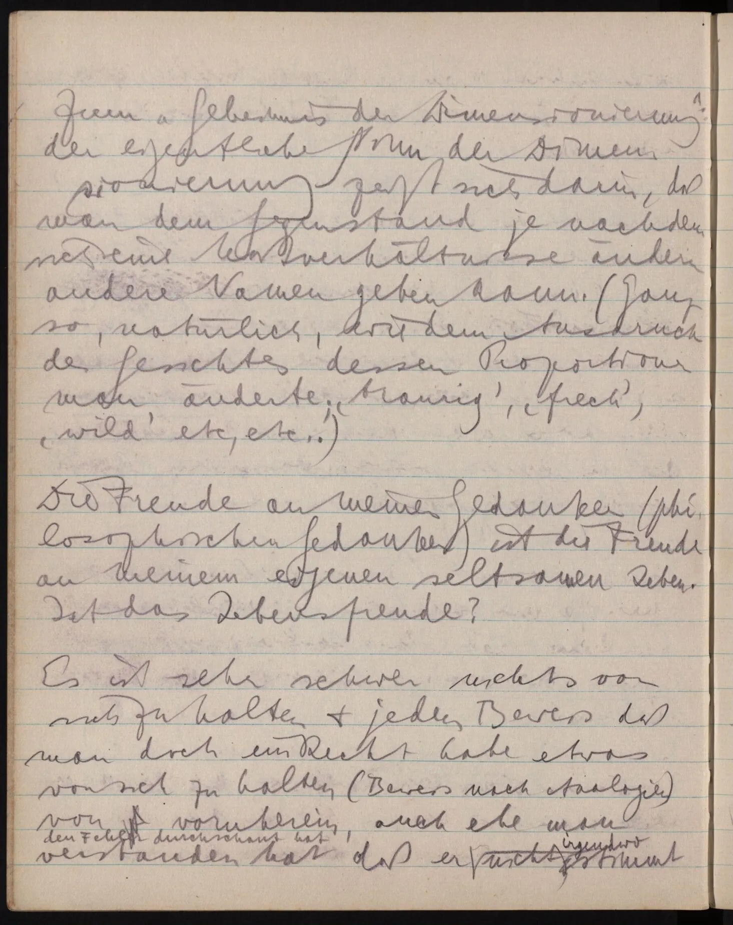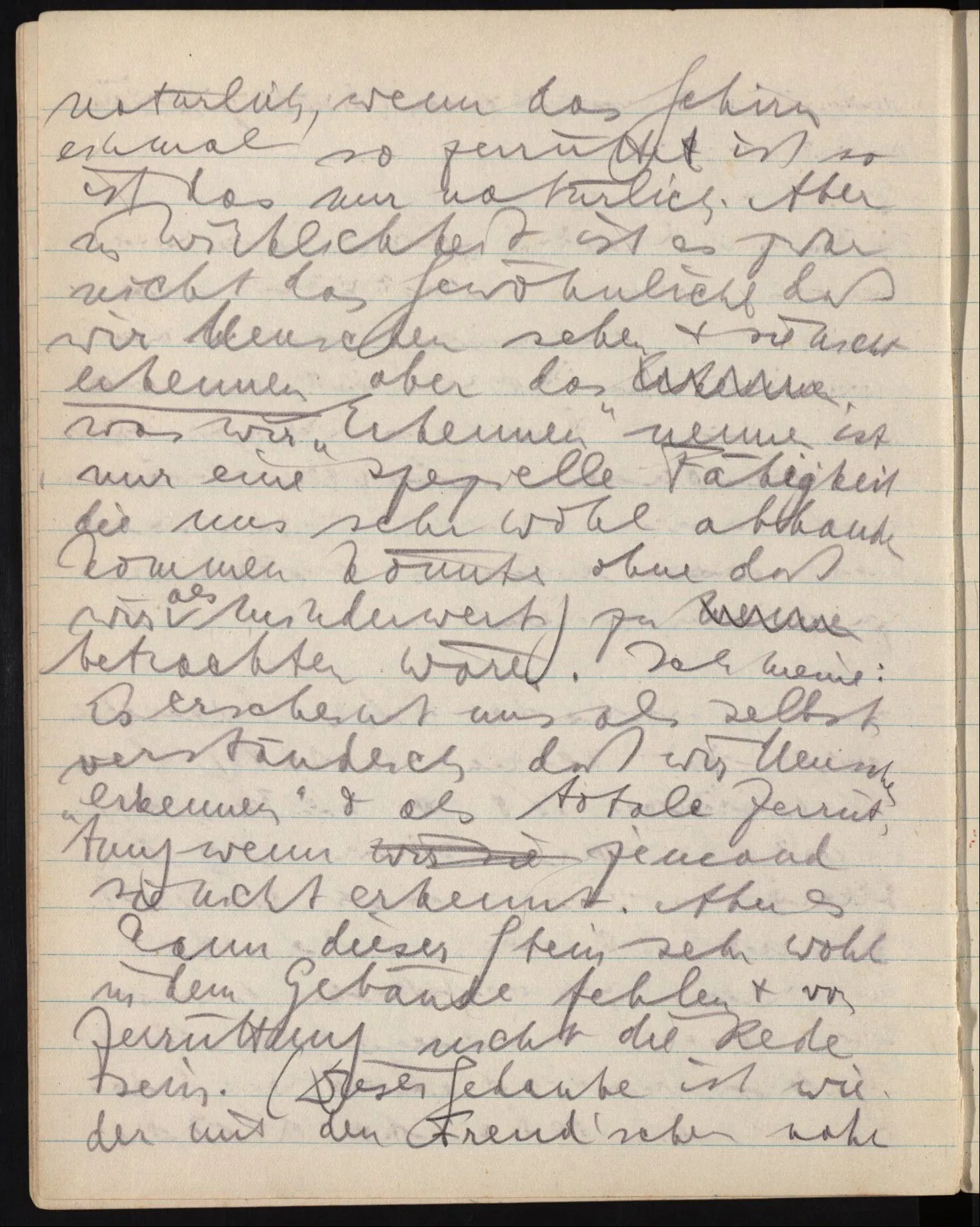 Neulich las ich zufällig in den Buddenbrooks vom Typhus & wie Hanno B. in seiner letzten Krankheit niemand mehr erkannte außer einem Freund. Und da fiel mir auf daß man das gemeinhin als selbstverständlich ansieht & denkt, natürlich, wenn das Gehirn einmal so zerrüttet ist so ist das nur natürlich. Aber in Wirklichkeit ist es zwar nicht das Gewöhnliche daß wir Menschen sehen & sie nicht erkennen aber das was wir „Erkennen” nennen ist nur eine spezielle Fähigkeit die uns sehr wohl abhanden kommen könnte ohne daß wir als minderwertig zu betrachten wären. Ich meine: Es erscheint mir als selbstverständlich daß wir Menschen „erkennen” & als totale Zerrüttung wenn jemand sie nicht erkennt. Aber es kann dieser Stein sehr wohl in dem Gebäude fehlen & von Zerrüttung nicht die Rede sein. (Dieser Gedanke ist wieder mit den Freud’schen nahe verwandt, mit dem, über die Fehlleistungen.)