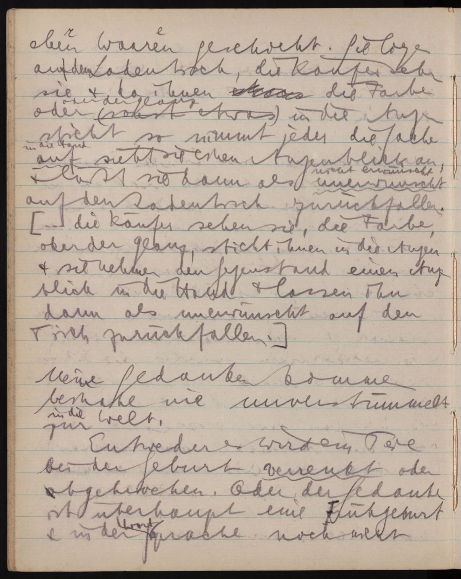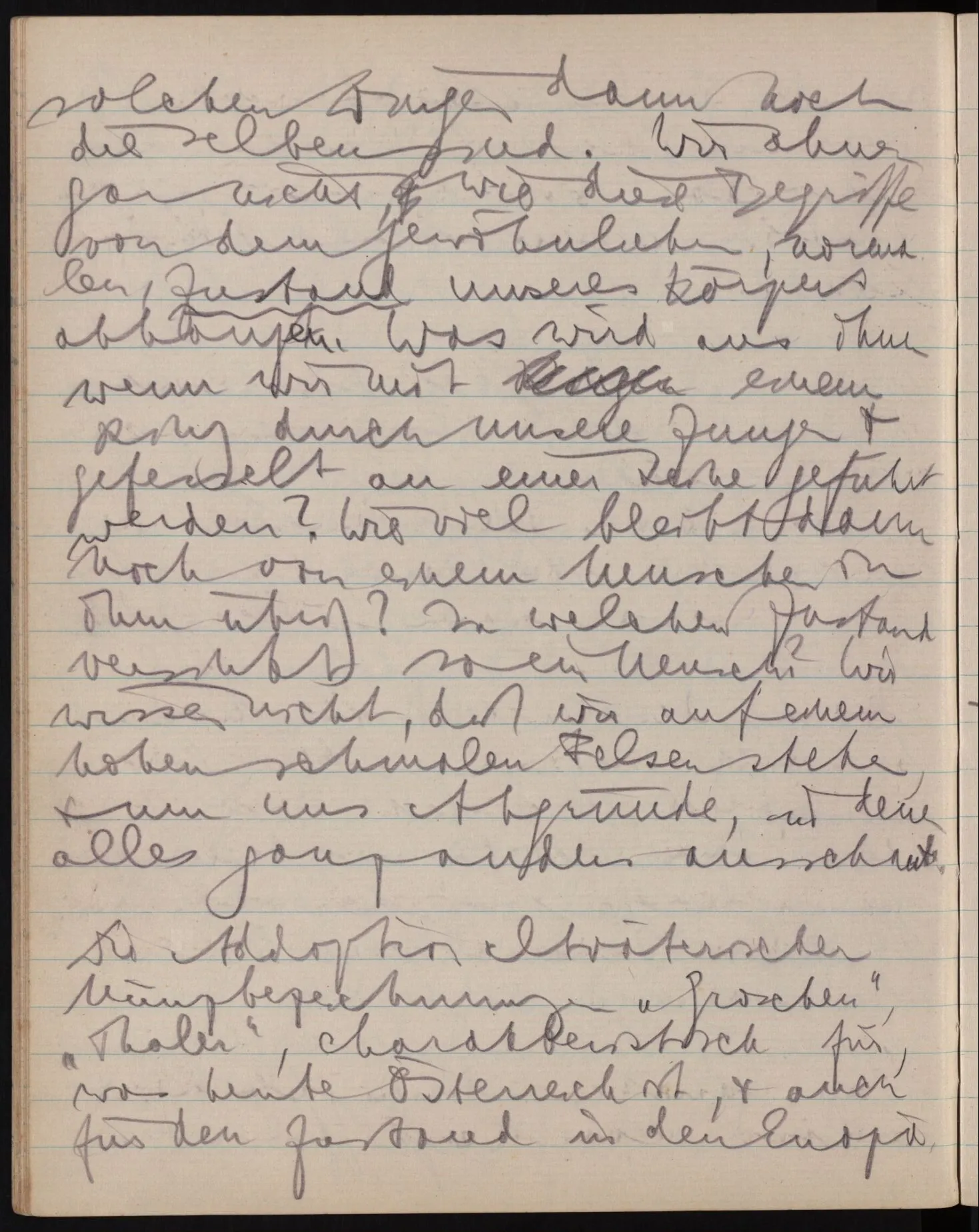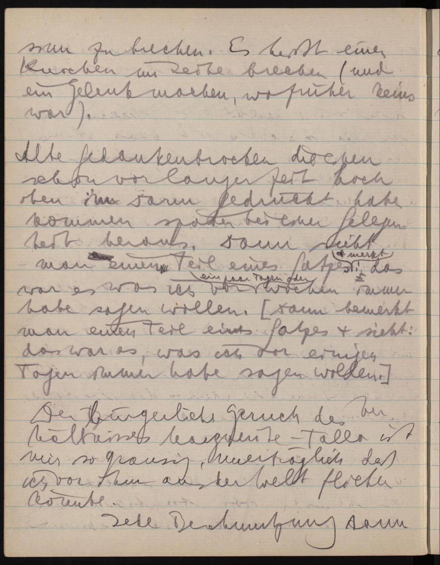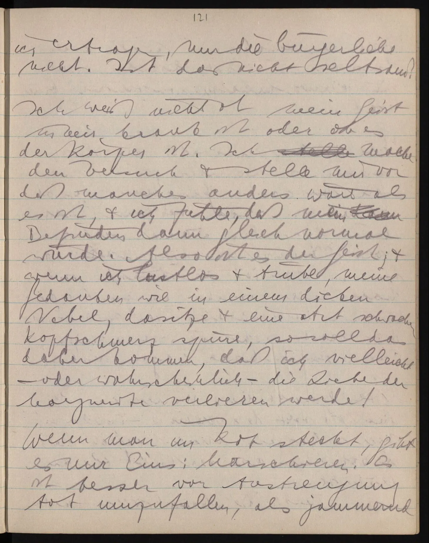 Neulich las ich zufällig in den Buddenbrooks vom Typhus & wie Hanno B. in seiner letzten Krankheit niemand mehr erkannte außer einem Freund. Und da fiel mir auf daß man das gemeinhin als selbstverständlich ansieht & denkt, natürlich, wenn das Gehirn einmal so zerrüttet ist so ist das nur natürlich. Aber in Wirklichkeit ist es zwar nicht das Gewöhnliche daß wir Menschen sehen & sie nicht erkennen aber das was wir „Erkennen” nennen ist nur eine spezielle Fähigkeit die uns sehr wohl abhanden kommen könnte ohne daß wir als minderwertig zu betrachten wären. Ich meine: Es erscheint mir als selbstverständlich daß wir Menschen „erkennen” & als totale Zerrüttung wenn jemand sie nicht erkennt. Aber es kann dieser Stein sehr wohl in dem Gebäude fehlen & von Zerrüttung nicht die Rede sein. (Dieser Gedanke ist wieder mit den Freud’schen nahe verwandt, mit dem, über die Fehlleistungen.)